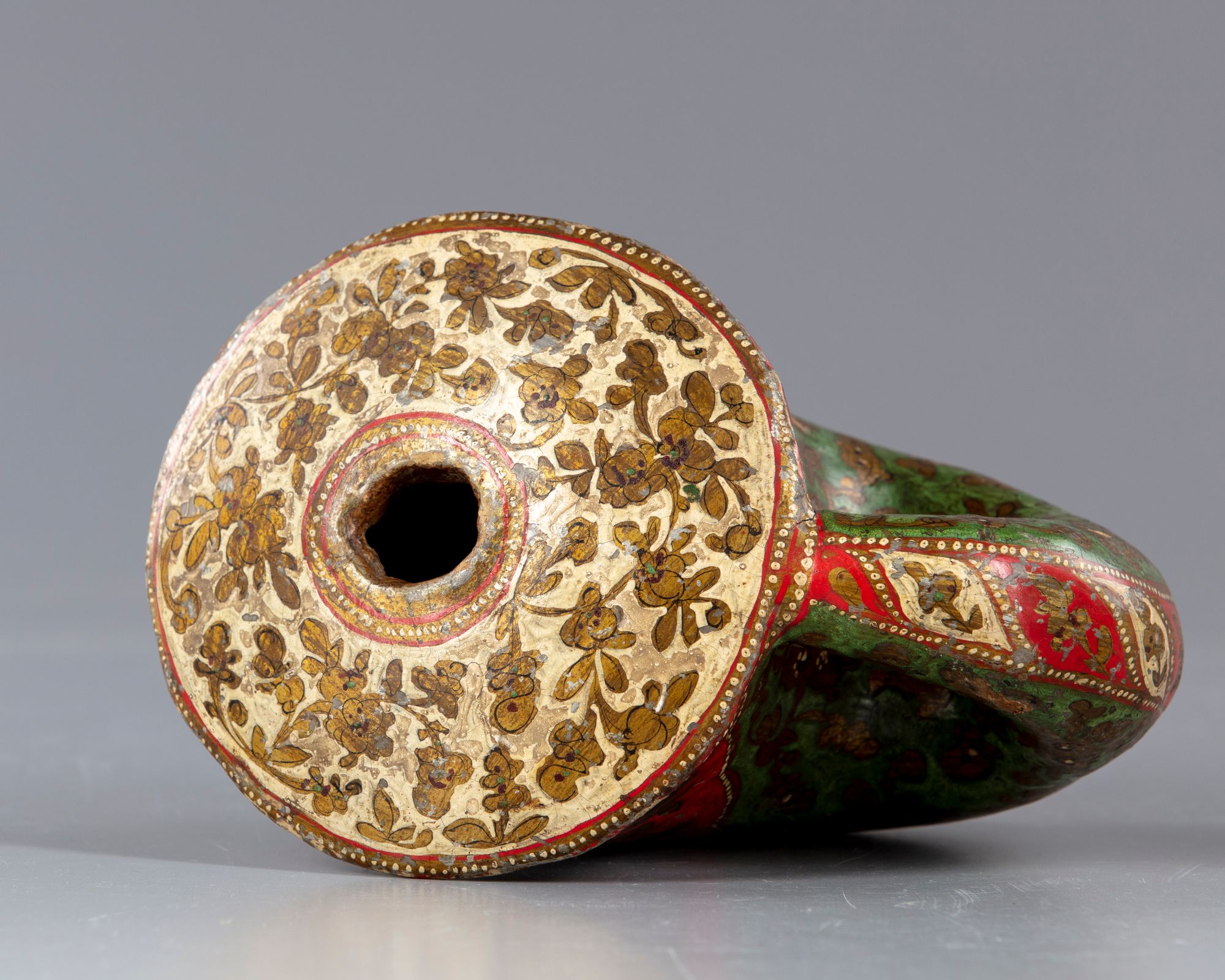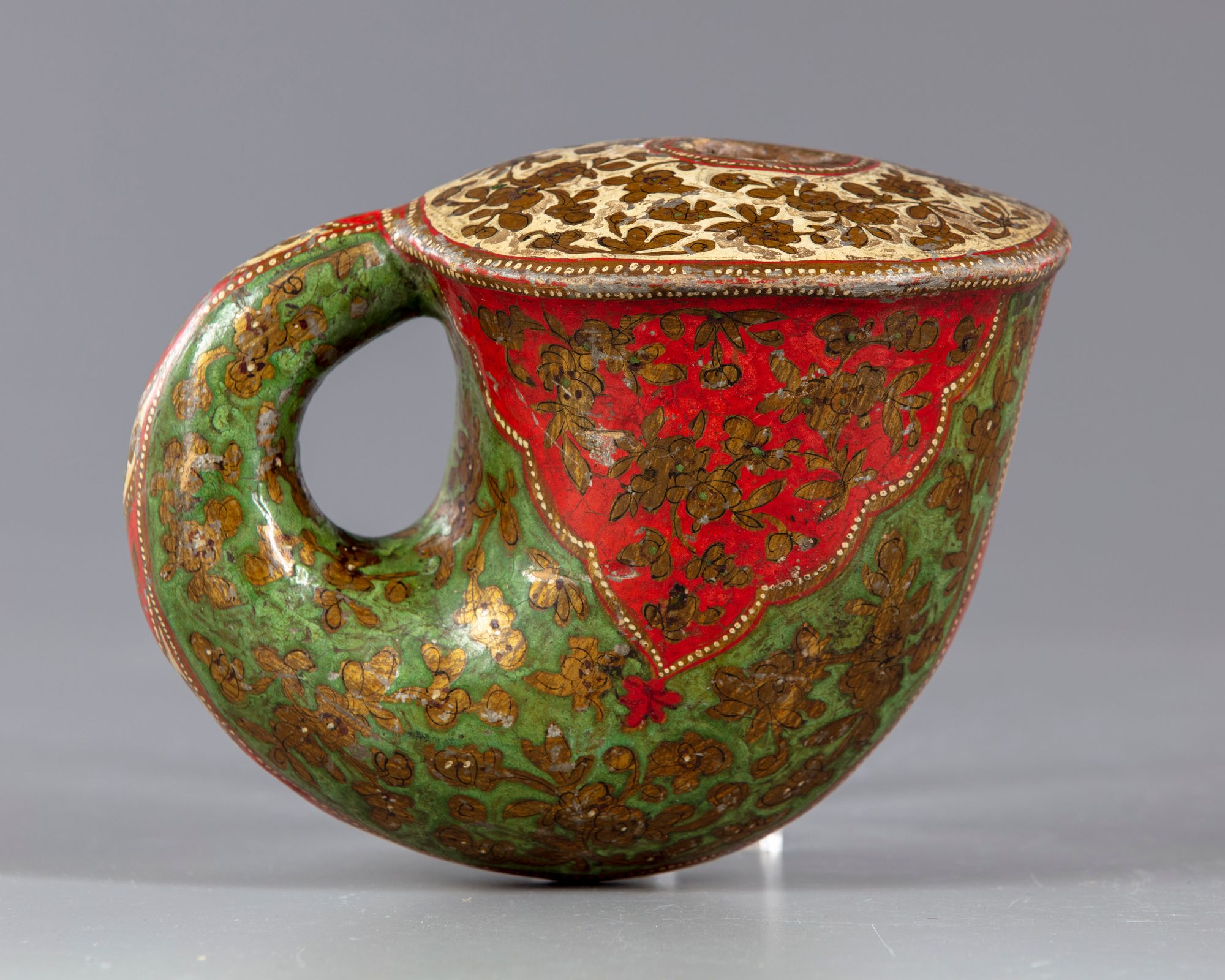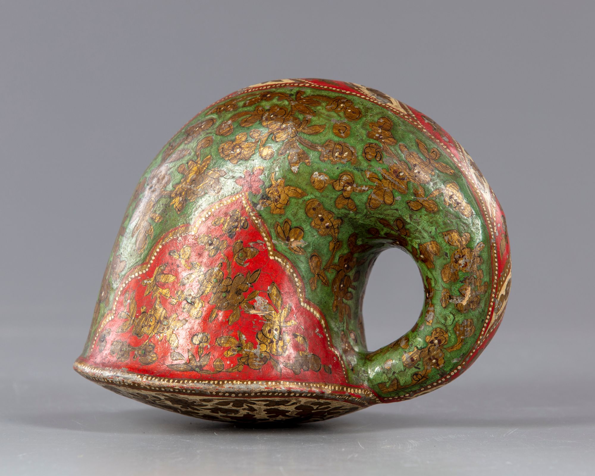 Designed to hold gunpowder, this flask, shaped like a nautilus shell, is made of wood, covered with a marbled pattern of blue and black lacquer, and bordered by delicate floral designs in gold.