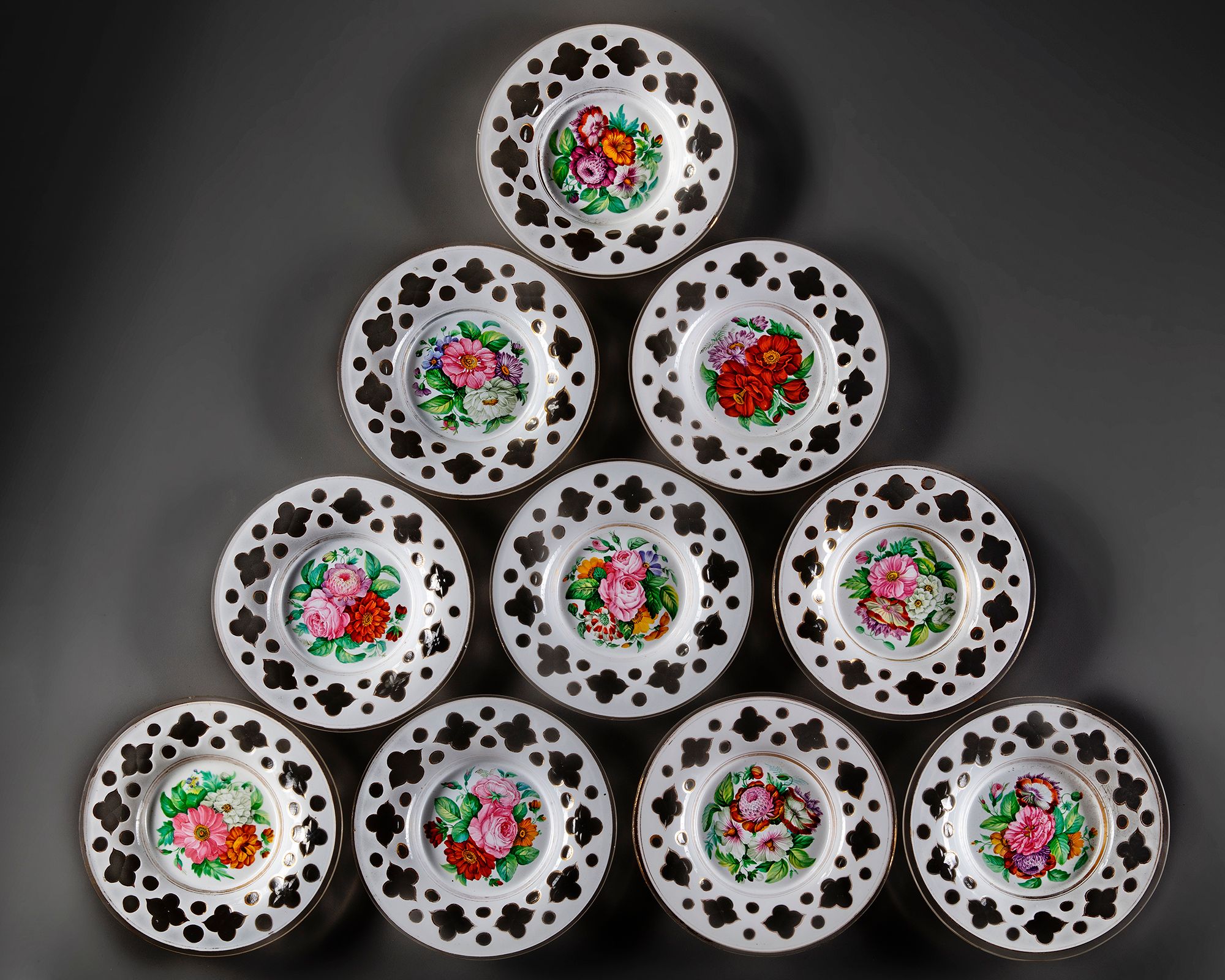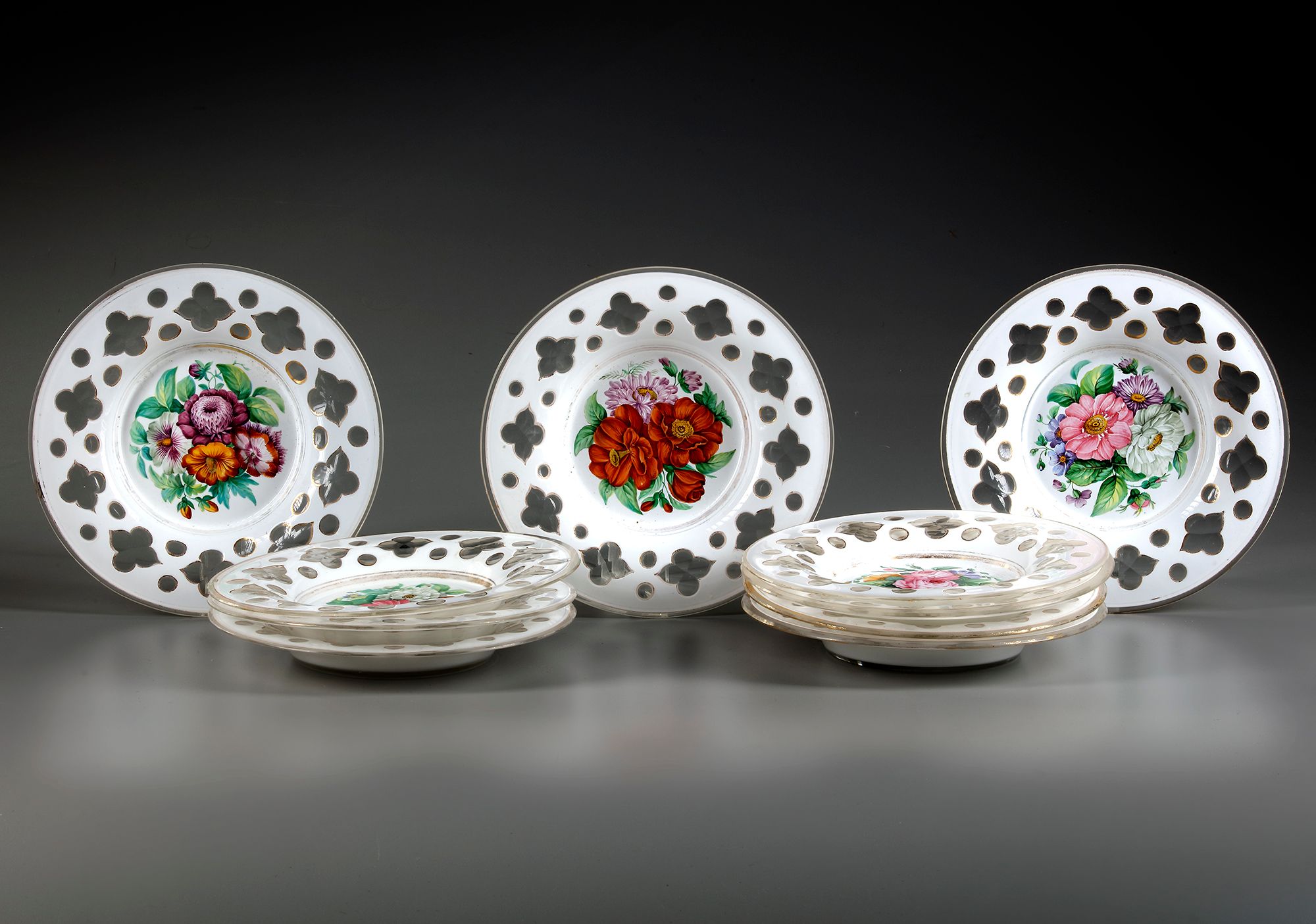 Set of 10 opaline plates with floral decor. Diam. 20 cm. In a perfect condition.