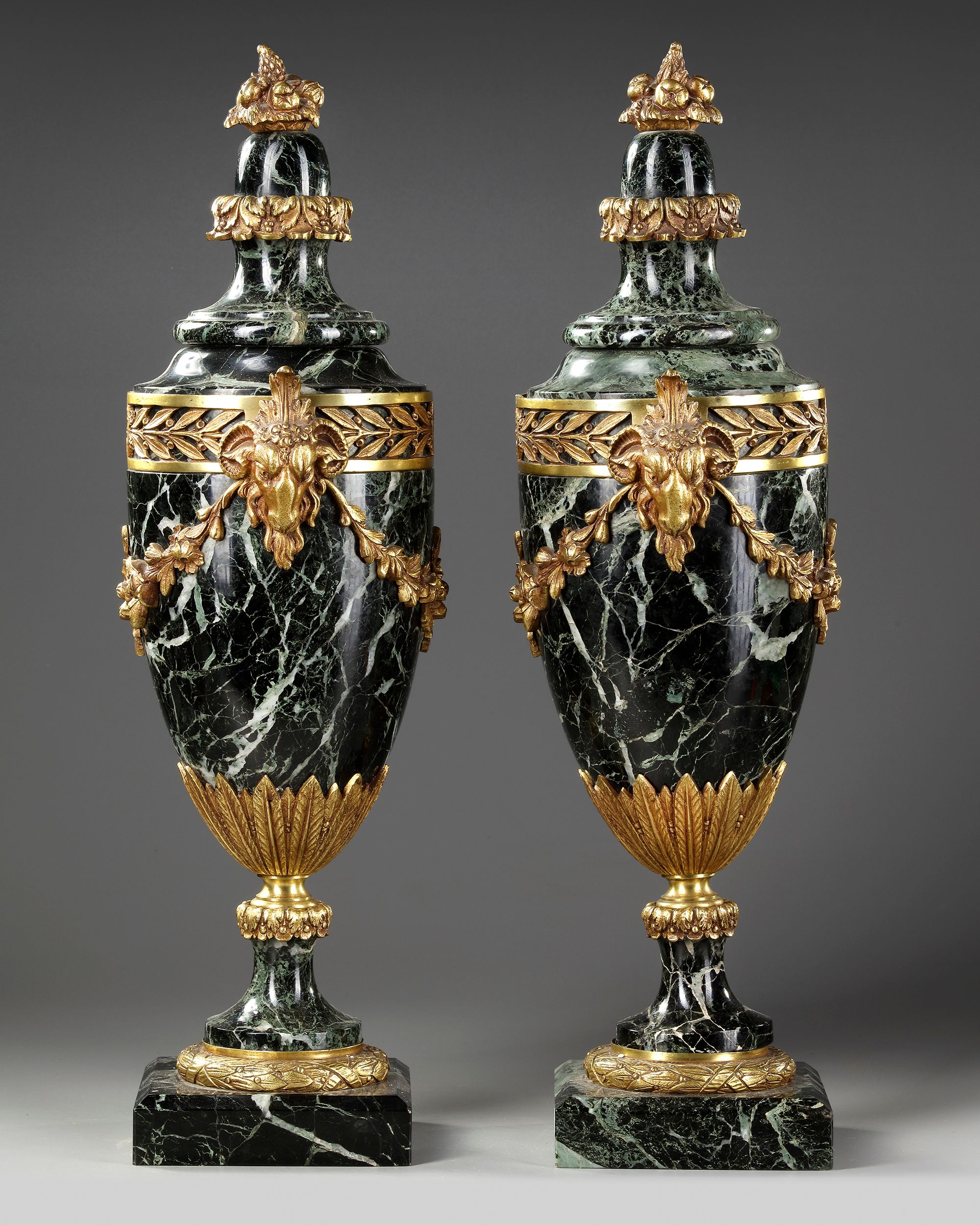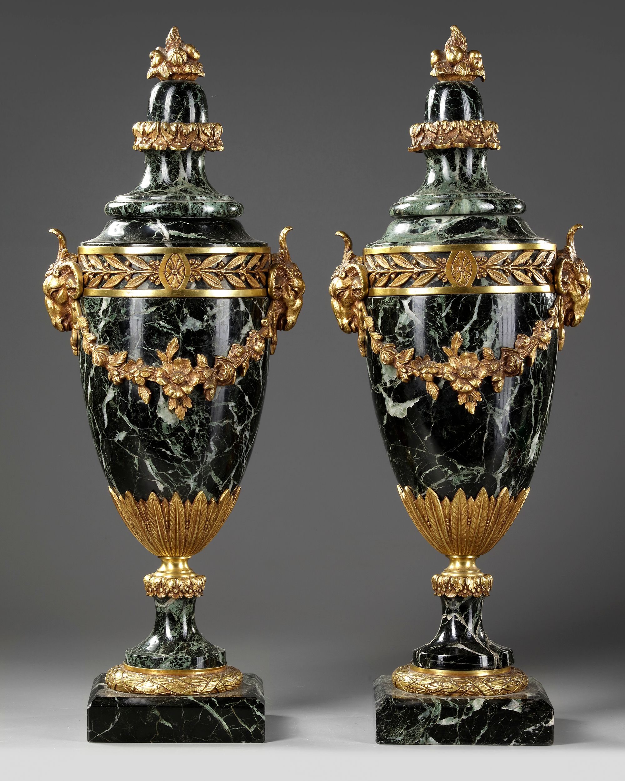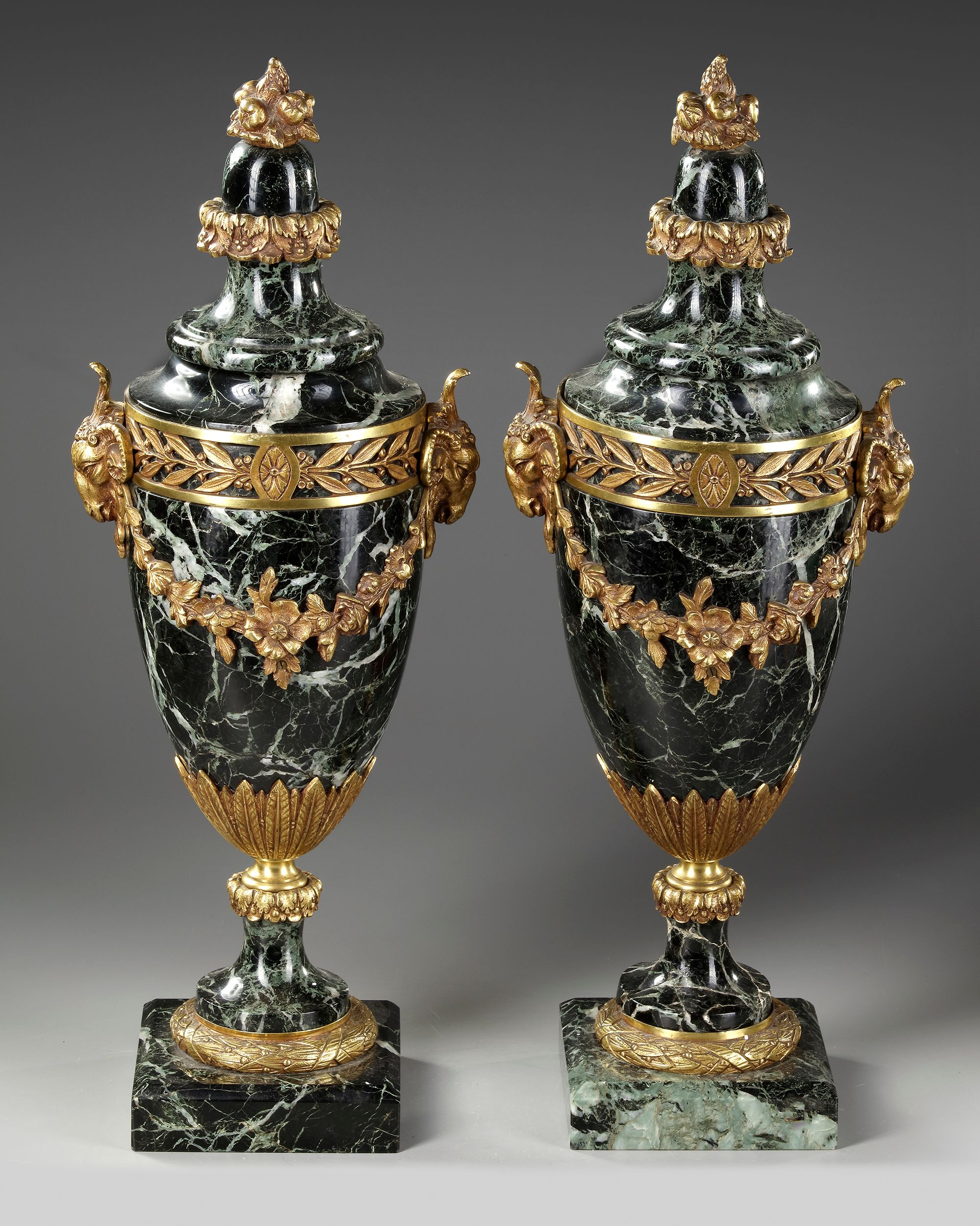 Pair of sea green marble and gilded and chased bronze cassolettes, handles decorated with ram heads, pedestal surrounded by a row of a frieze of foliage.