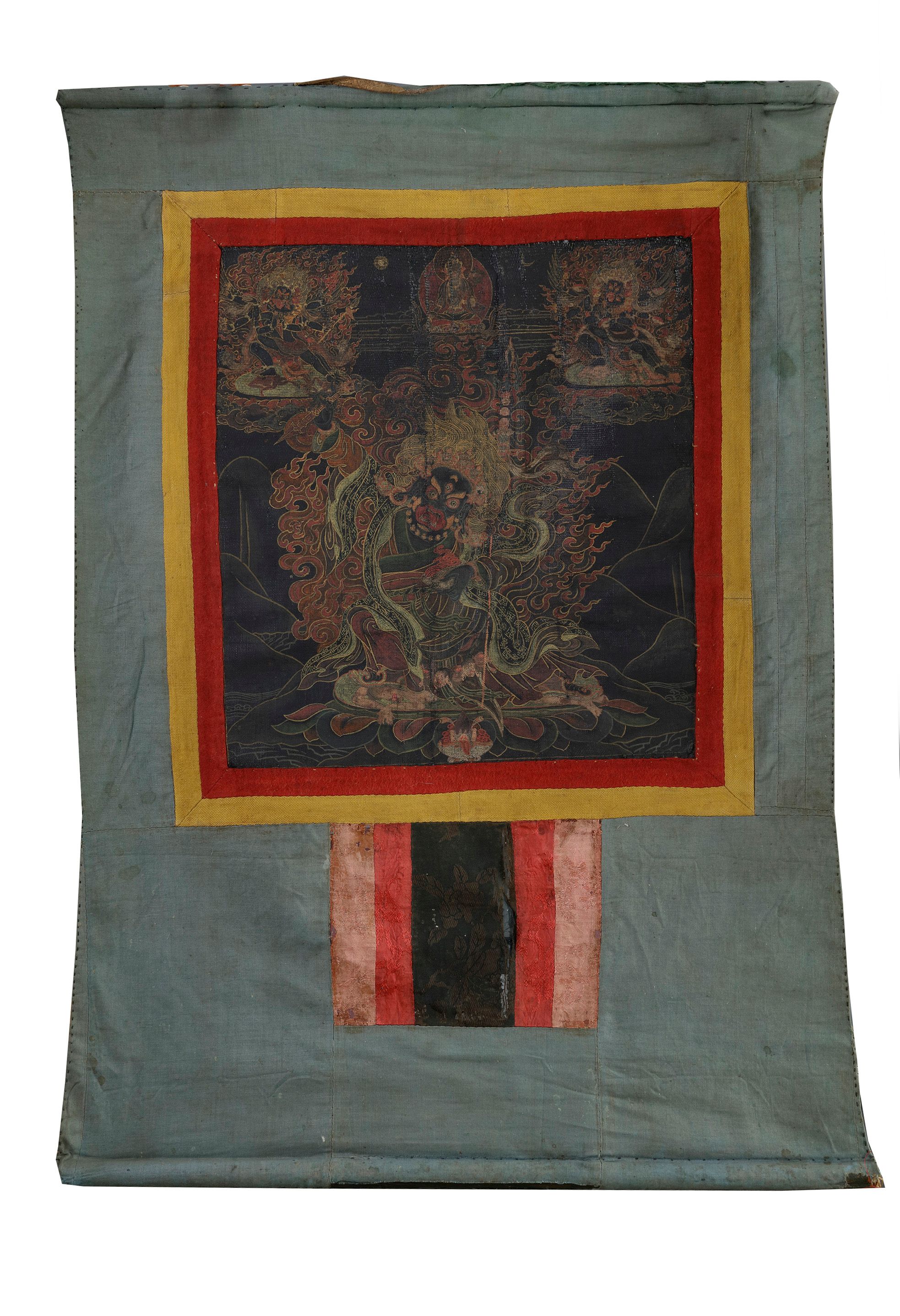 The black-ground thangka depicts the wrathful manifestation of Padmasambhava, holding a phurba in his right hand and cradling the khatvanga in his left arm while holding a skull cup in his left hand. He is accompanied by three further deities above. With textile and brocade mounts.
