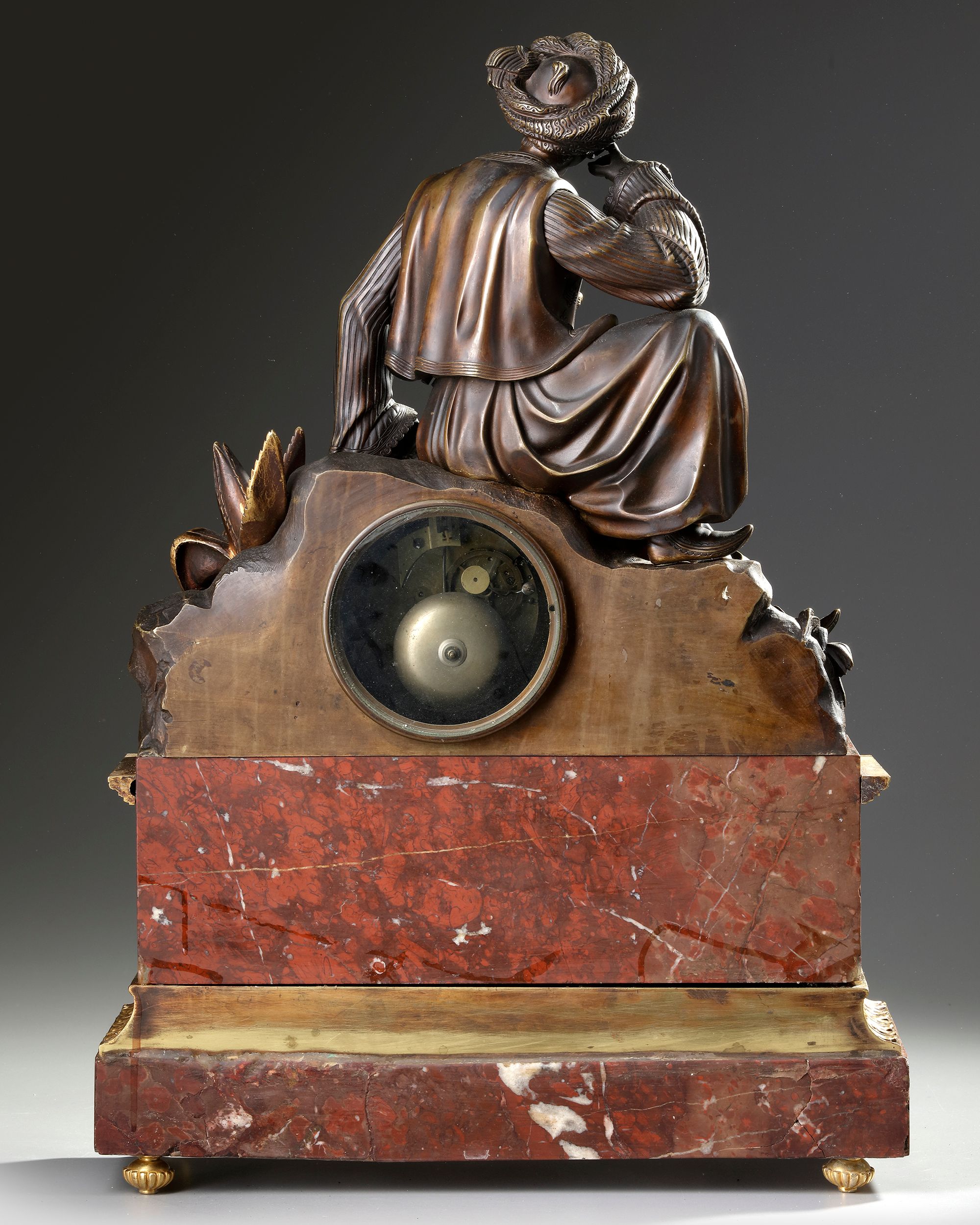 Orientalist clock on a red marble base. Restoration periode. H 63 cm. D 44 cm. In a good condition.