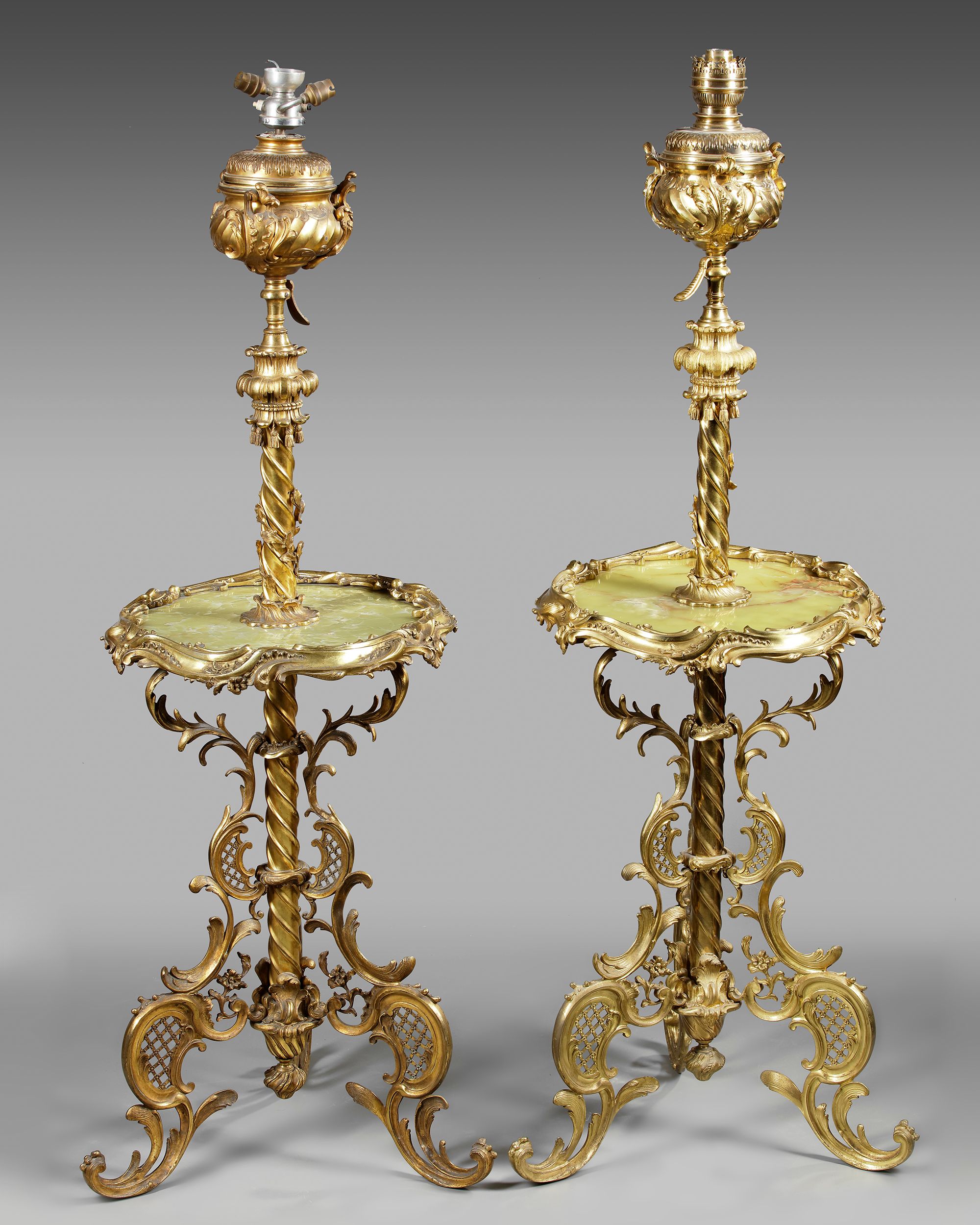 A pair of floor lamps in ormolu and green onyx, pedestal table lamp, called smoking table,