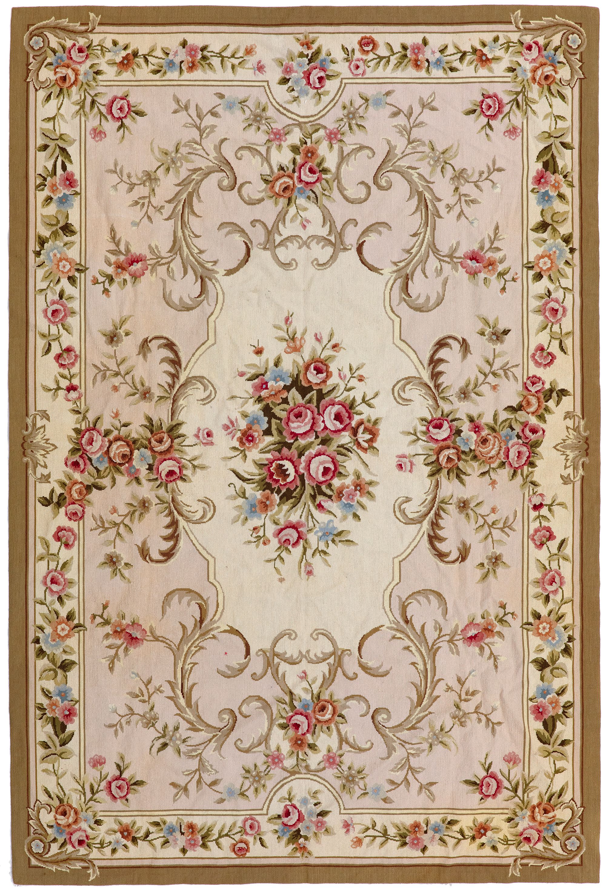 Very nice carpet with garlands and flower medallions on a beige background, colored flowers. 300 by 240 cm.