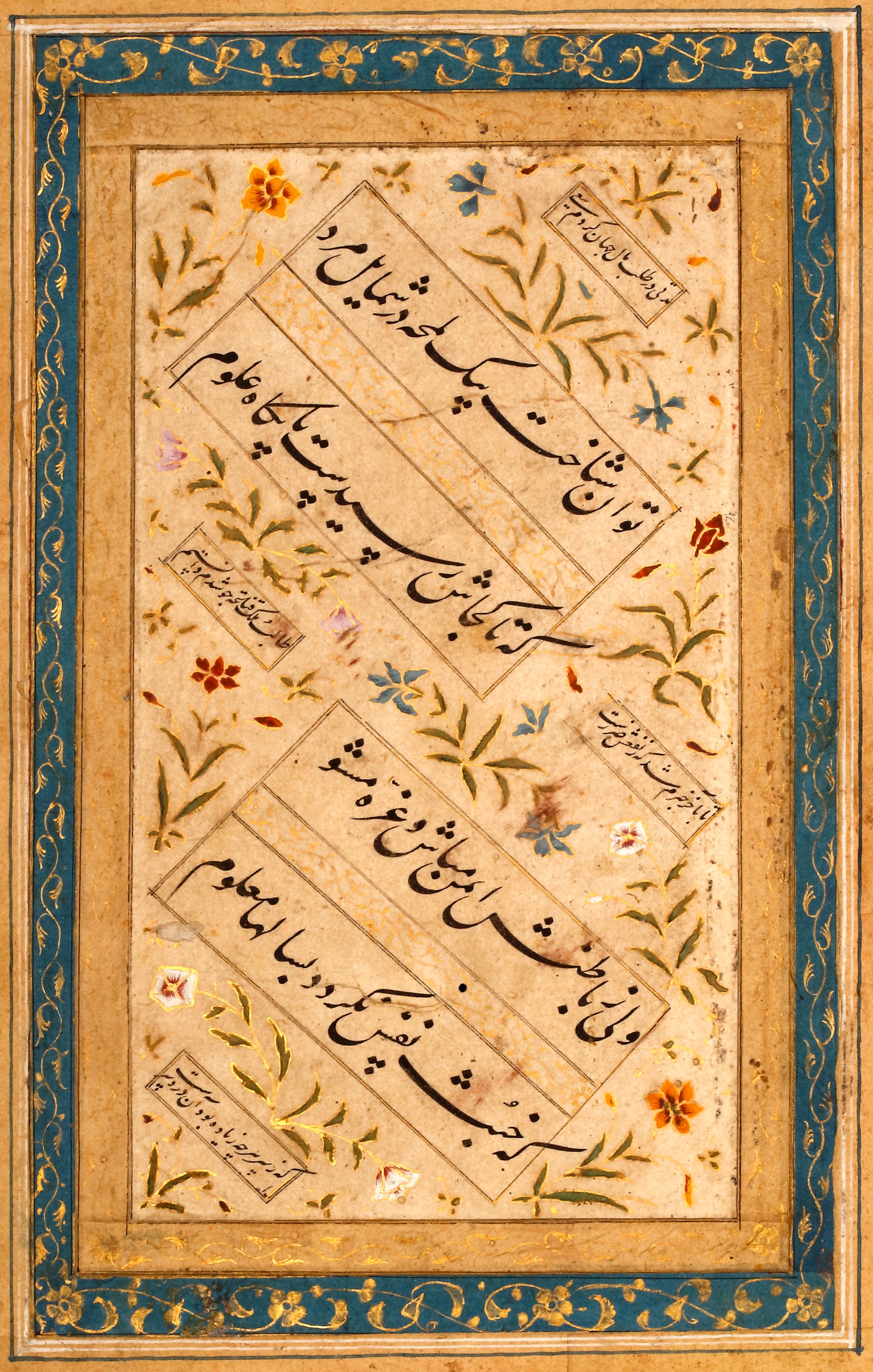 On the back, text from two Nastaliq banners, surrounded by smaller inscriptions on a background of polychrome flowers.