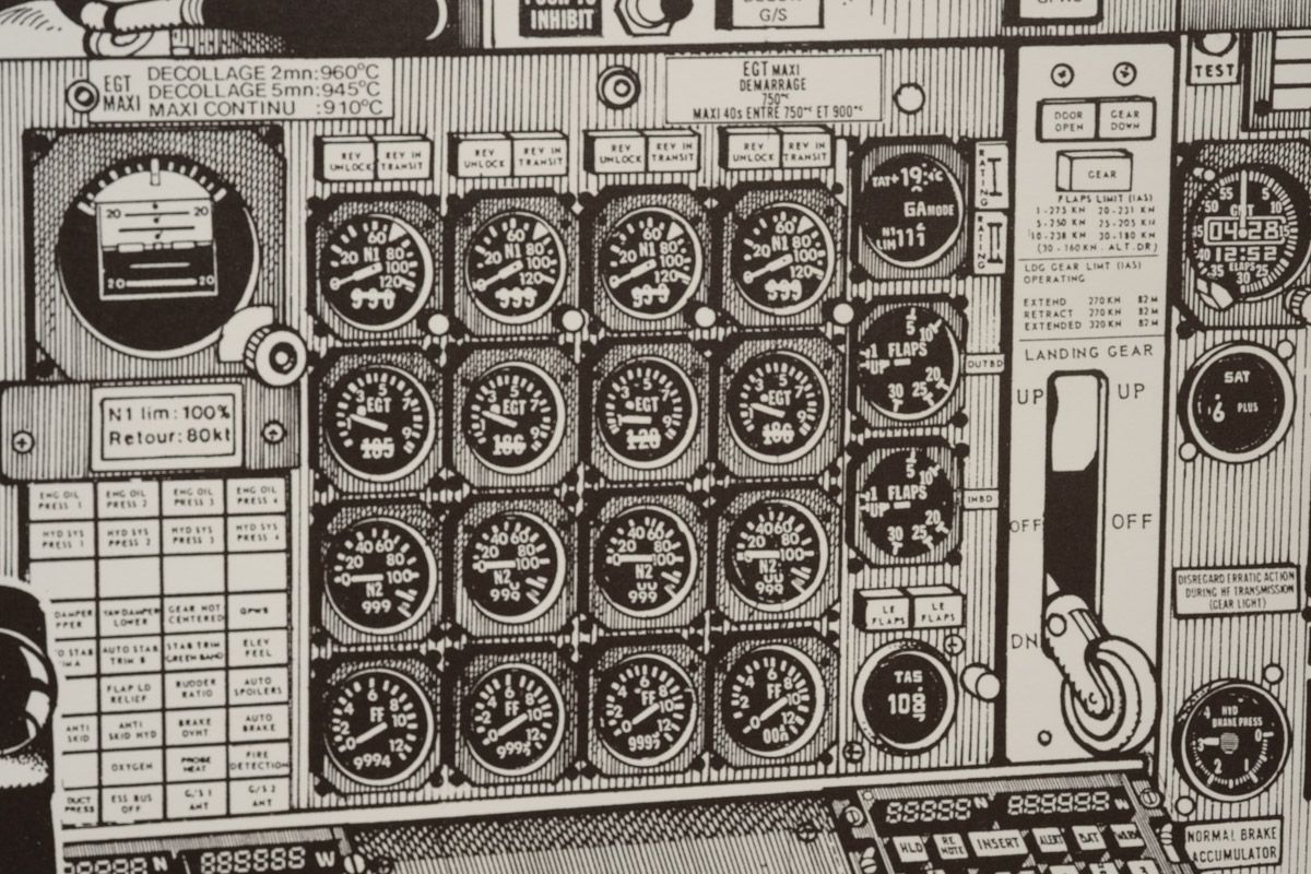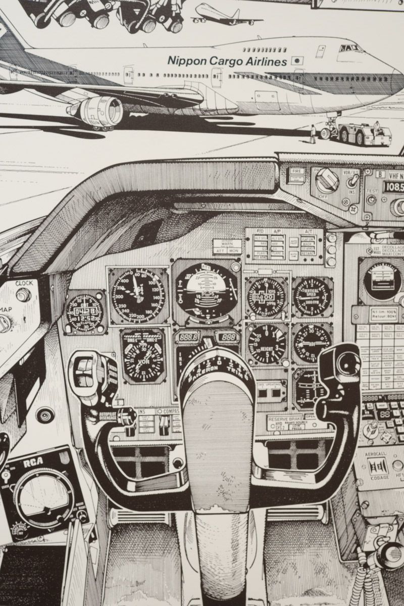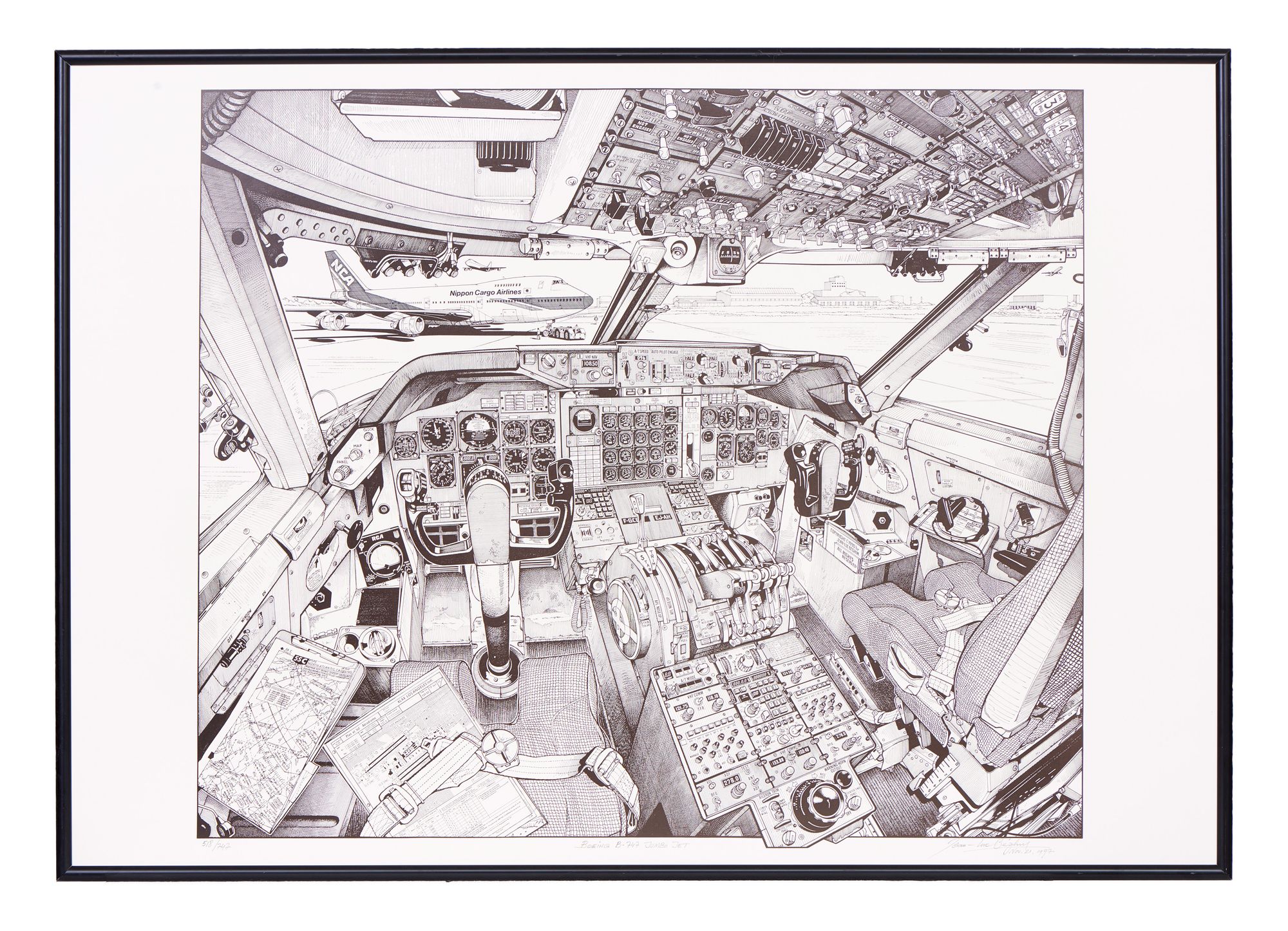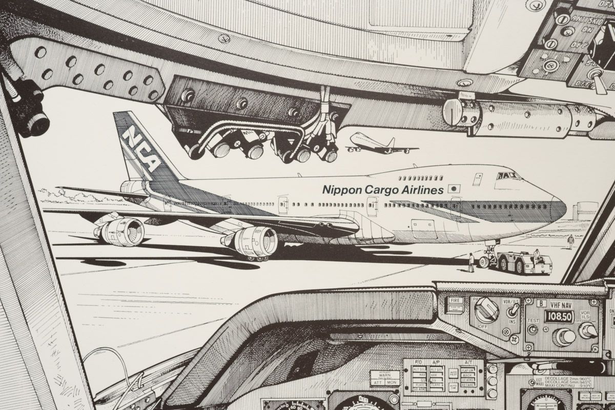 A print in a frame of the interior of the cockpit of a Boeing 747 with view on a Nippon Cargo Airlines plane by the Belgium artist Jean-Luc Beghin (1939), signed with a pencil. No 518/747.