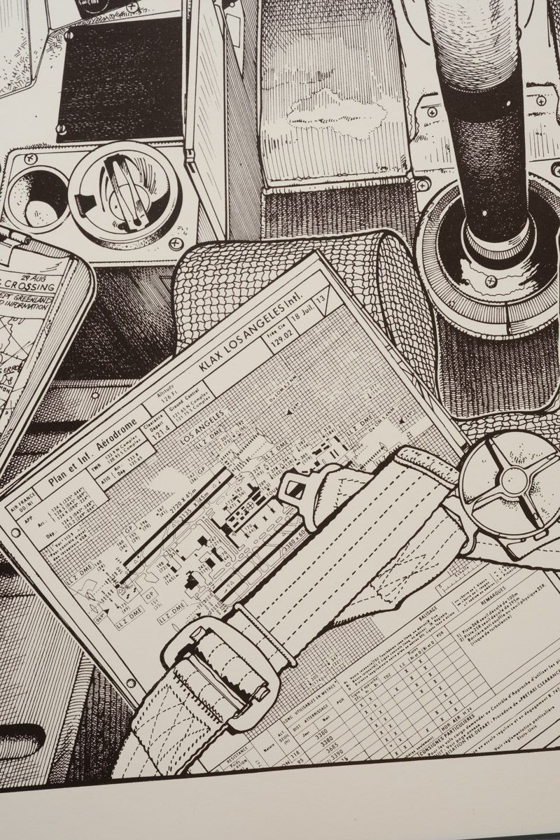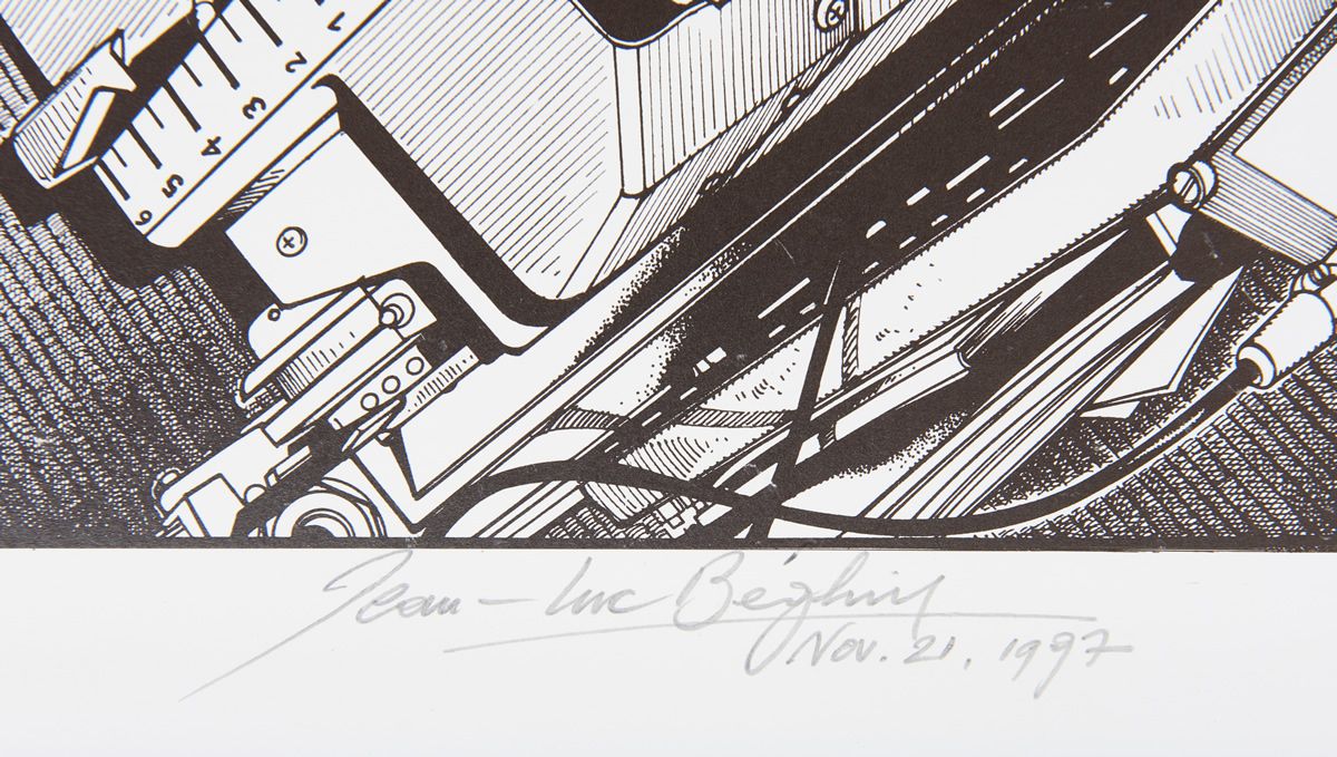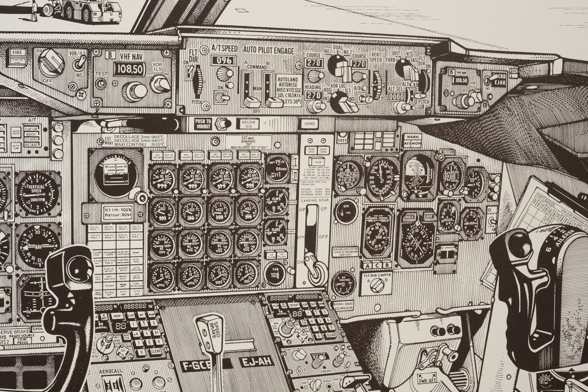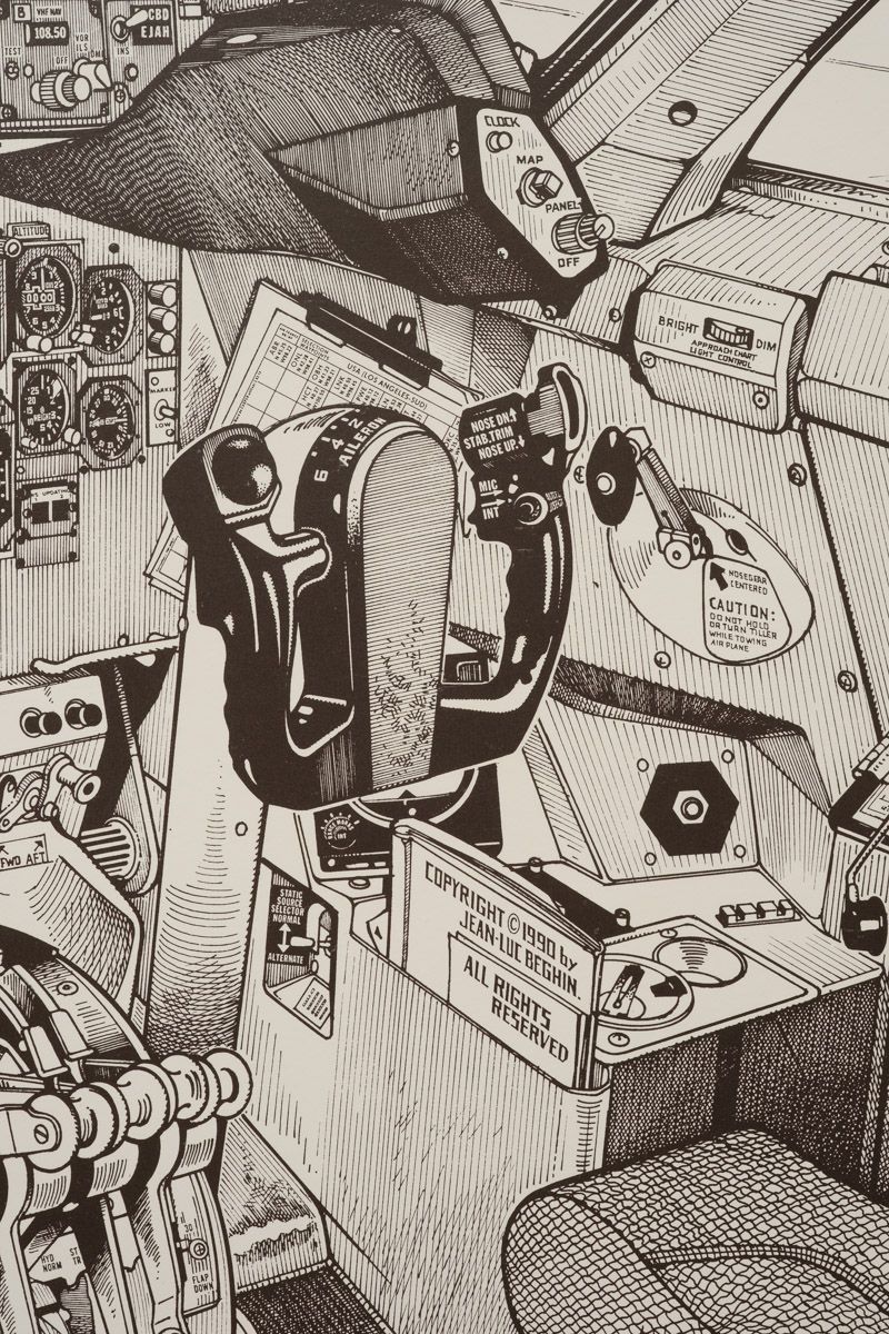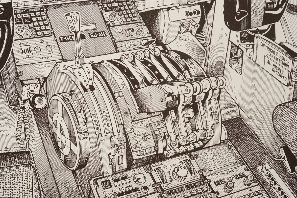 A print in a frame of the interior of the cockpit of a Boeing 747 with view on a Nippon Cargo Airlines plane by the Belgium artist Jean-Luc Beghin (1939), signed with a pencil. No 518/747.