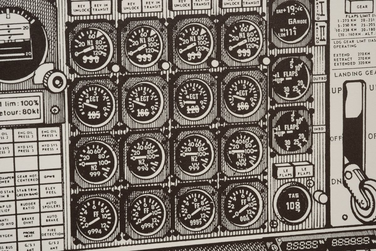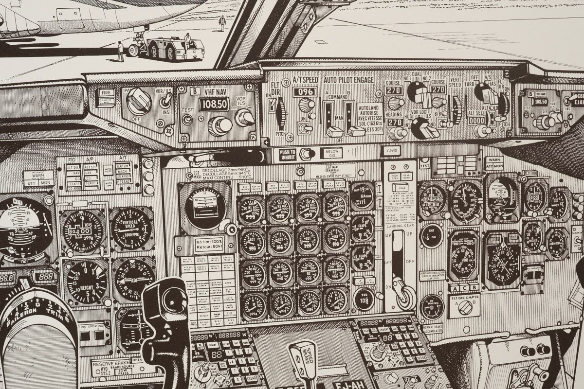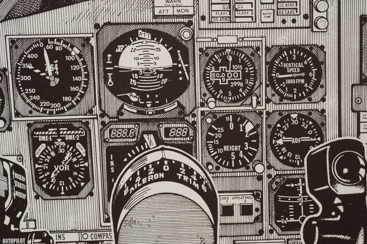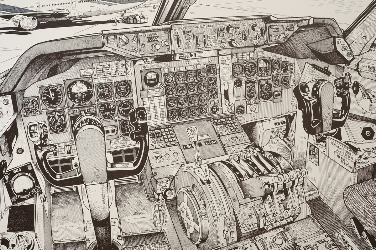 A print in a frame of the interior of the cockpit of a Boeing 747
