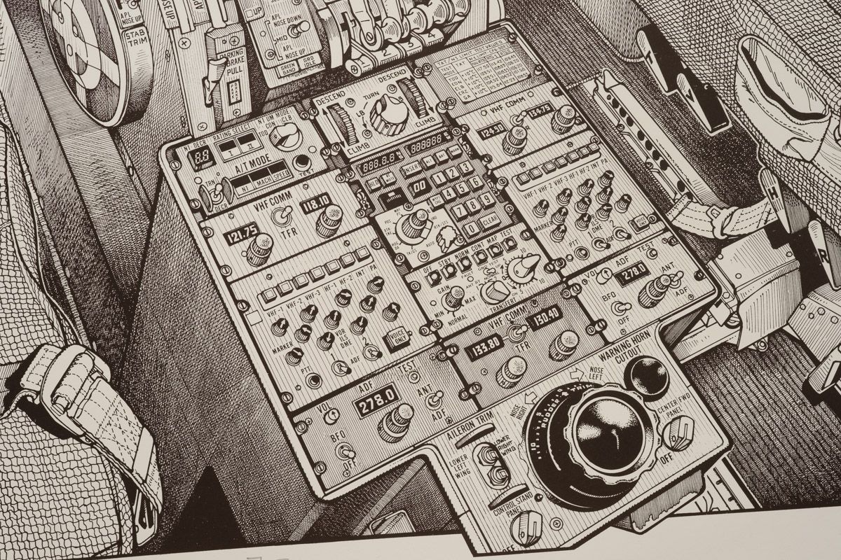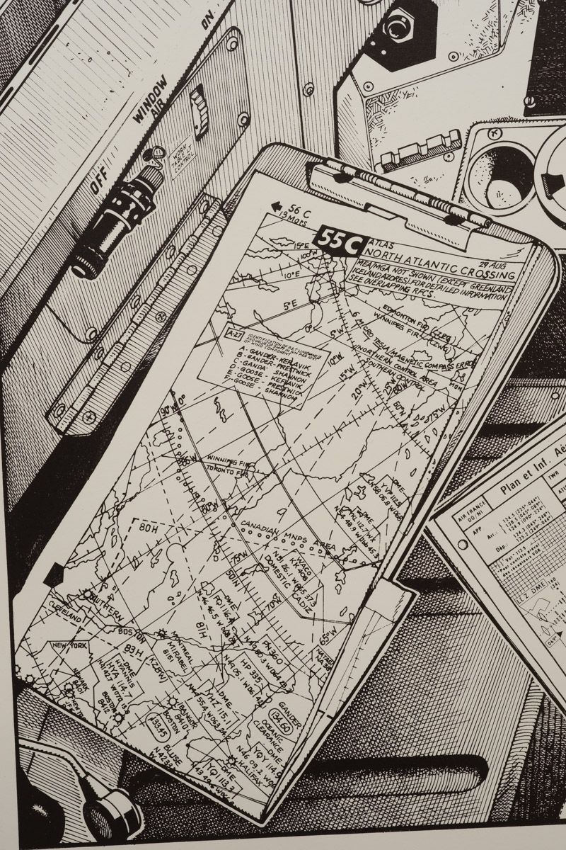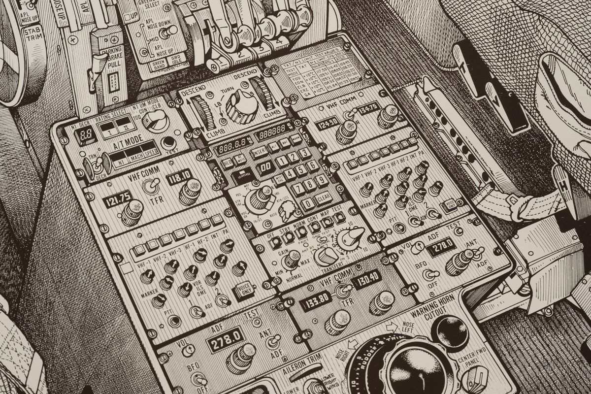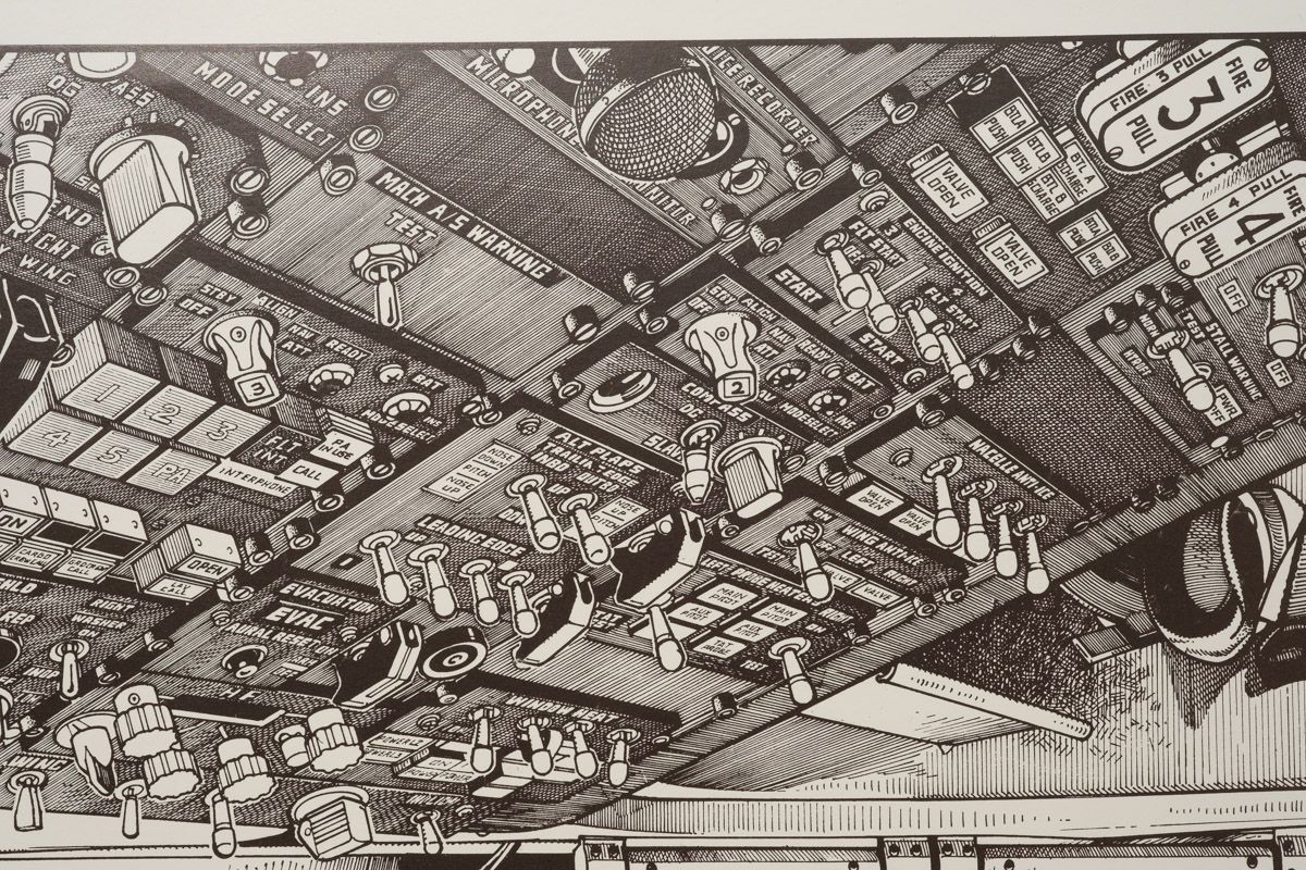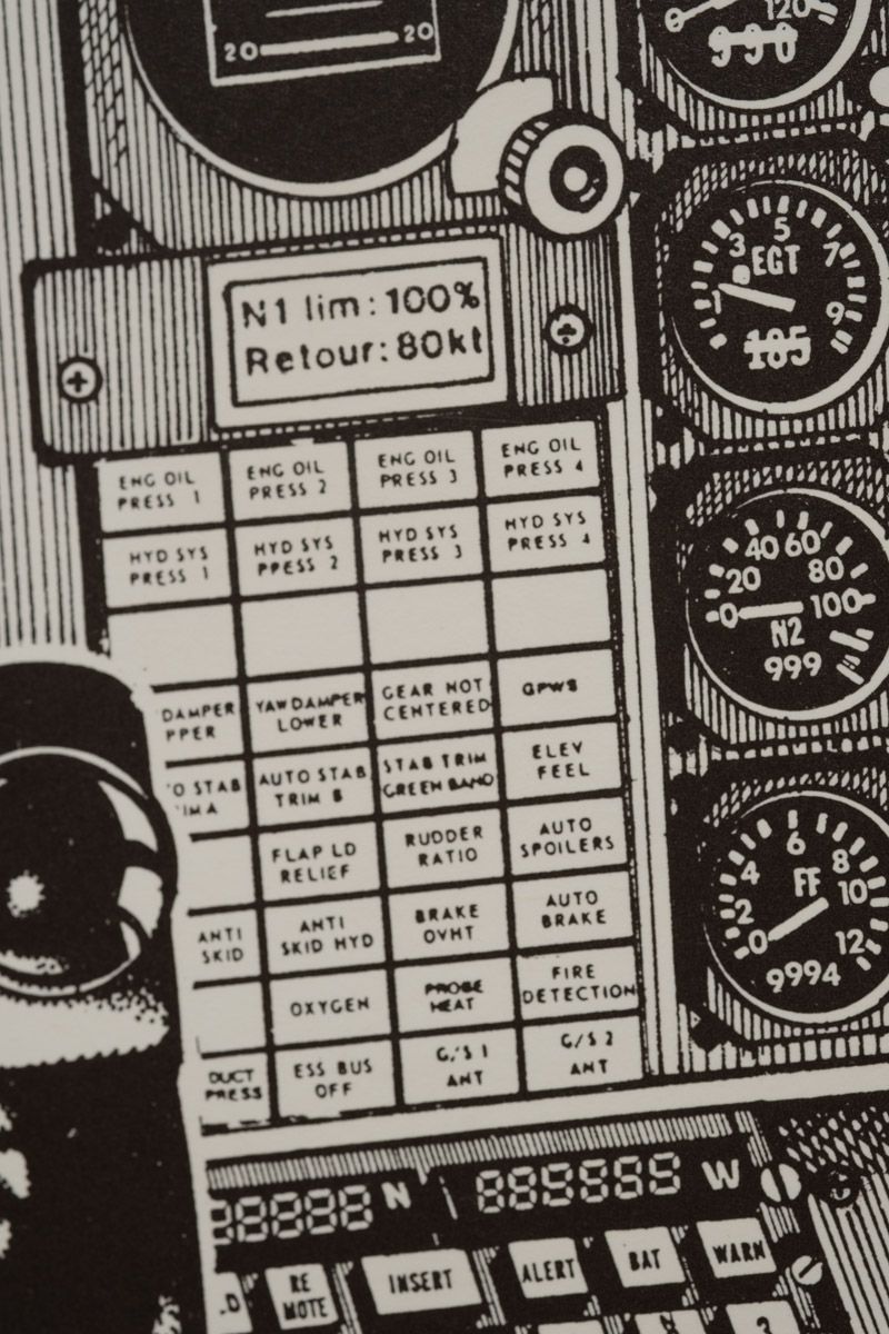A print in a frame of the interior of the cockpit of a Boeing 747