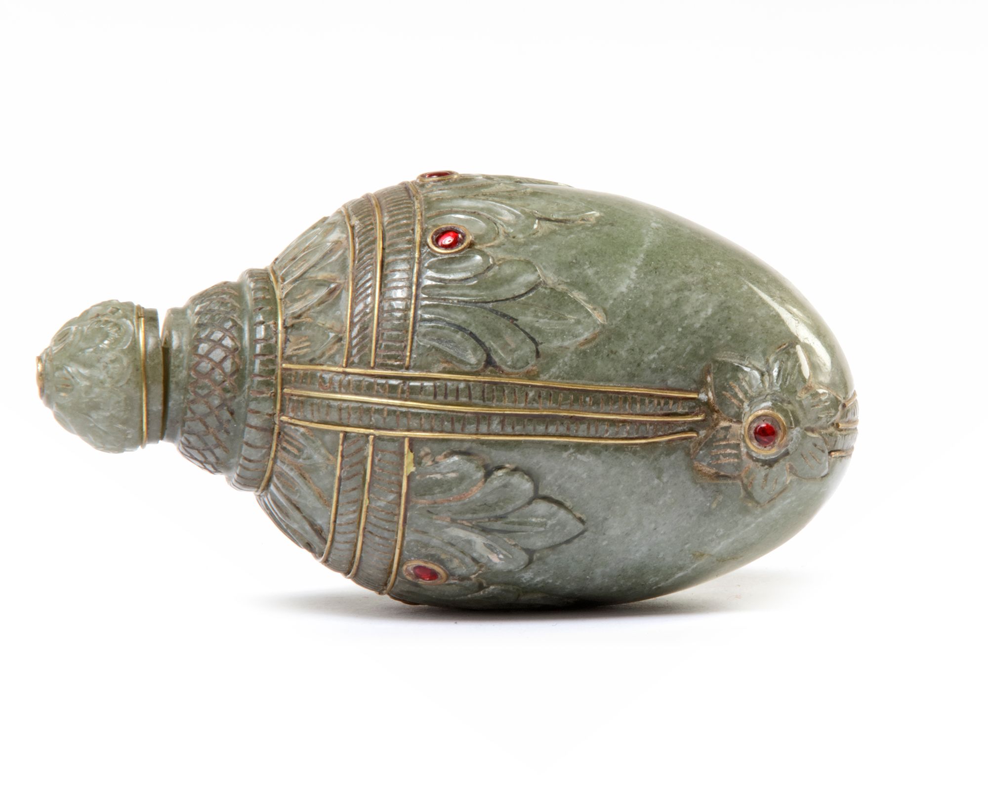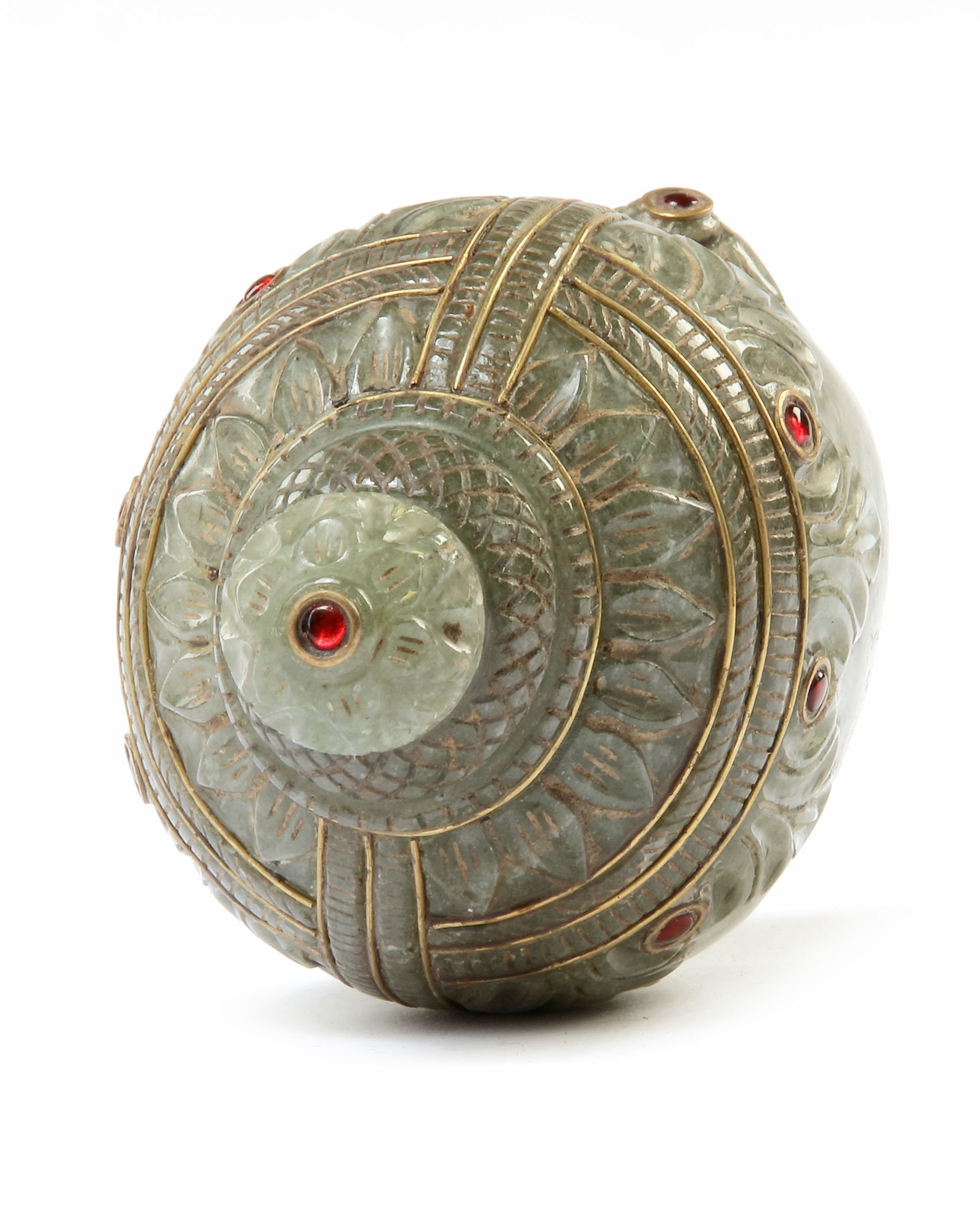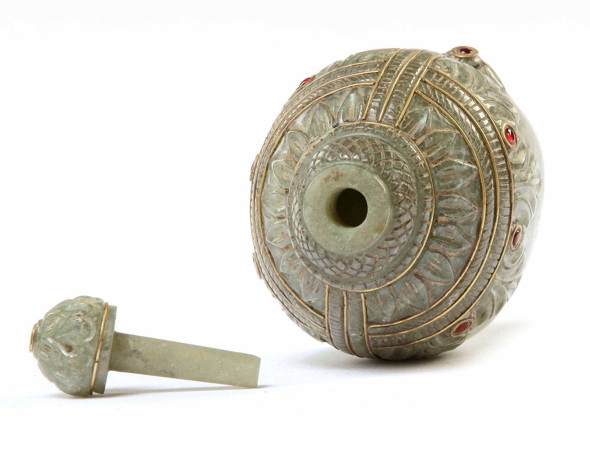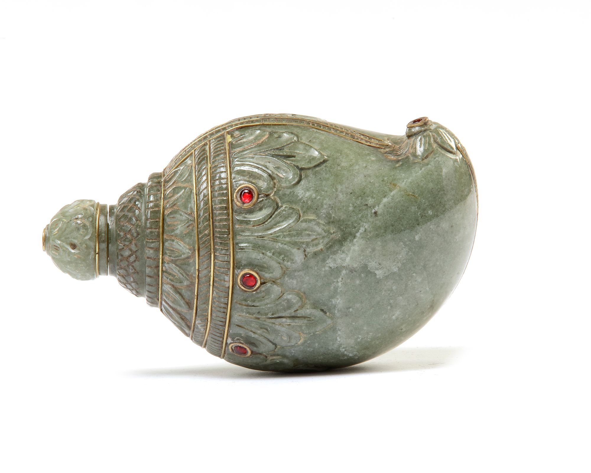 A Mughal jade gunpowder holder carved with stiff leaves and set with gold thread and gemstones. 10 cm.