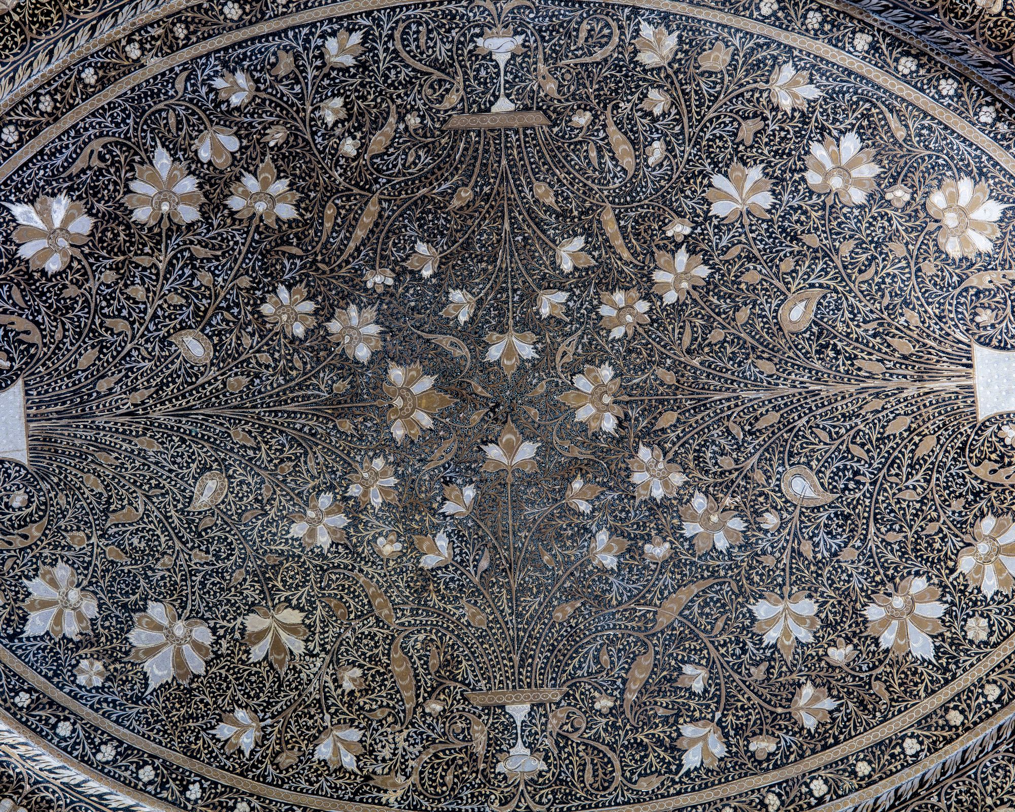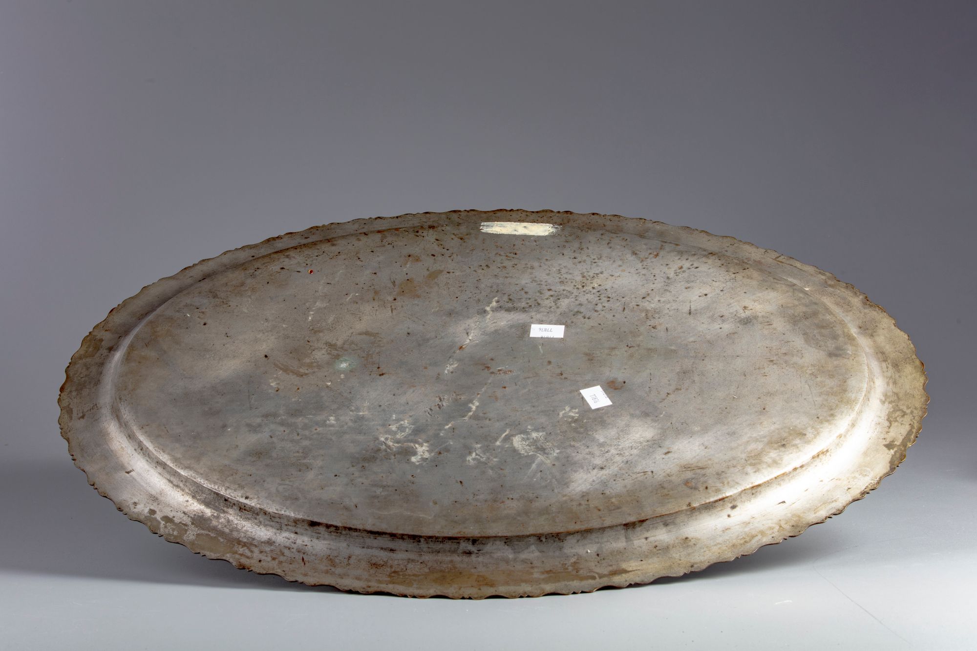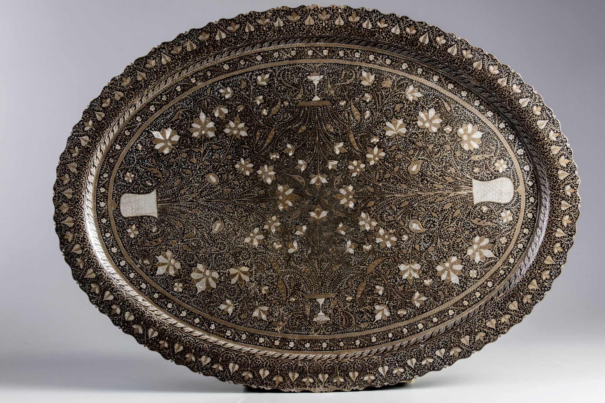 A Mughal oval shaped bidri tray, decorated with a dense design of flowers and foliage growing from vases with silver inlays. 68 by 50 cm.