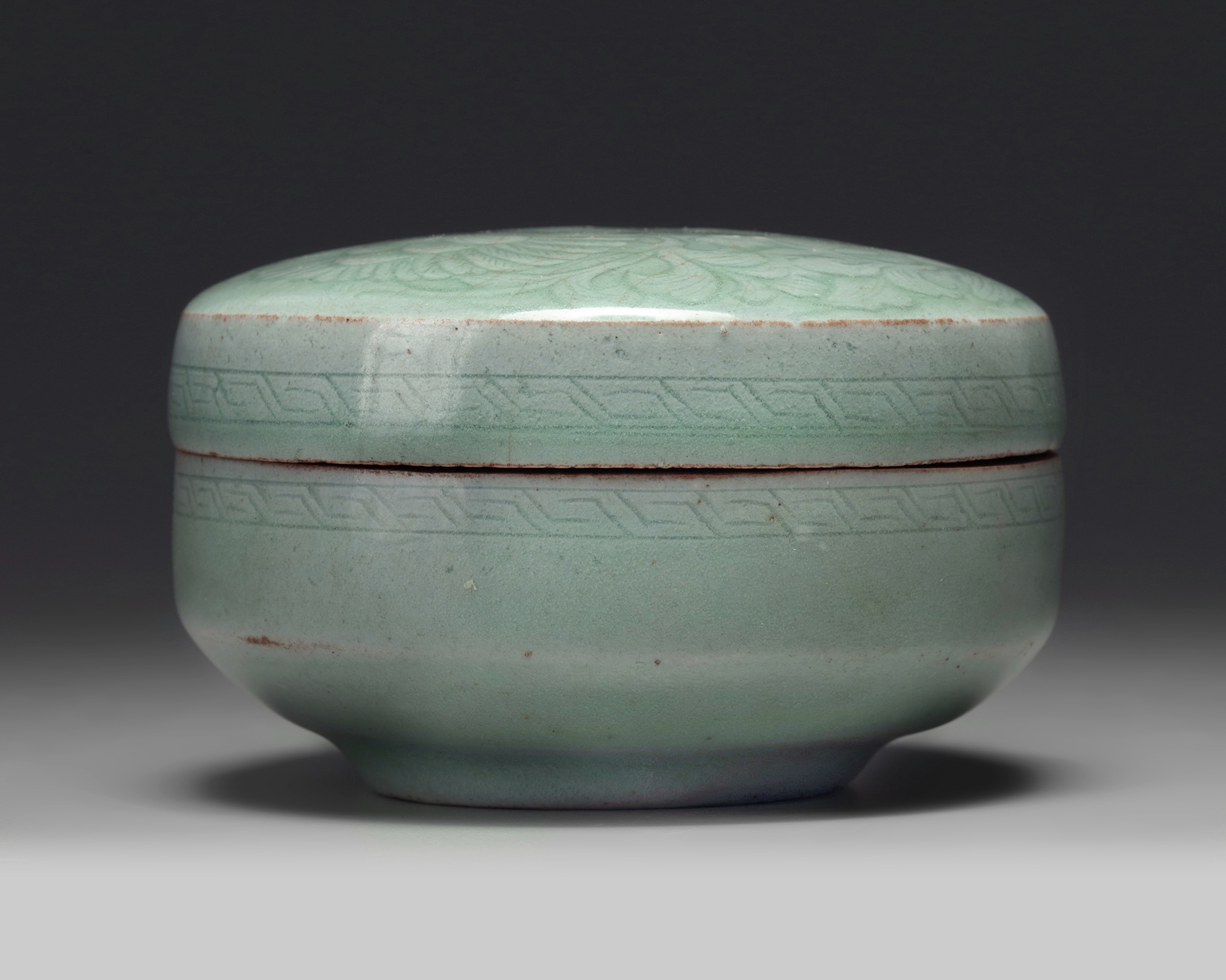 A Korean celadon-glazed ‘chrysanthemum’ round box and cover