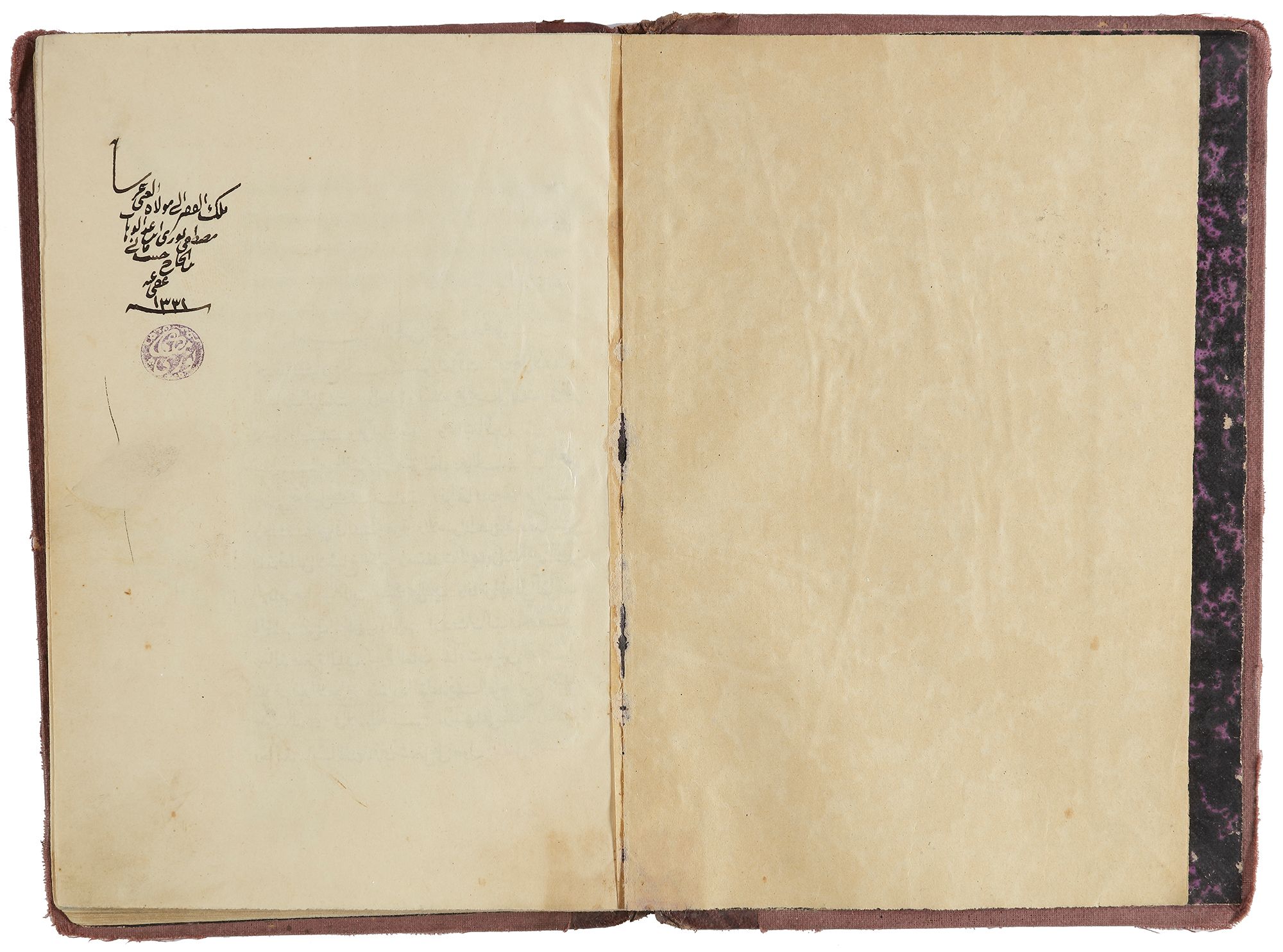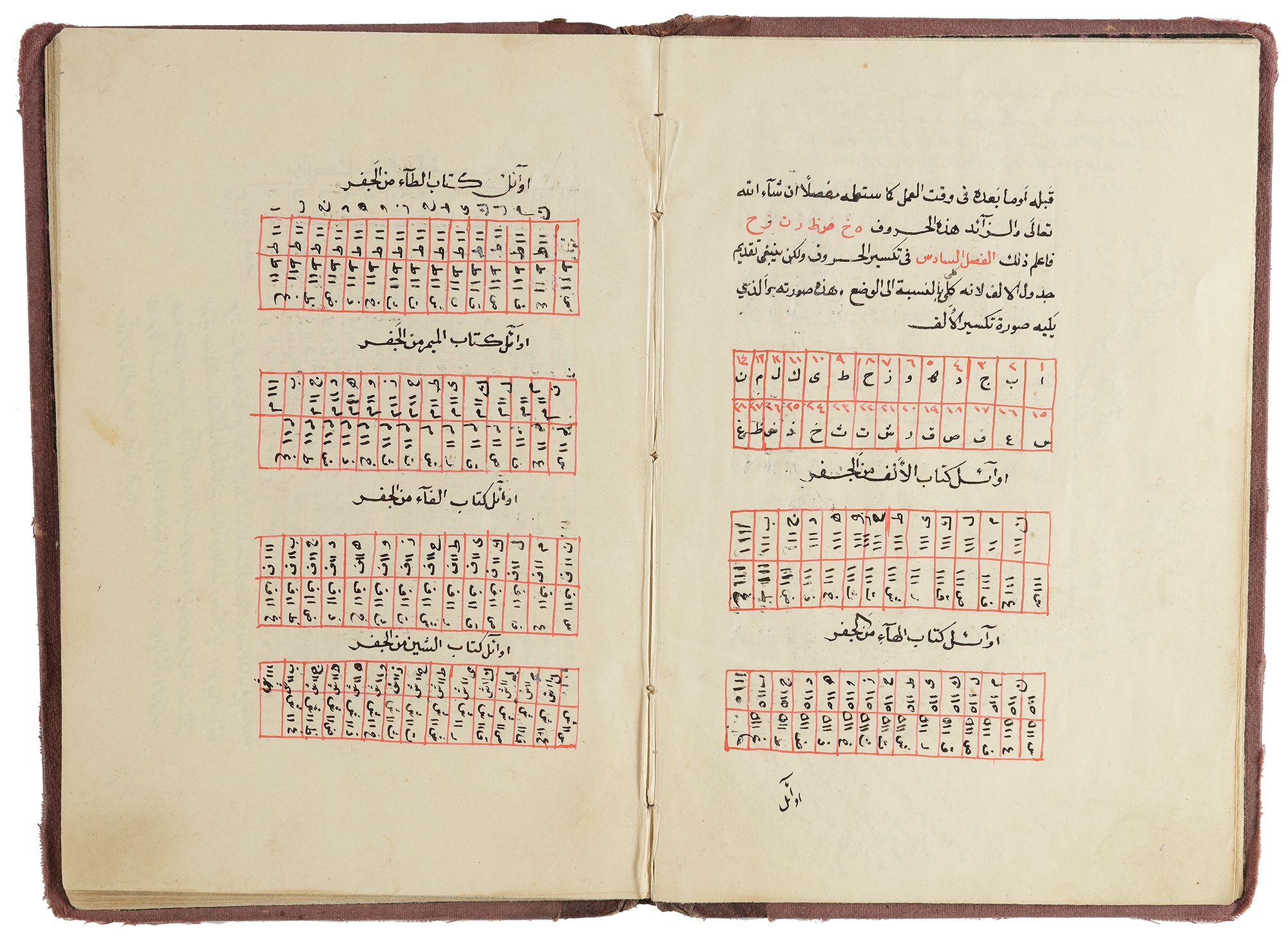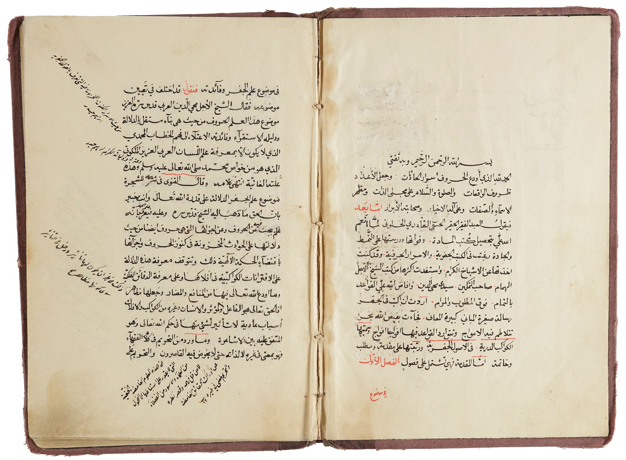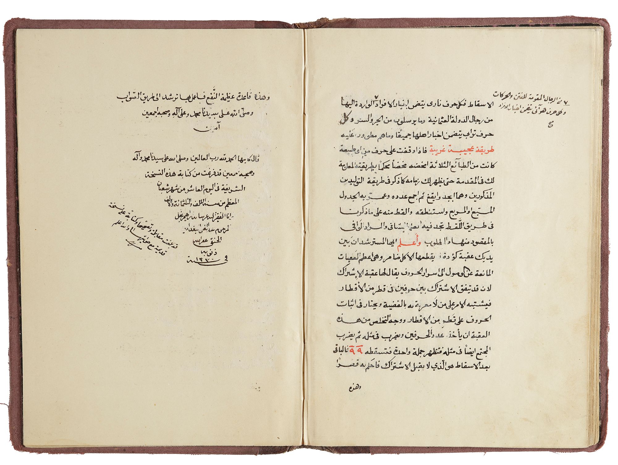 In Arabic, decorated manuscript on paper [Near East, dated month of Sha'ban ( 1330 AH /1912 AD) complete, 23 leaves (plus 6 flyleaves), single column, 18 lines black naskh per page, numerous charts and diagrams throughout in red, marginal annotations throughout, ink ownership inscription and ownership stamp to front free endpaper, contemporary morocco-backed cloth boards, corners and extremities rubbed, covers a little scuffed 21.5 by 14.5 cm