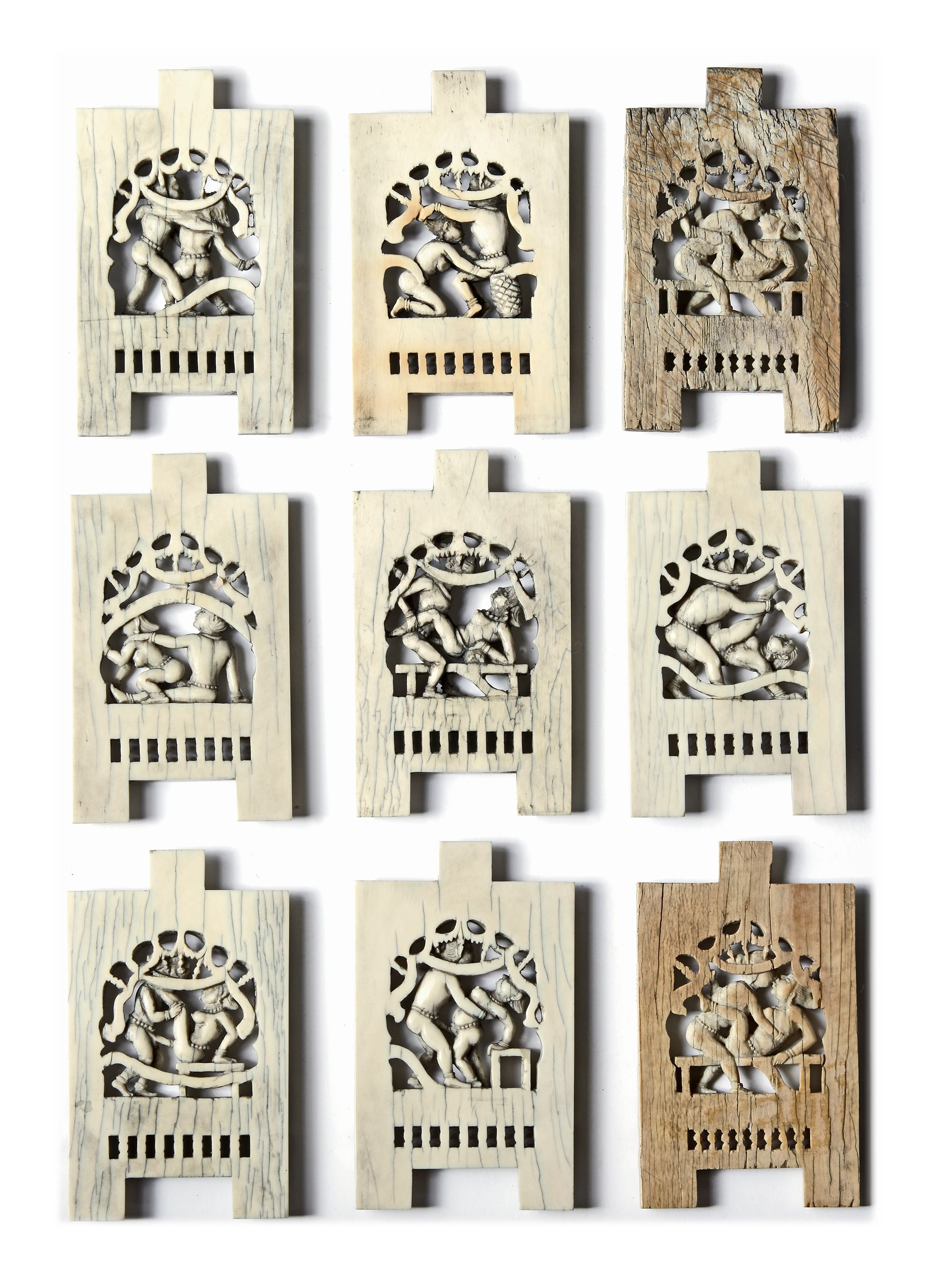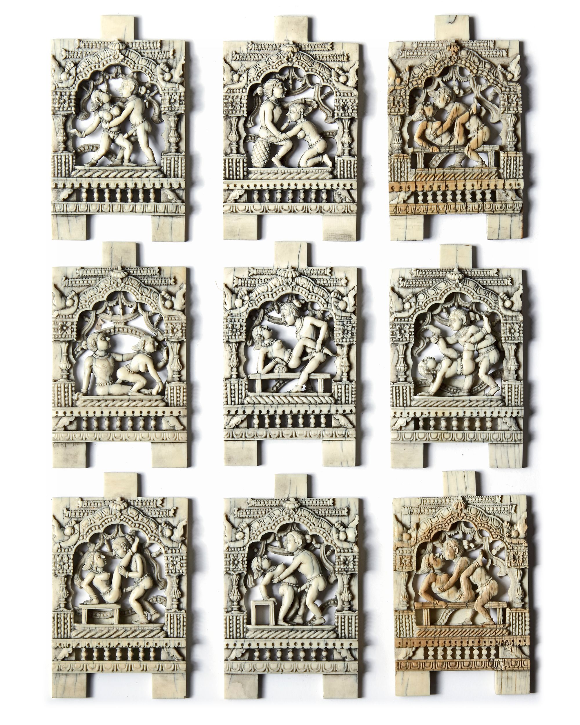 Each of rectangular form with a single central upper projection and two lower projections to the sides, the main panel carved with a copulating couple in relief against a pierced background. These plaques once formed part of the decoration on a marriage bed. 9.5 by 5.6 cm.