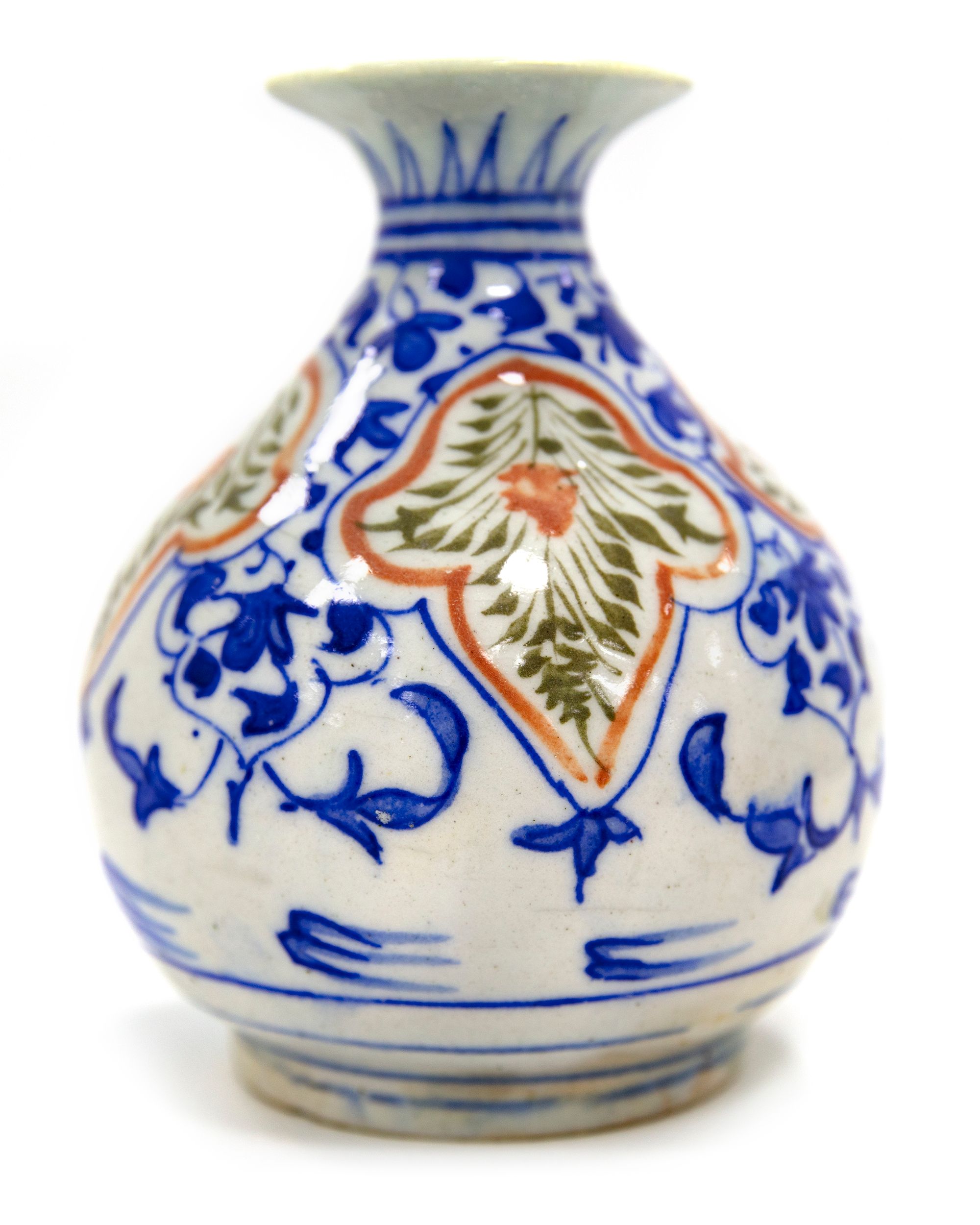 Of compressed globular kendi shape, resting on a short circular foot, rising to flattened shoulders, to the side a rounded bulging spout, painted in cobalt blue and red against a white ground.