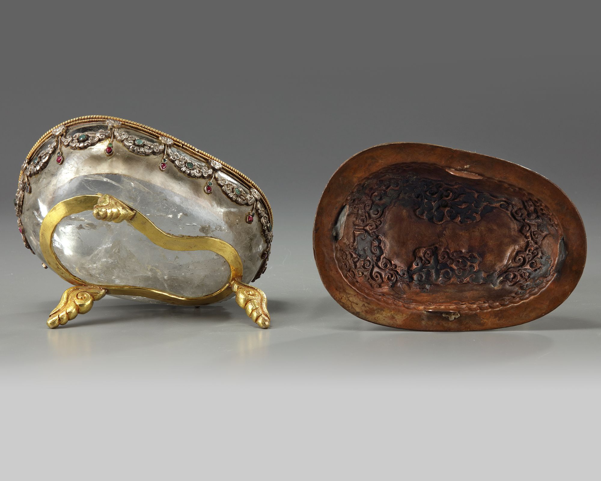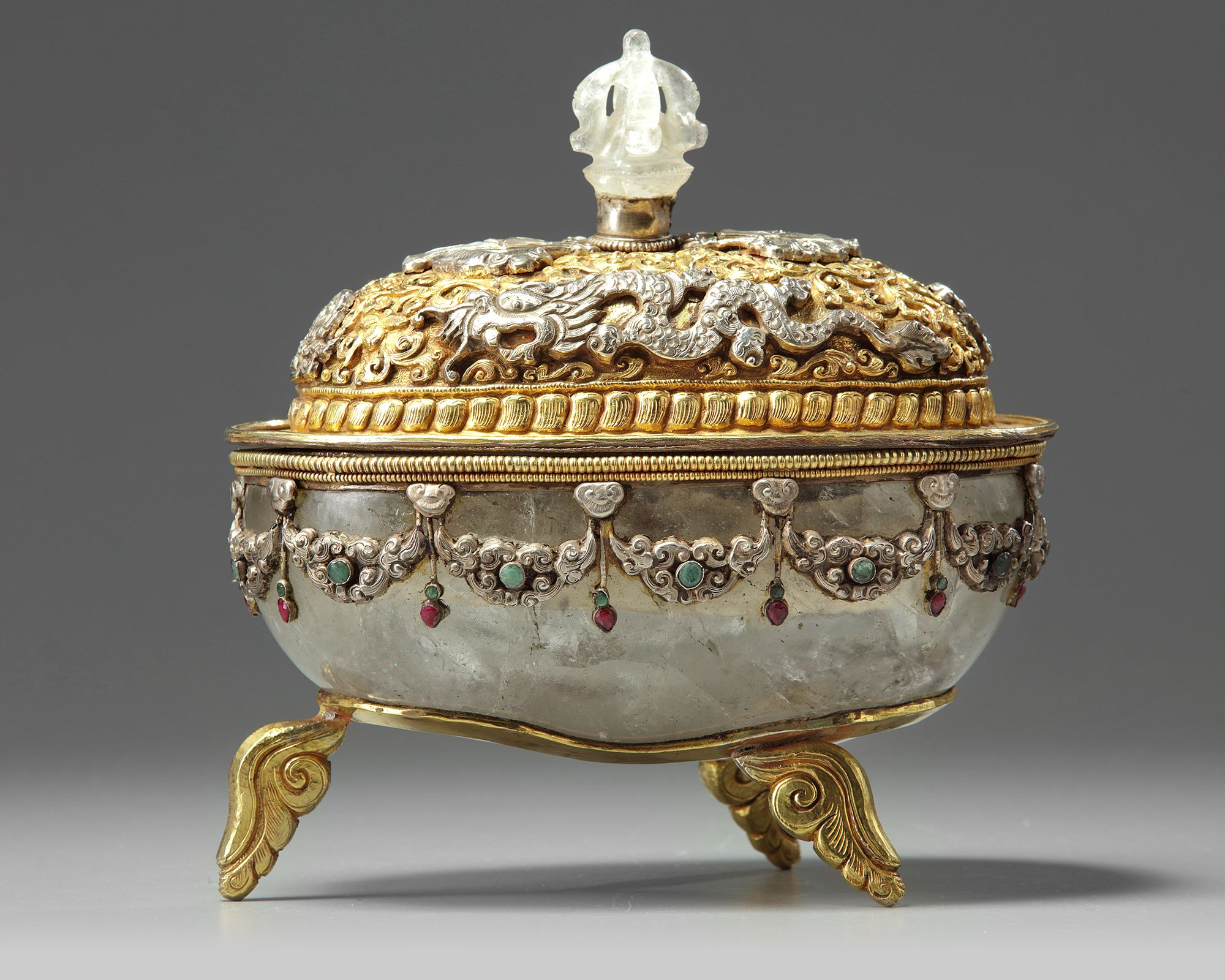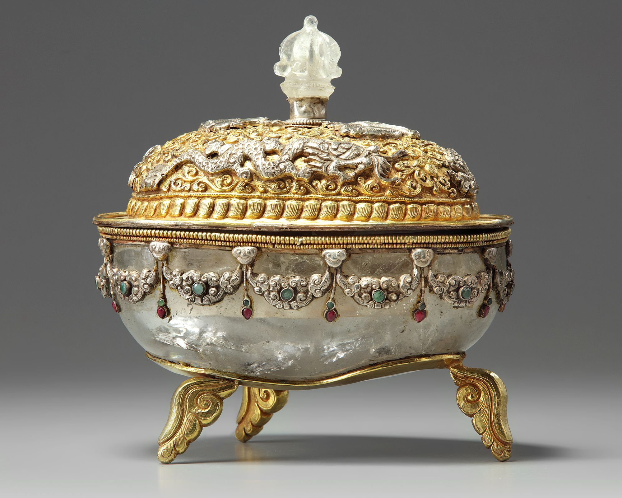 The bowl is thickly carved from rock crystal and is mounted with white metal garlands inlaid with coloured stones, and stands on three gilt copper acanthus leaf feet. The cover is decorated with two repousse dragons amongst lotus scrolls around a vajra, the cover is surmounted by a half vajra rock crystal finial.