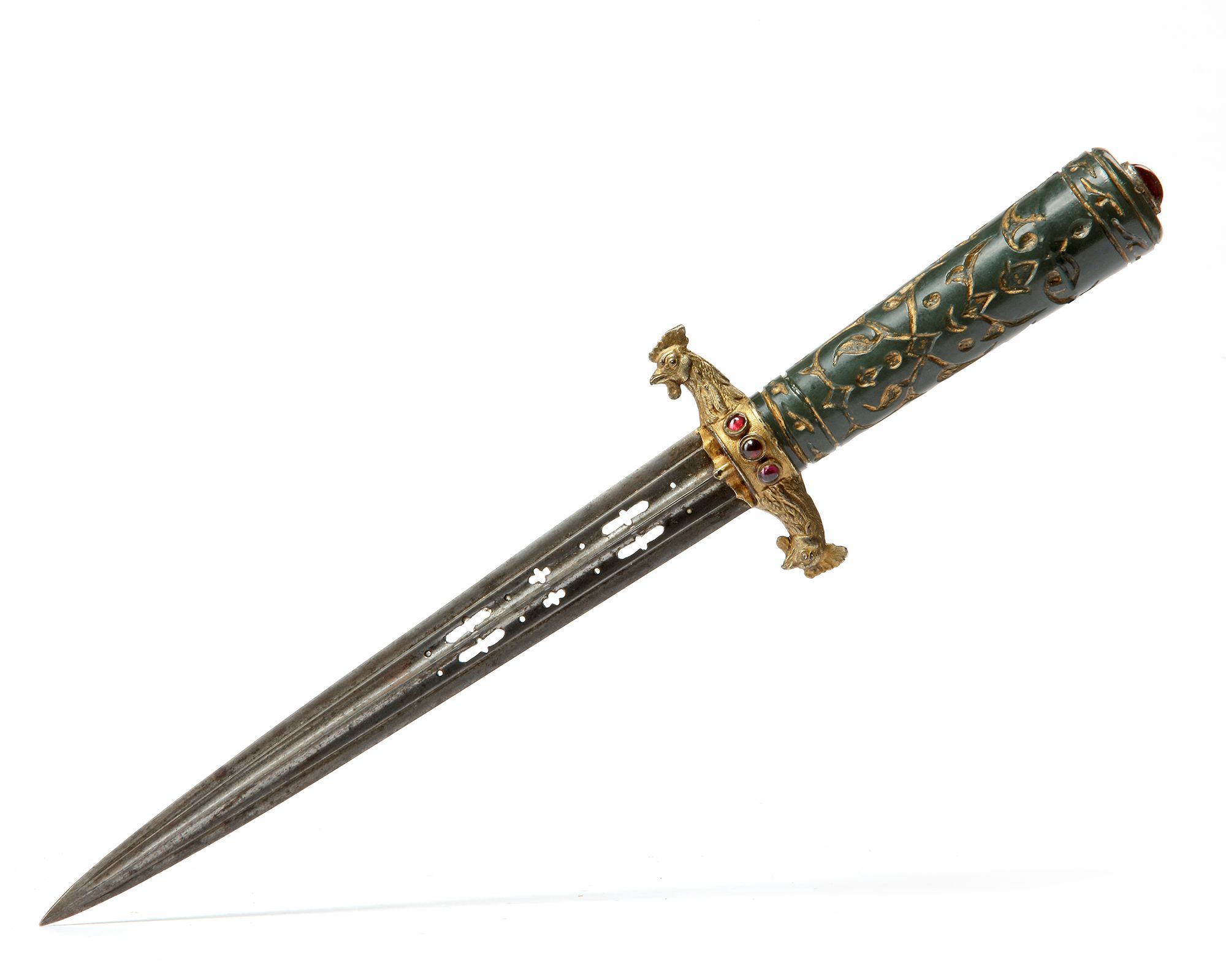 A Timurid spinach jade dagger hilt carved with floral motifs, downturned gilt cockerel head quillion set with red jewels.