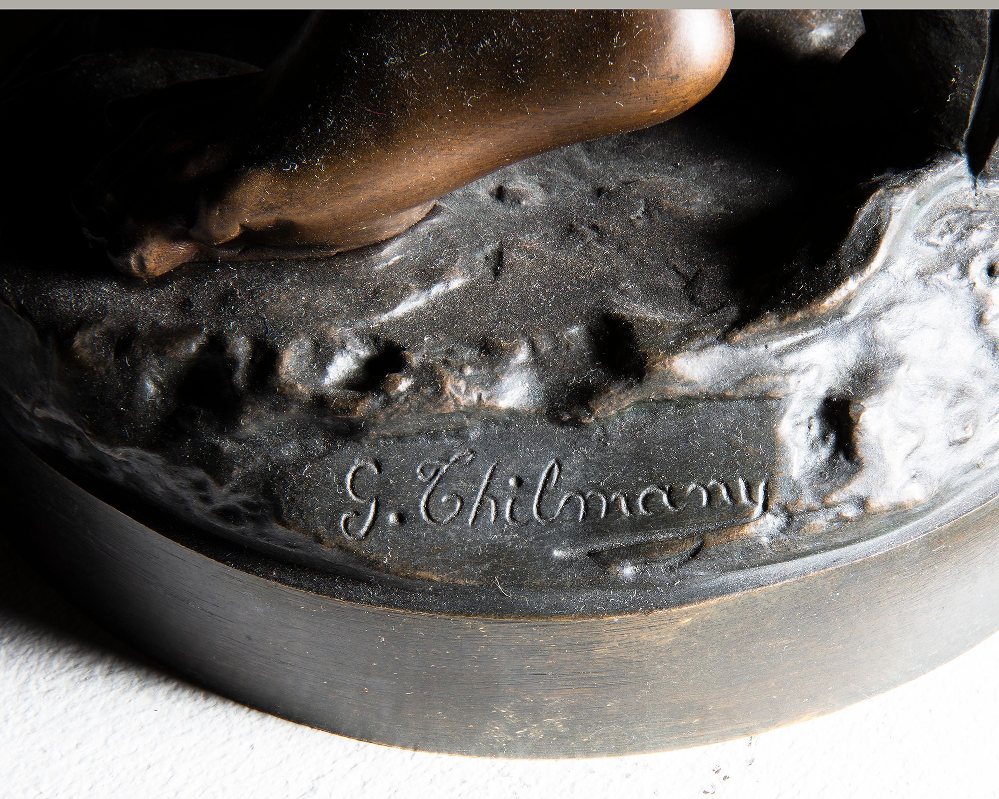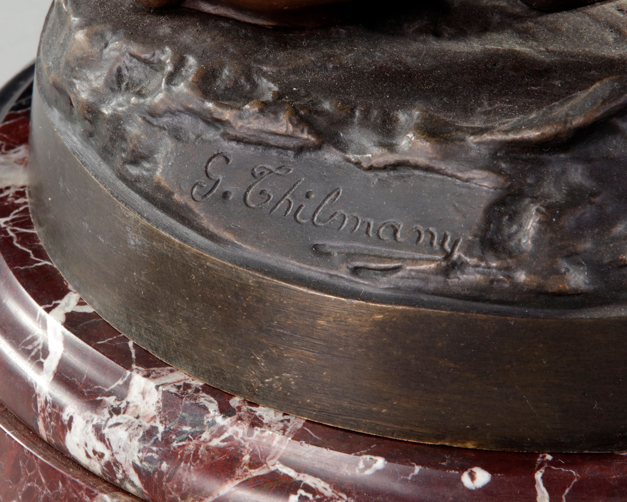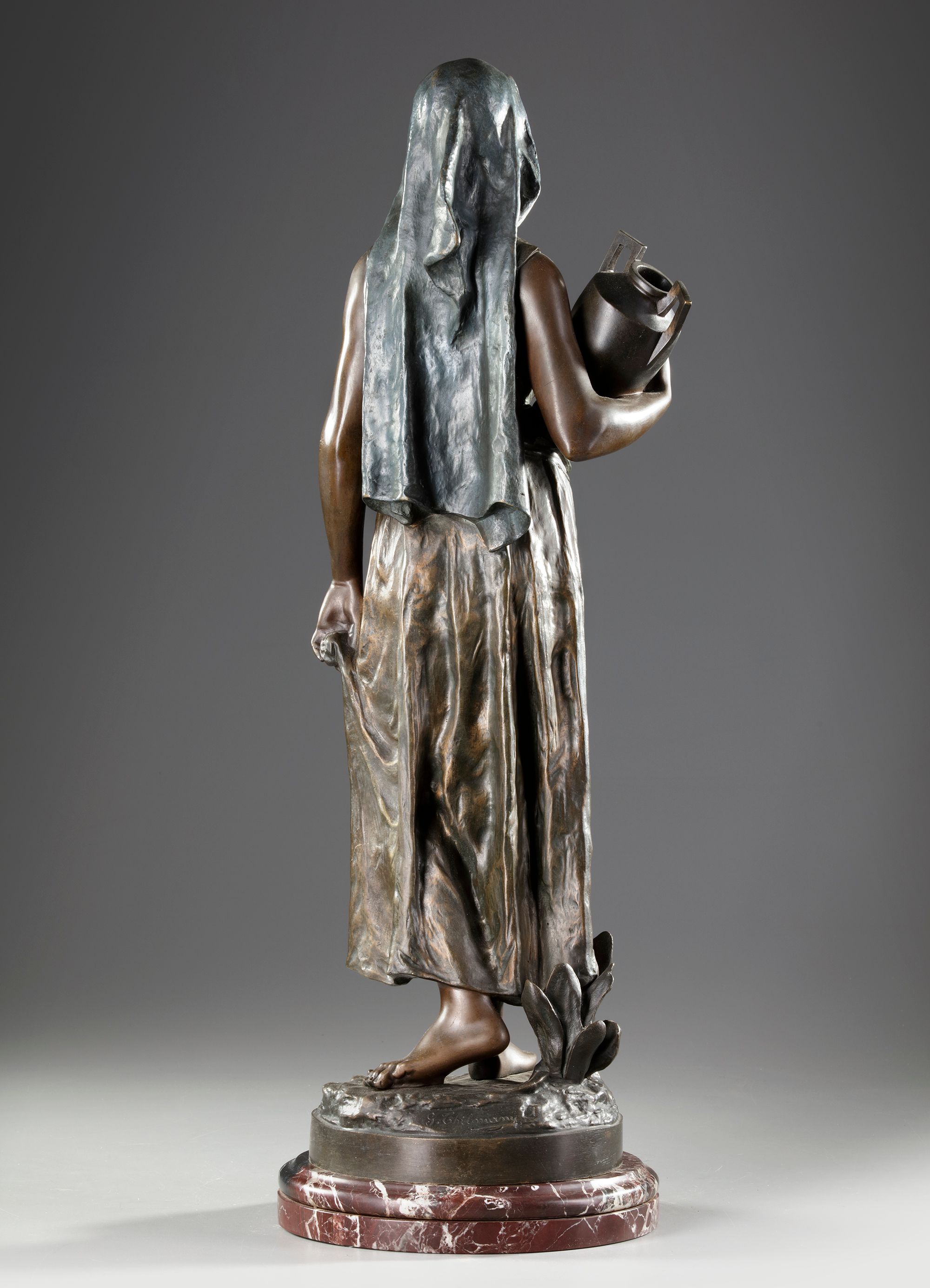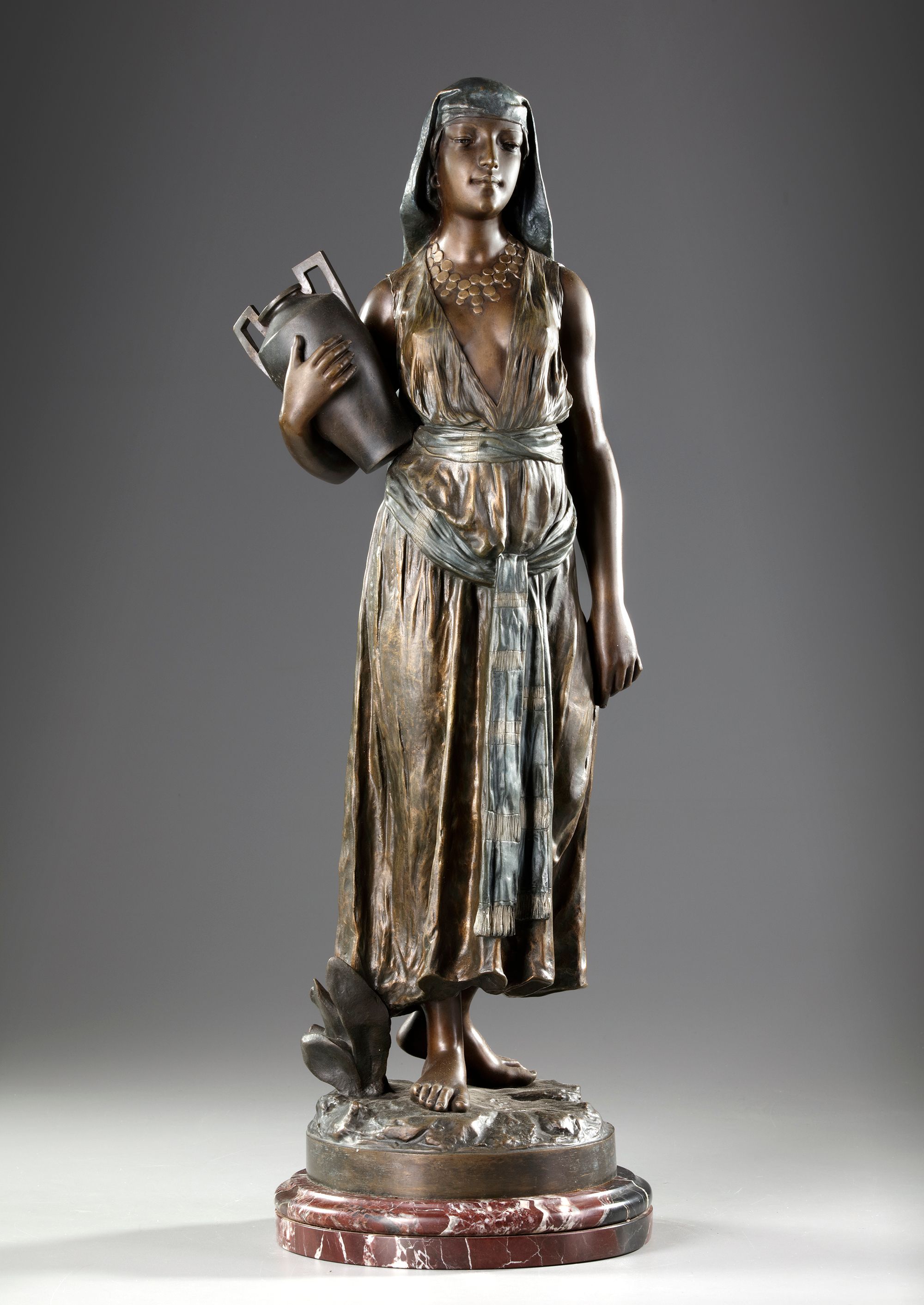 The water carrier, G. THILMANY, 20th century. An orientalist sculpture representing a woman carrying a bronze jar with a slightly golden brown patina, nuanced green and very slightly silver. Marble base. Signature on the terrace. Height 75 cm. In perfect condition.