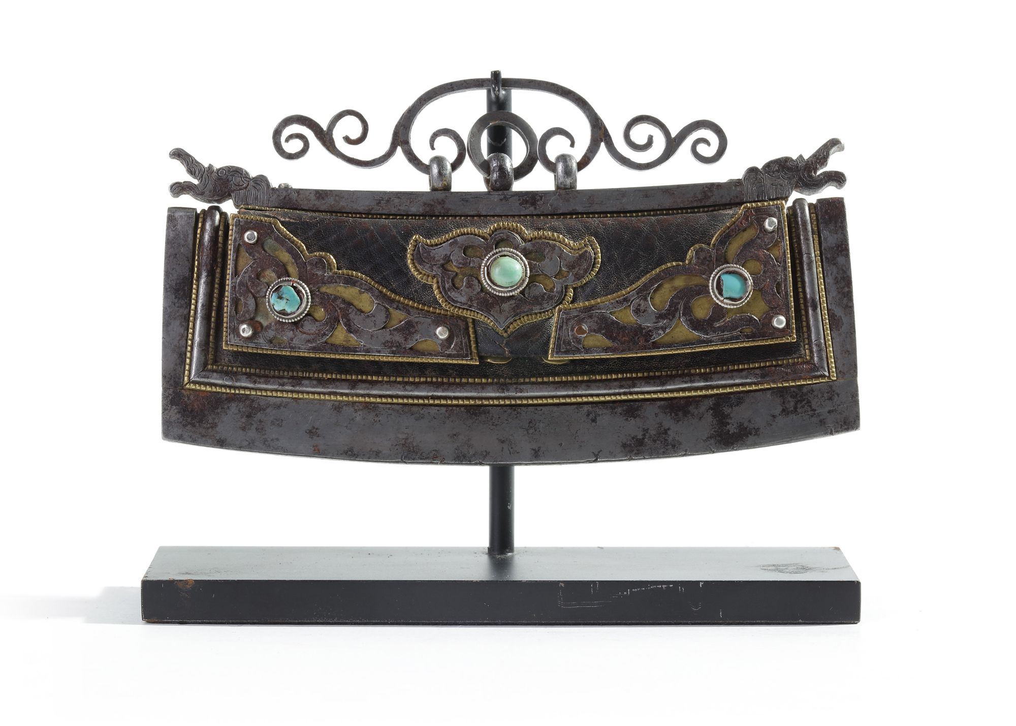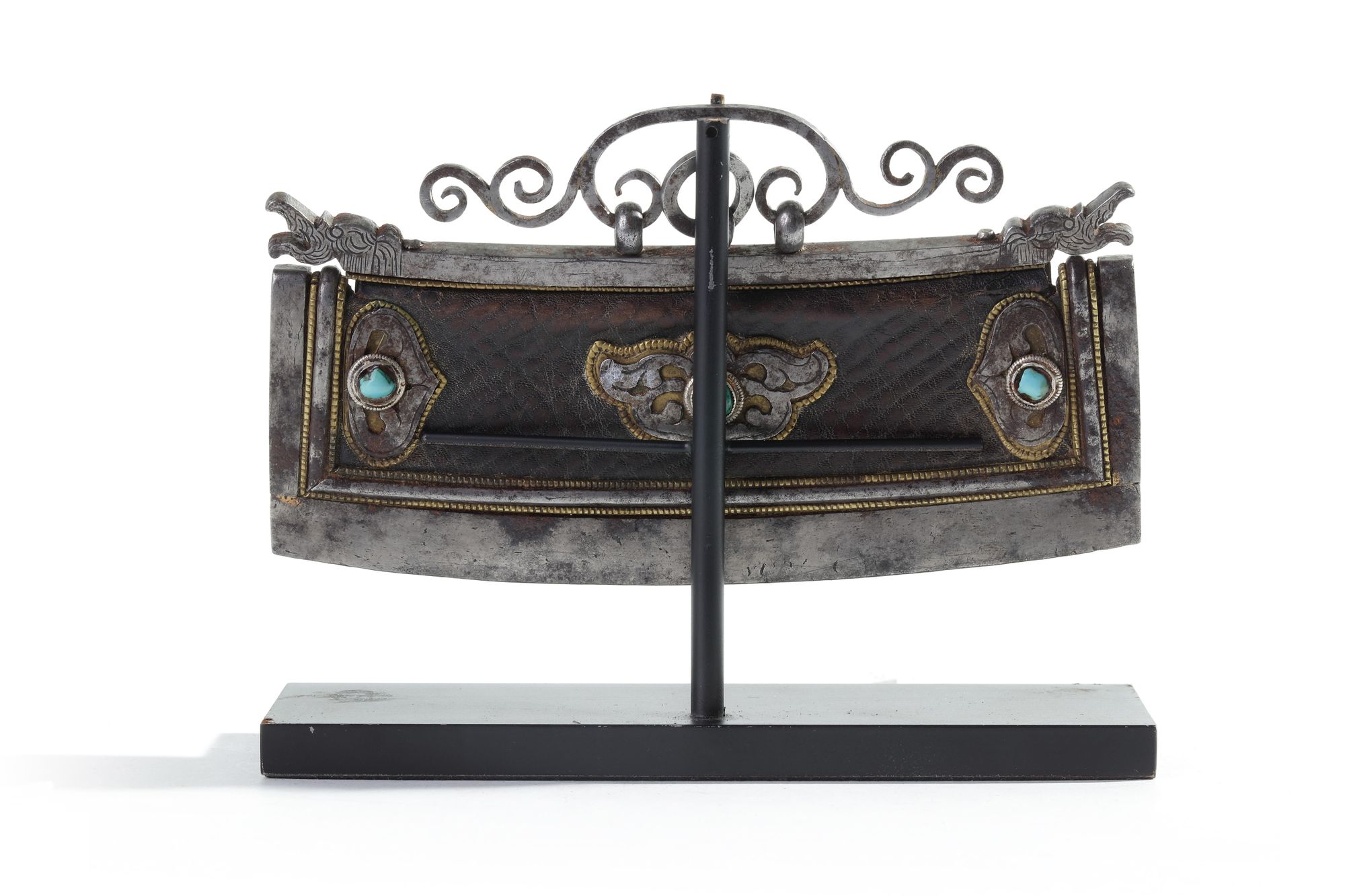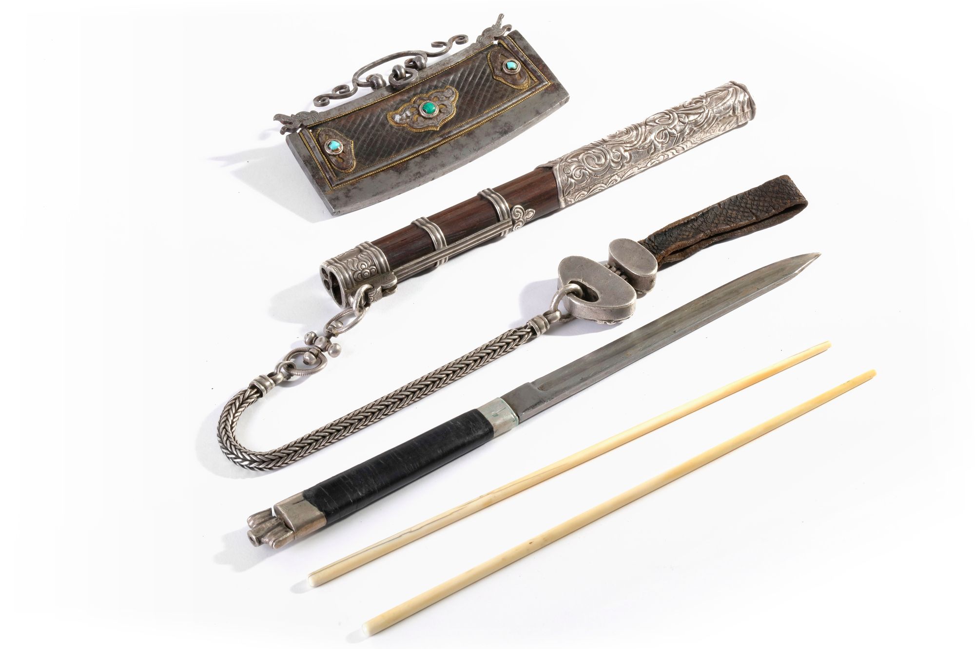 The trousse (eating set), consists of a knife and a pair of ivory chopsticks held in a silver-mounted wooden sheath decorated with elaborate floral scrolls. The sheath is connected via a silver chain decorated with further elaborate scrolls to a leather belt hanging. The leather flint pocket is mounted with silver and brass decorated with makara, scrolls, and inlaid with turquoise and malachite. The flint pocket with a metal stand.