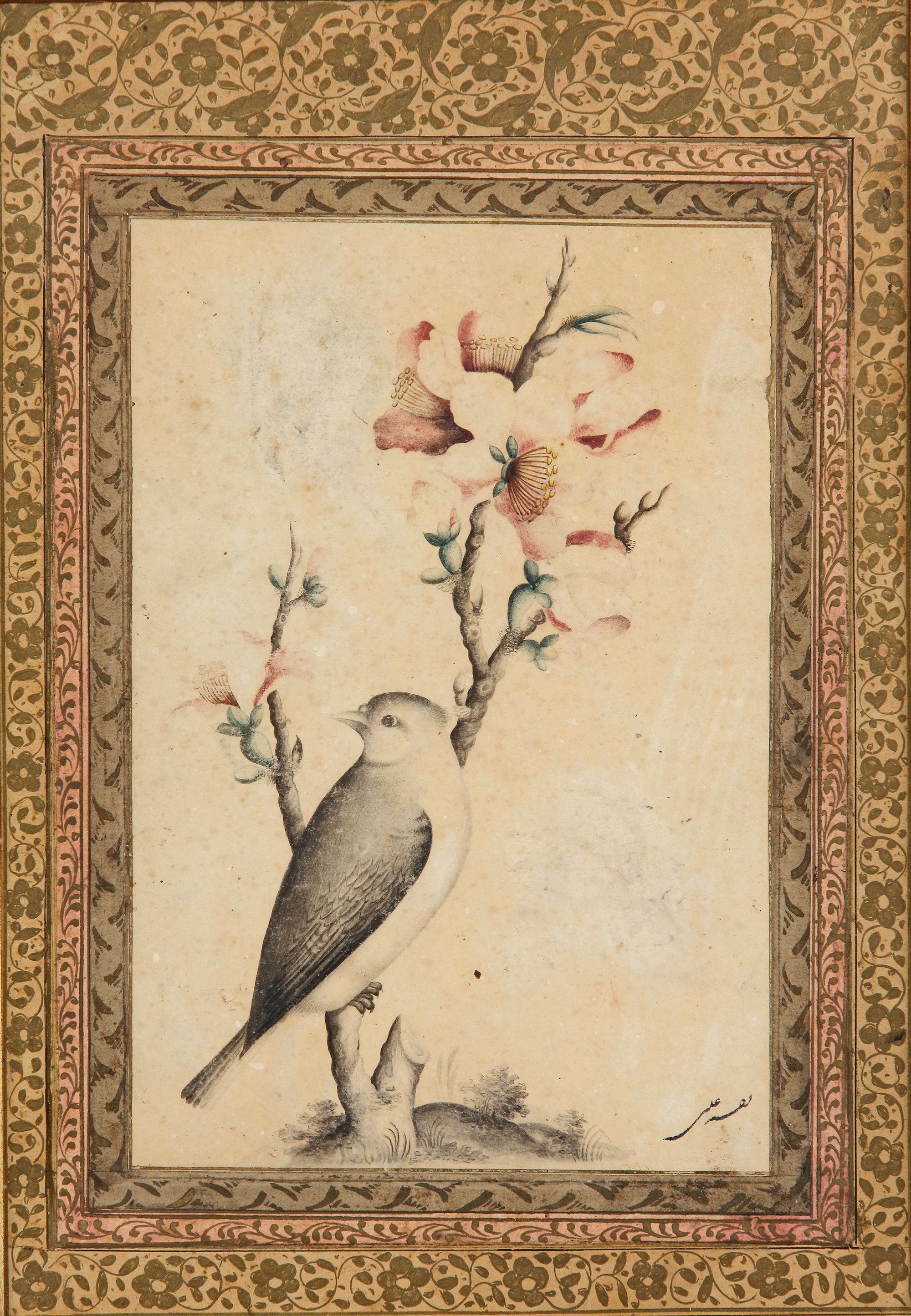 Opaque watercolor on cream paper, provides a naturalistic depiction of a bird perched on a flower spray with great details. 19 by 27.5 cm.