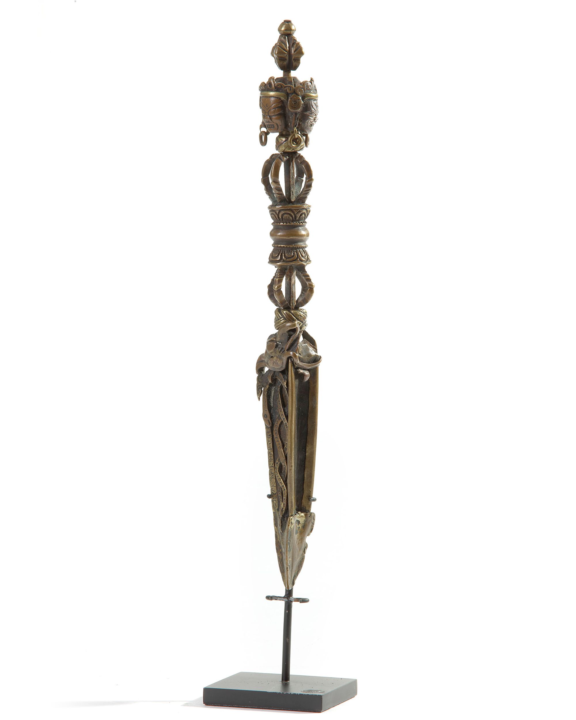 The phurbu is delicately fashioned in various metals and with articulating sections. The handle consists of three faces leading to an openwork vajra which sits atop a three-flanged blade decorated with a bird head and an entwined snake. With a metal stand.