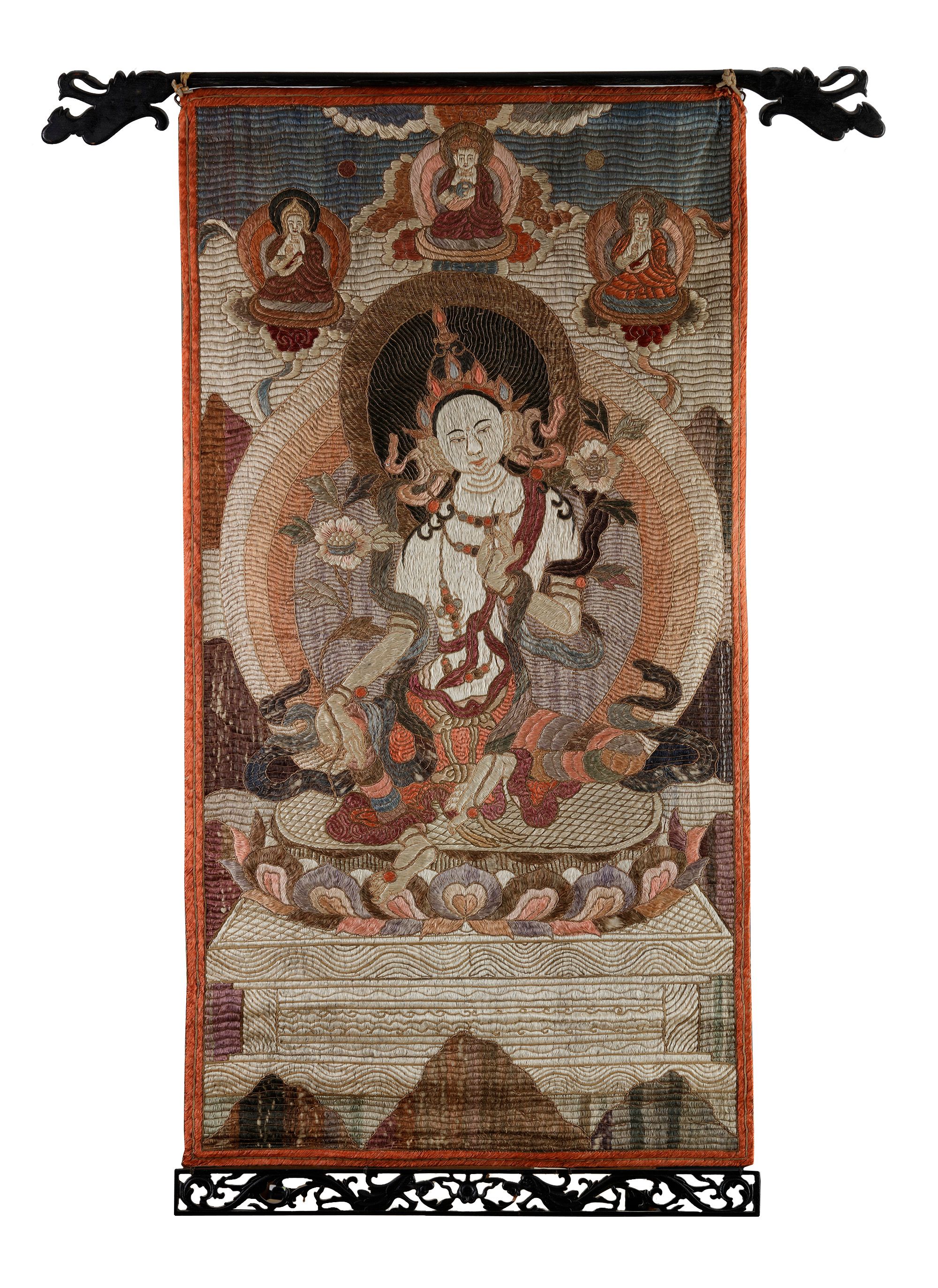 The thangka is embroidered depicting Green Tara seated on a single lotus throne, with both hands holding lotus stems, her left hand in abhayamudra and her right hand in varadamudra. She is depicted below three Lamas each seated in dhyanasana on single lotus thrones. The scene is highlighted with couched gilt threads.