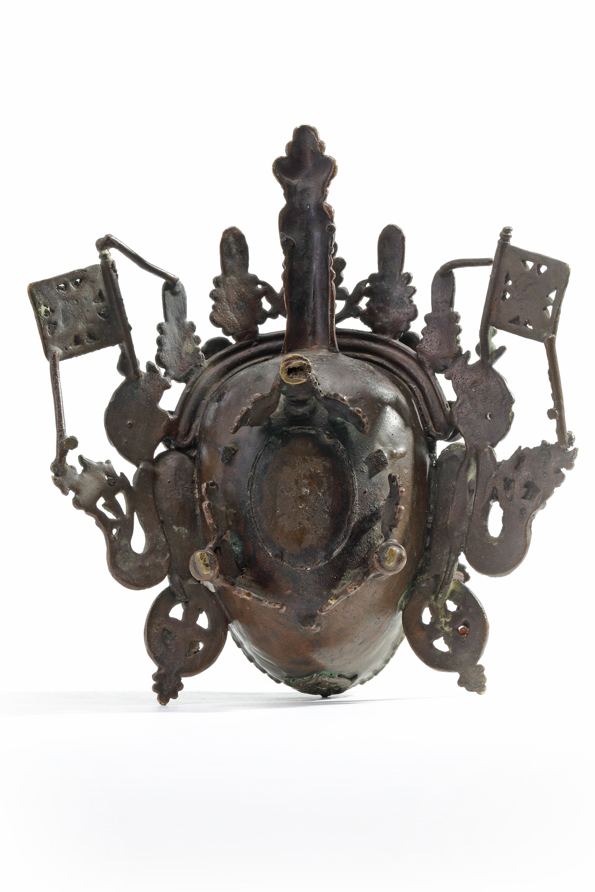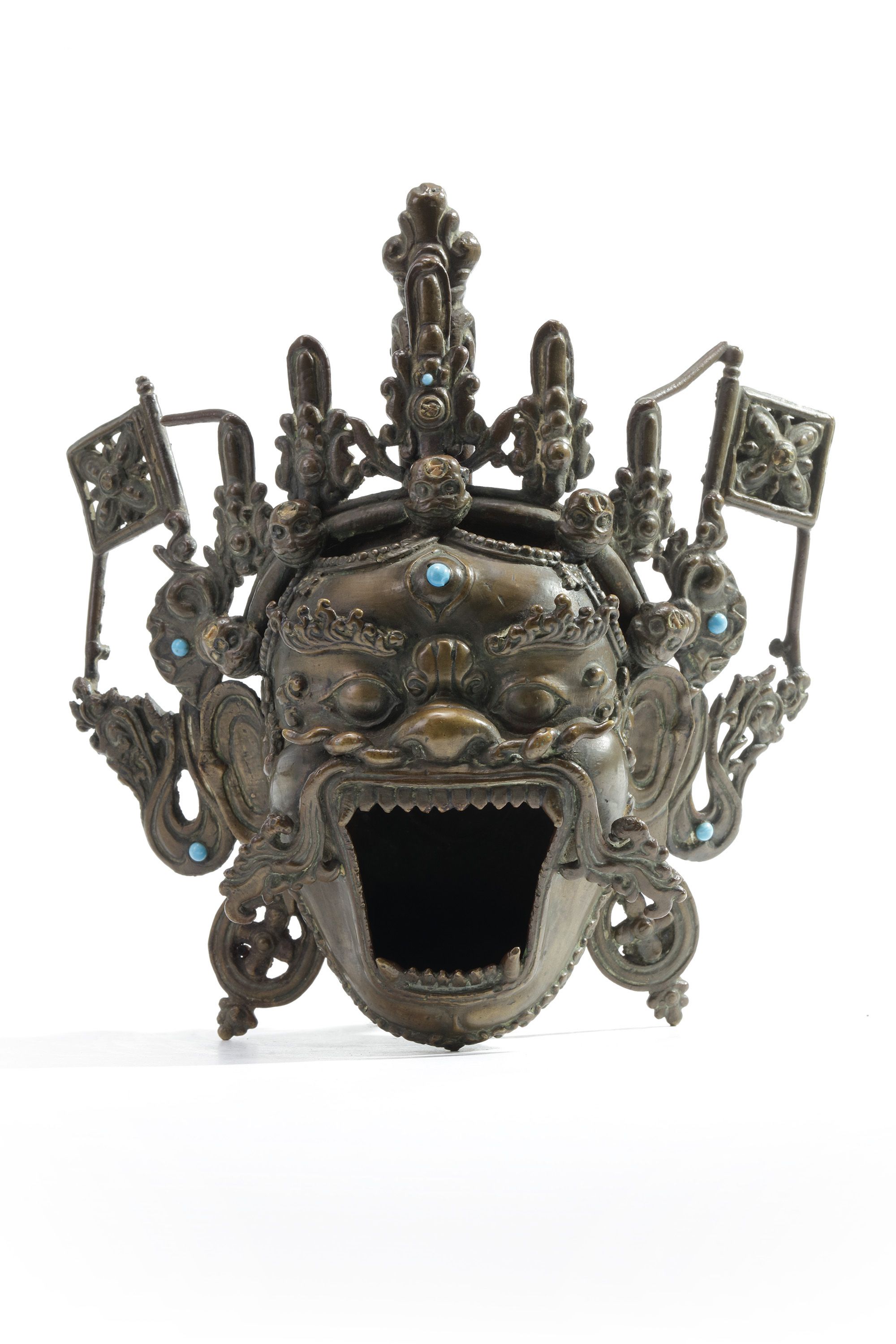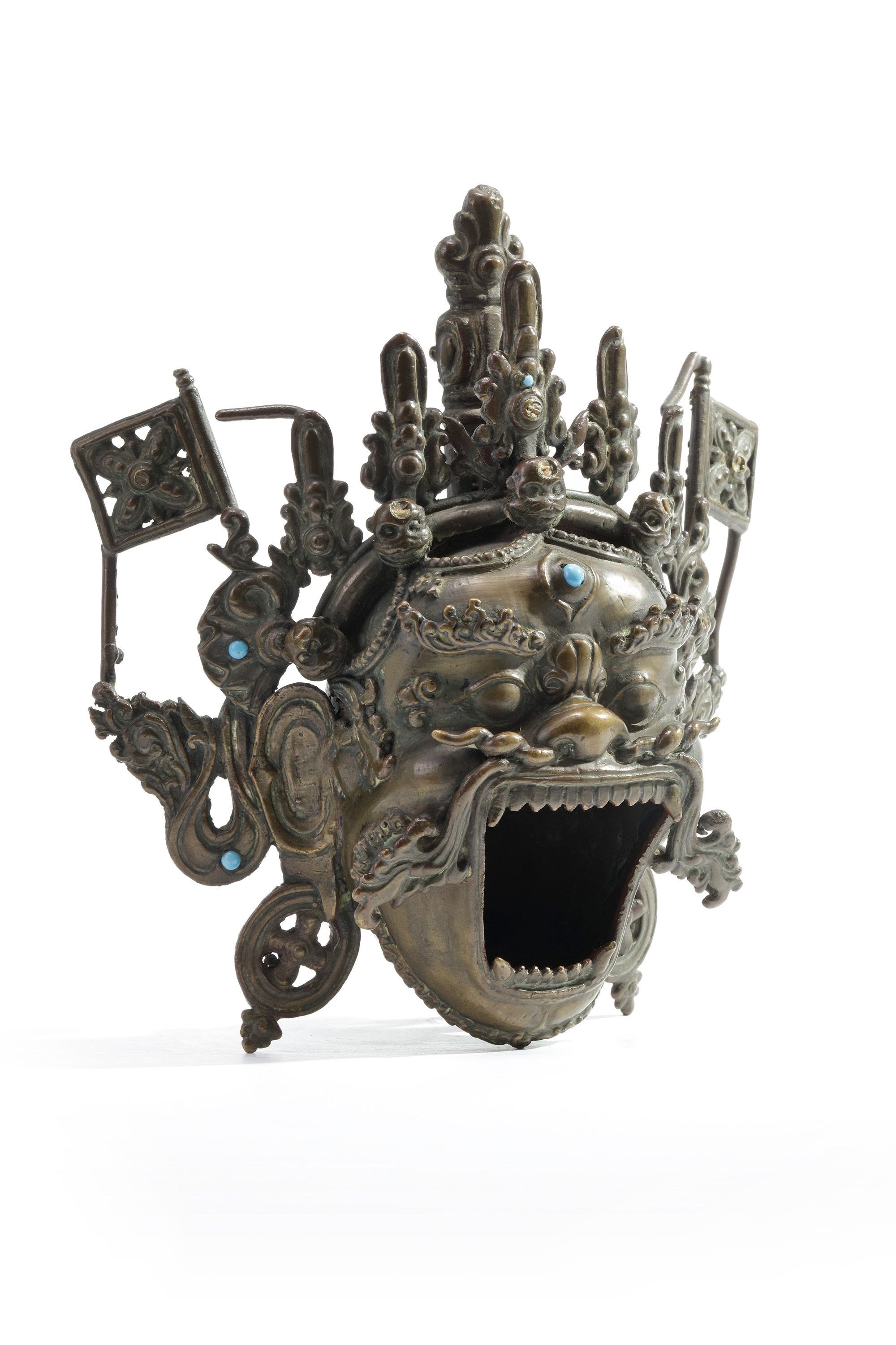 The water pot is shaped as the head of a fierce Mahakala, with the open mouth forming the vessel. The head is finely modelled with two wheel-shaped earrings hanging from pendulous earlobes all below a five-pointed diadem decorated with skulls. The head is decorated with small blue glass inlays. 25 by 21 cm.
