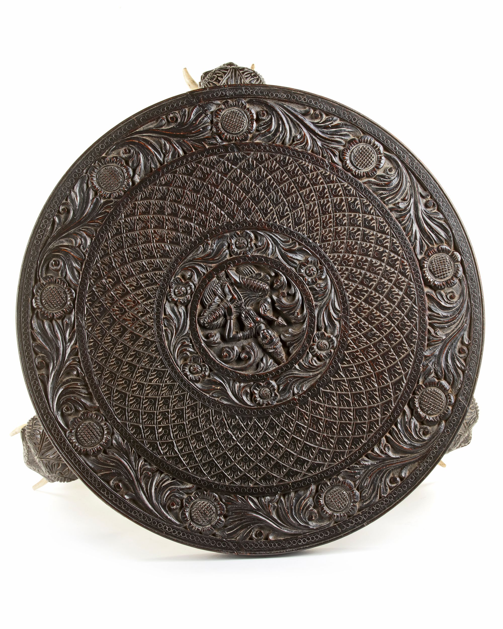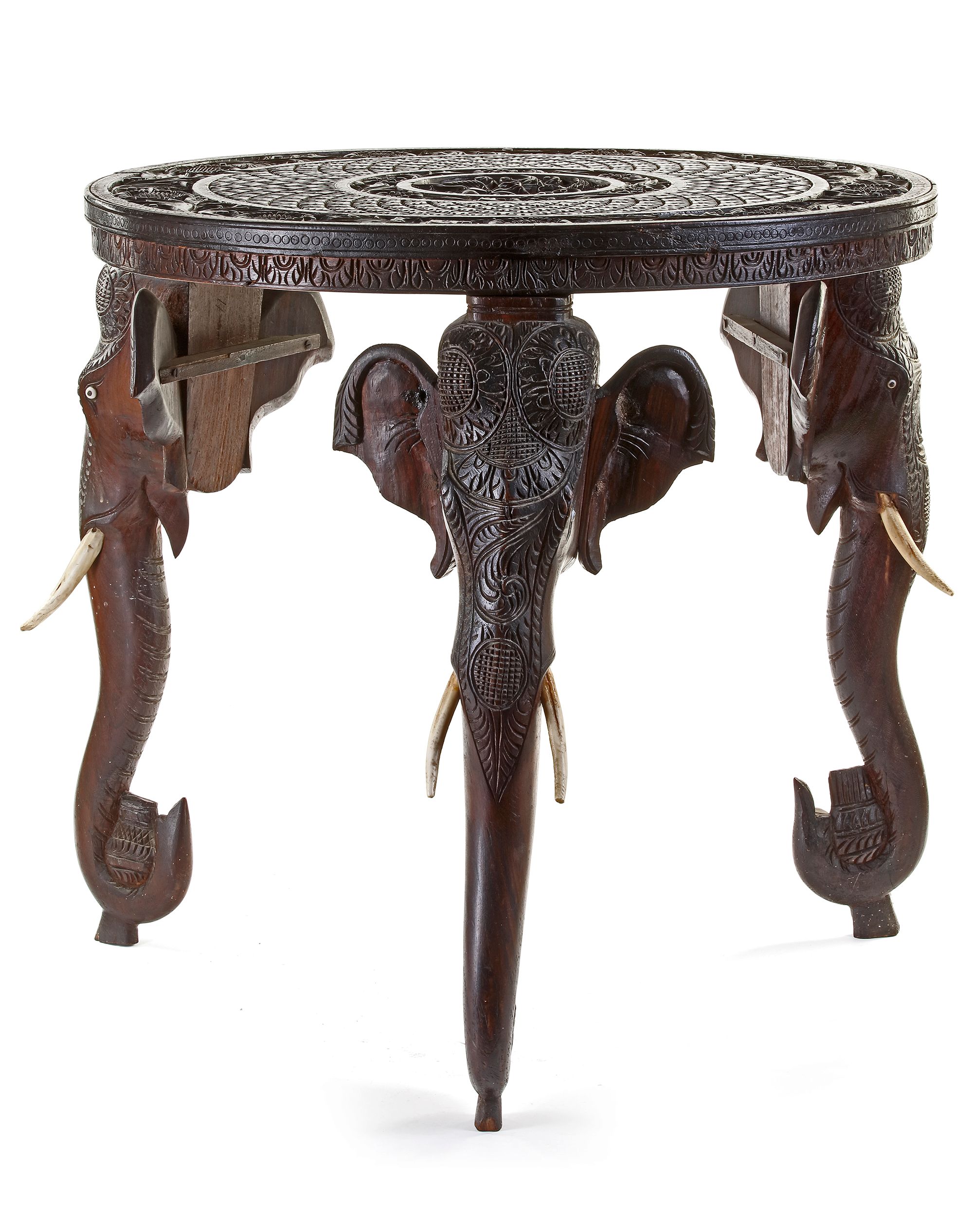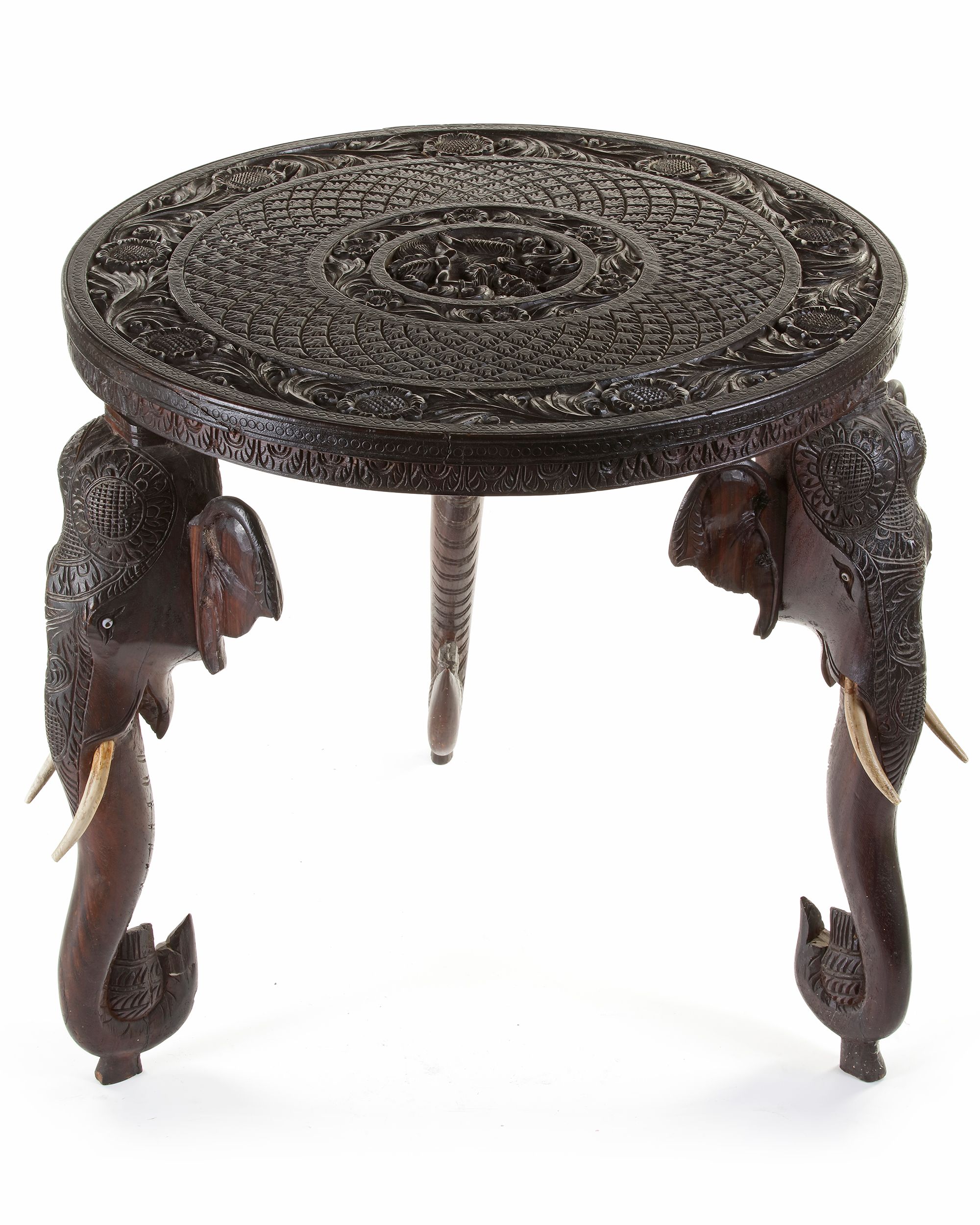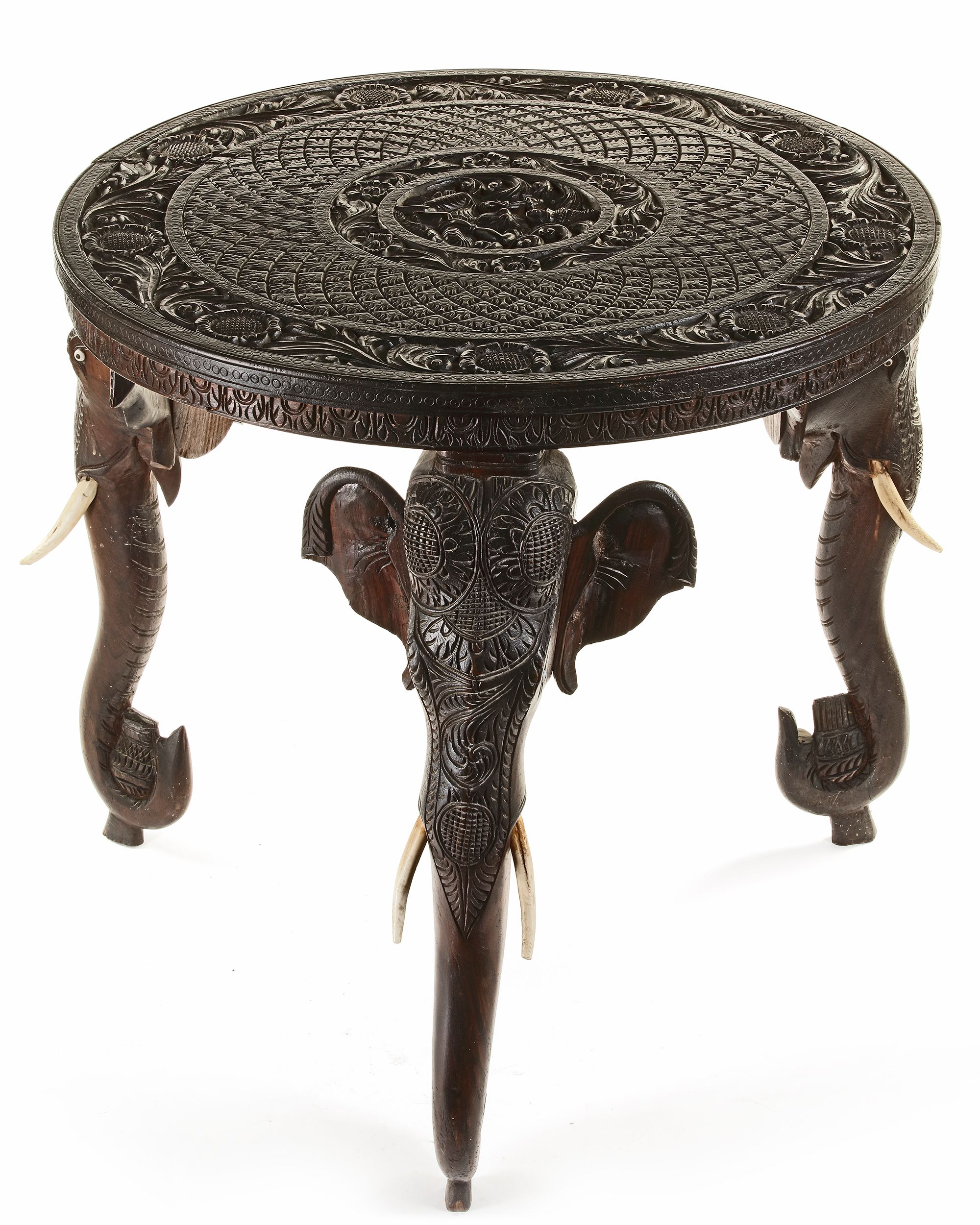 The oval top deeply carved with floral motifs, the knees and legs realistically carved as elephant heads, with ivory tusks.