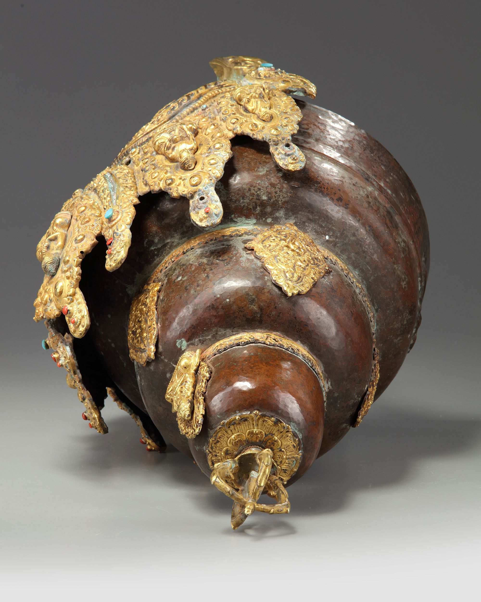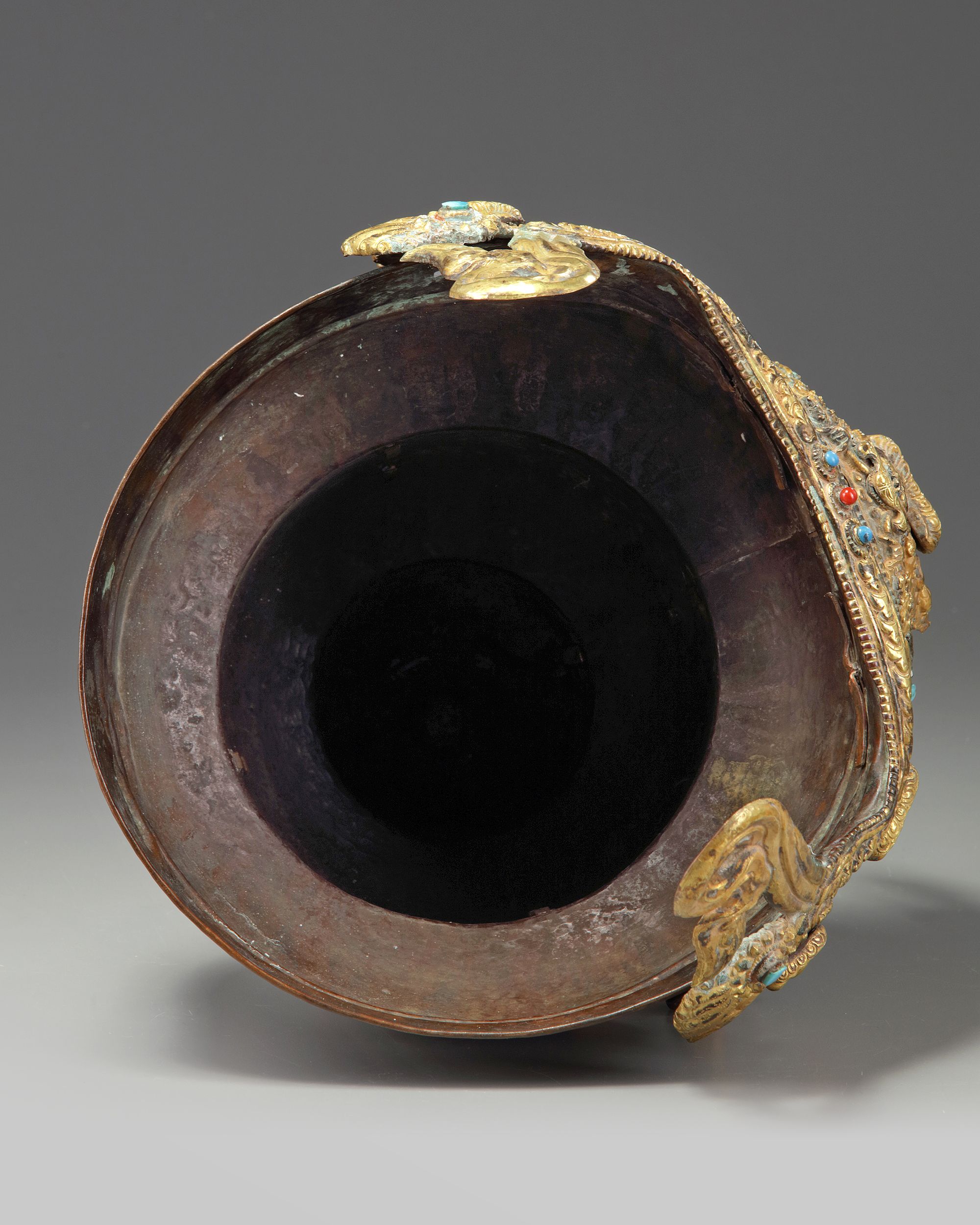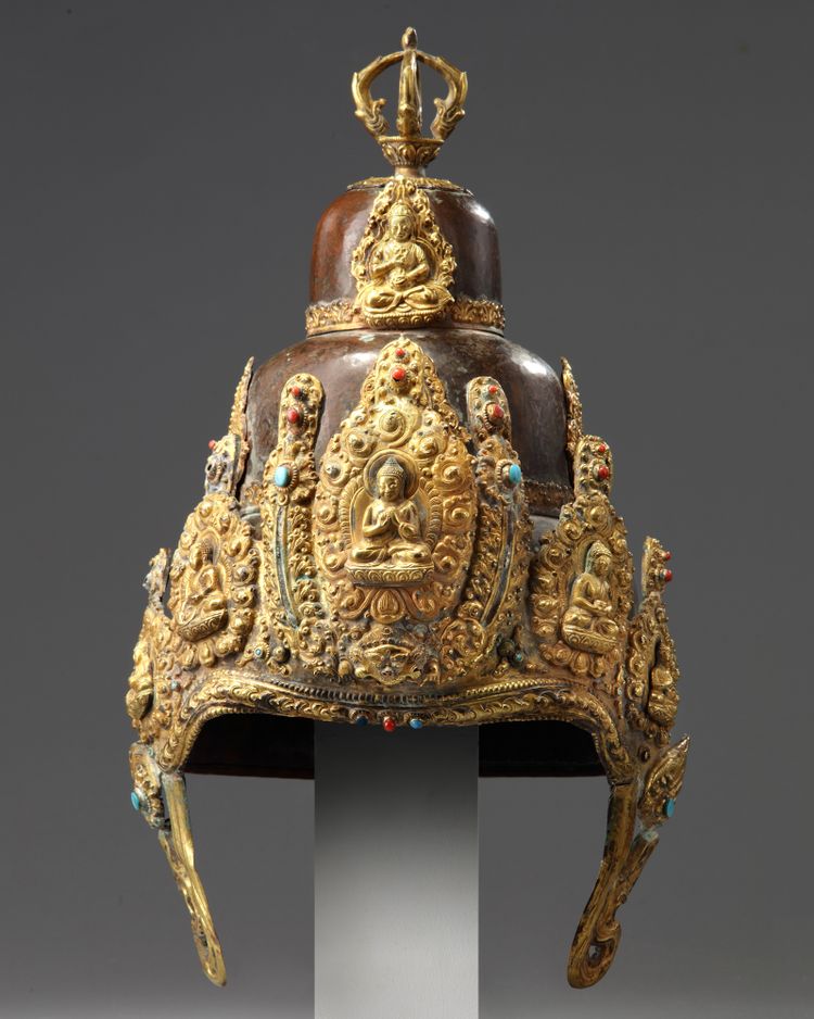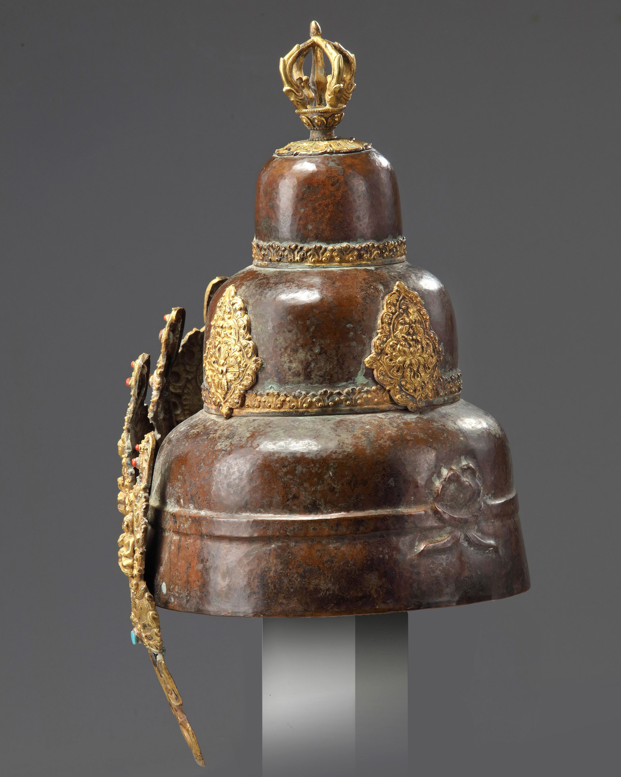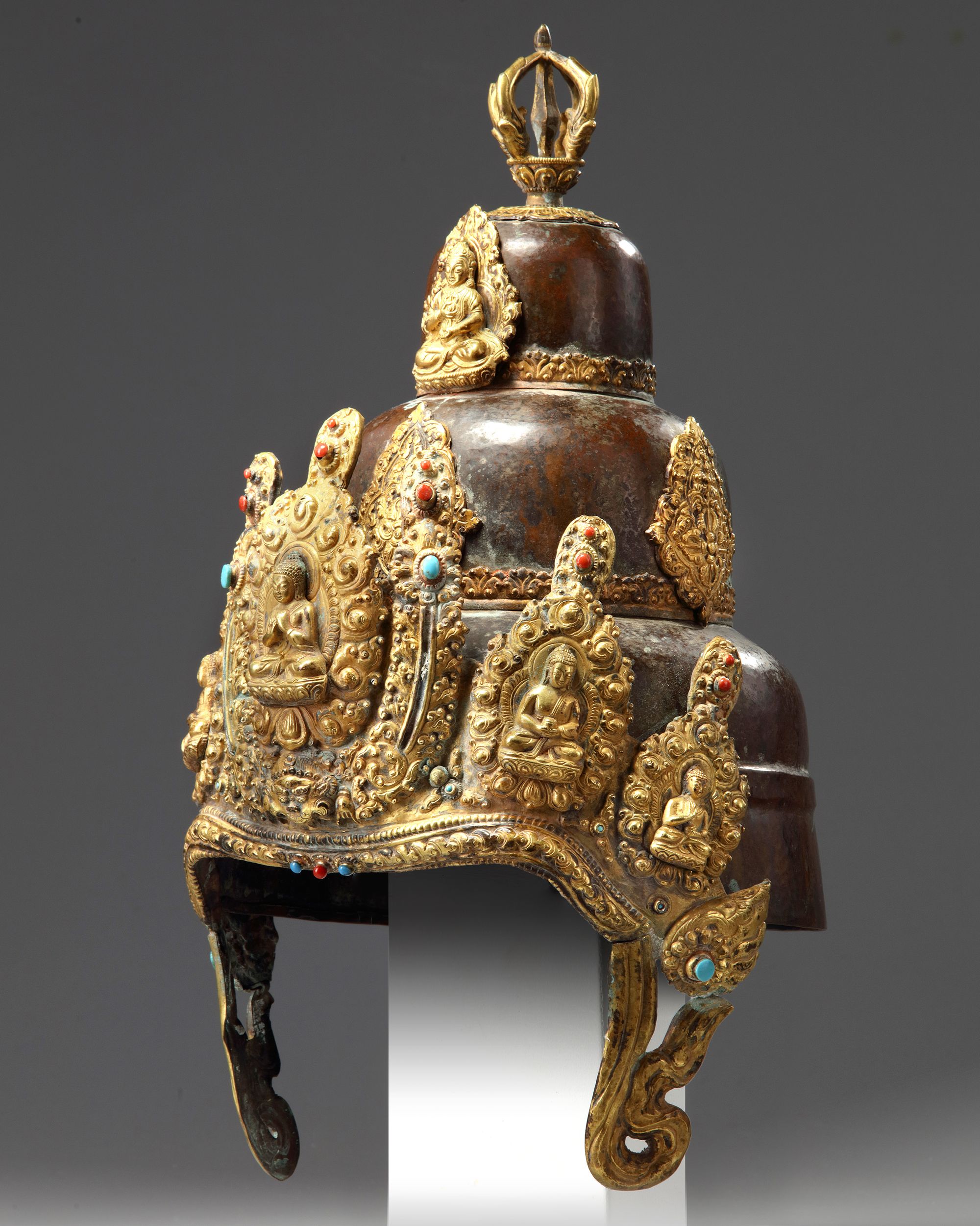The crown is cast in three stepped sections surmoutned by a vajra. The front edge is decorated with a foliate rim with three gilt copper seated Buddhas before flaming mandorlas and foliate scrolls. The next step is decorated with a further Buddha. The gilt copper panels are decorated with various inlays.