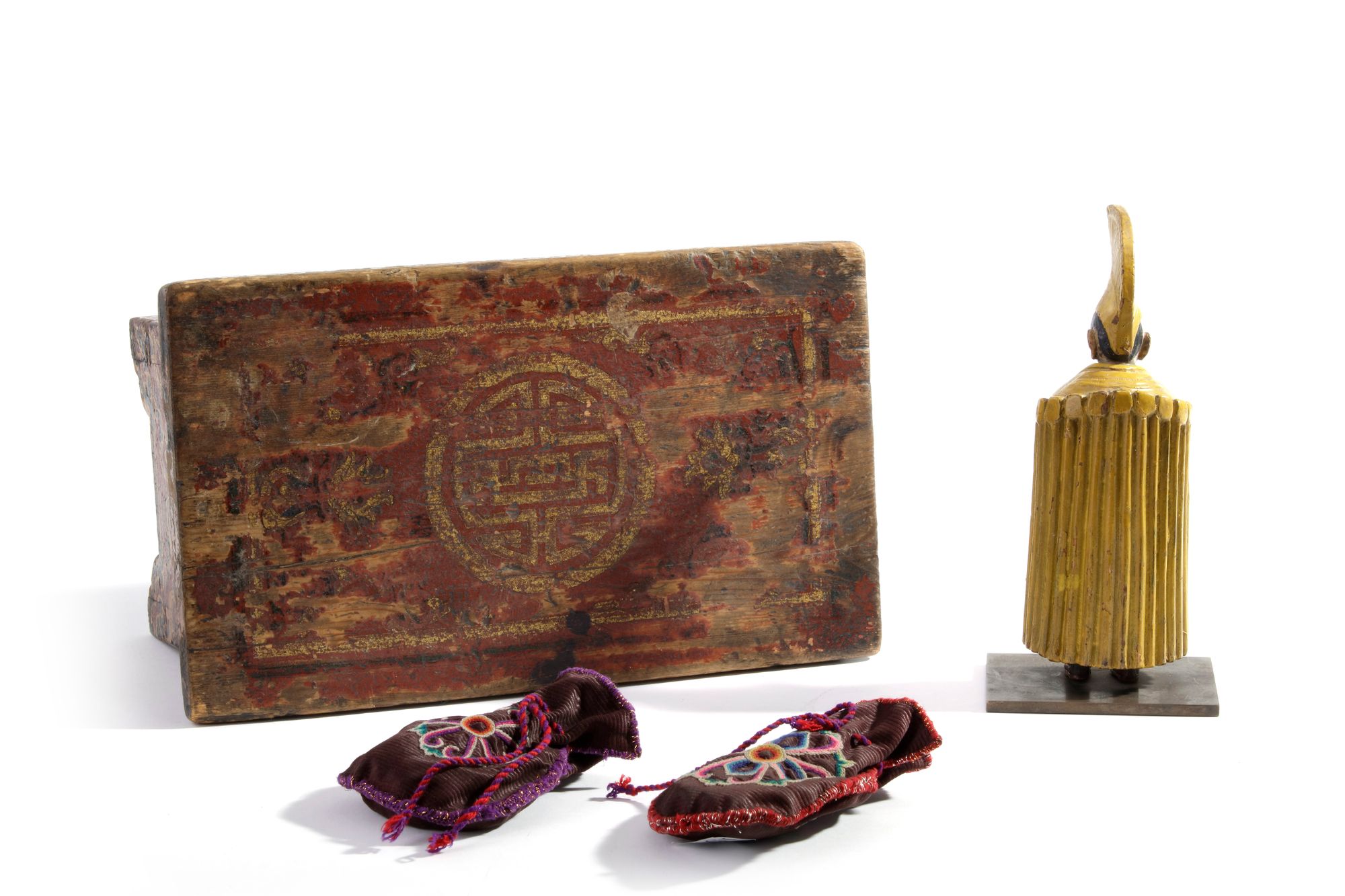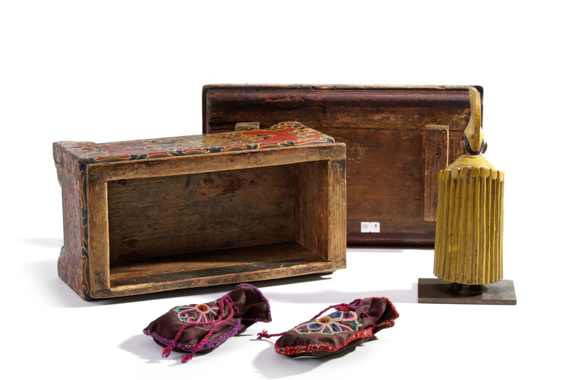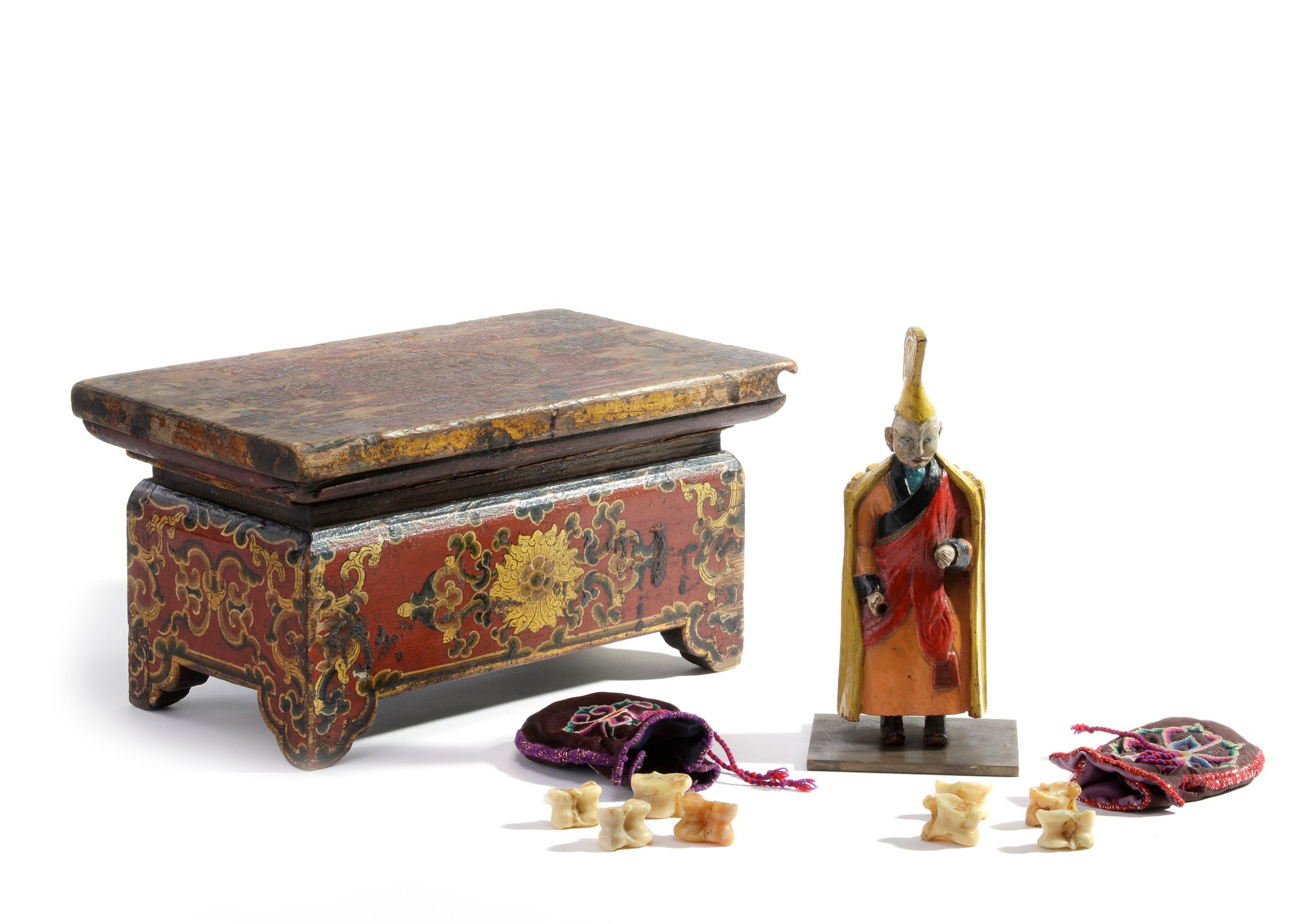 The wooden offering table stands on four ruyi-shaped legs with a removable cover. It is decorated and gilt to the sides with lotus and foliate scrolls. The polychrome-decorated wooden figure of a Lama is crafted wearing a monk's robes, a yellow hat and a shawl. He holds one hand out and one hand by his side. The statue is fixed on a bronze stand. The two embroidered bags are each embroidered with a floral design and each contains four bone astralagus. 16.5 by 32 by 19 cm.