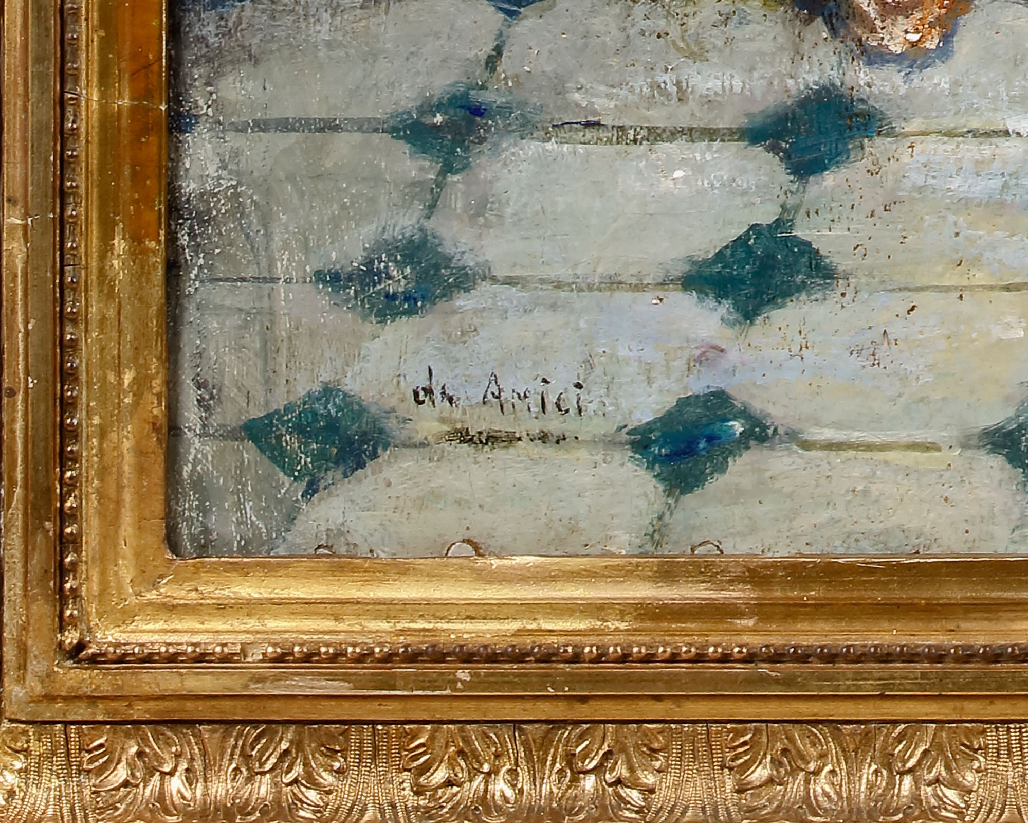 A in a gilded wood framed oil on canvas painting, representing a man in an oriental interior with decoration (blue zelliges), traditional clothes, vase and a terracotta pot. Beautiful colors, signed by DU. AMICI. Late19th century, Napoleon III periode. H 83 cm. L 65 cm. H 67 cm. D 49 cm. Perfect condition.