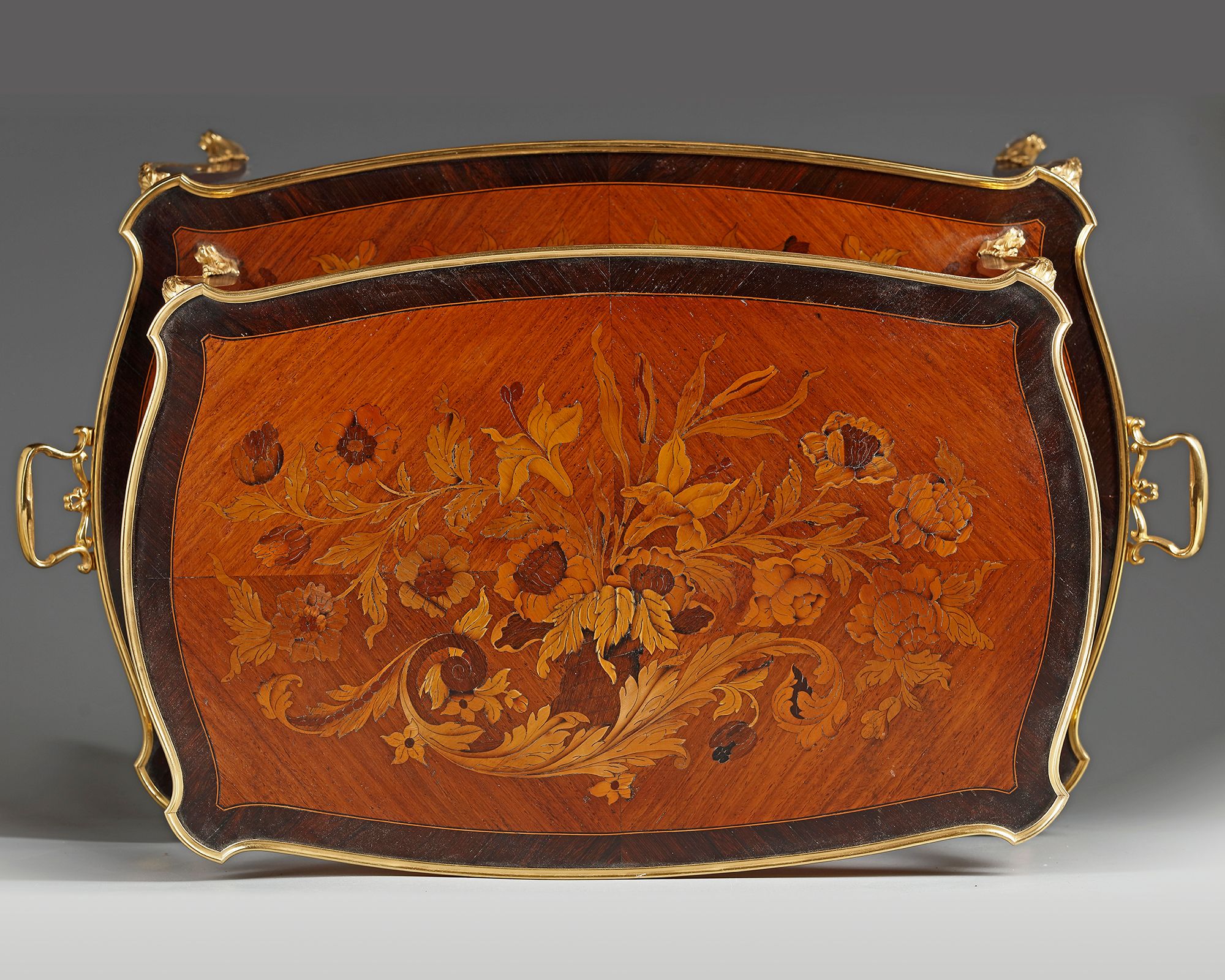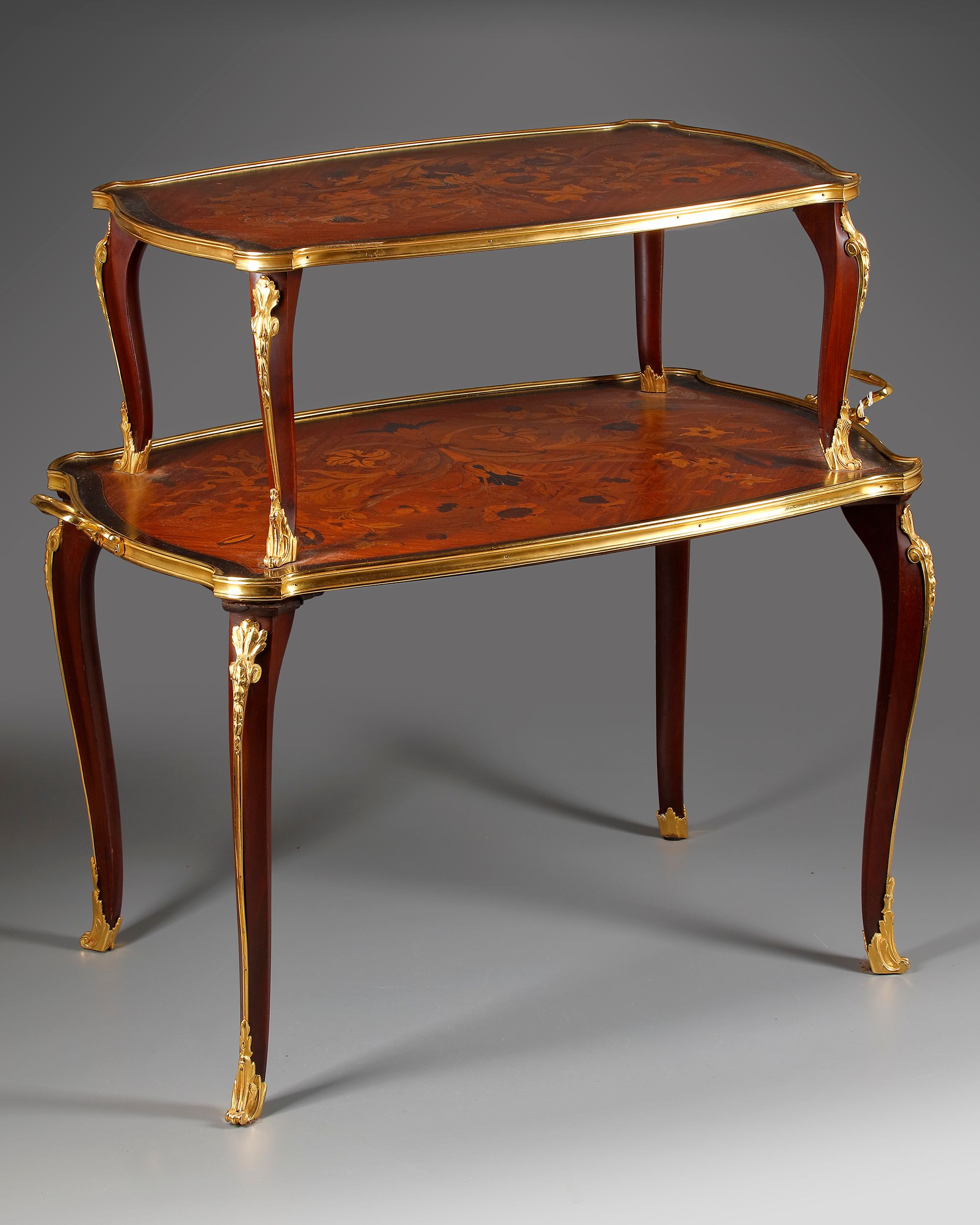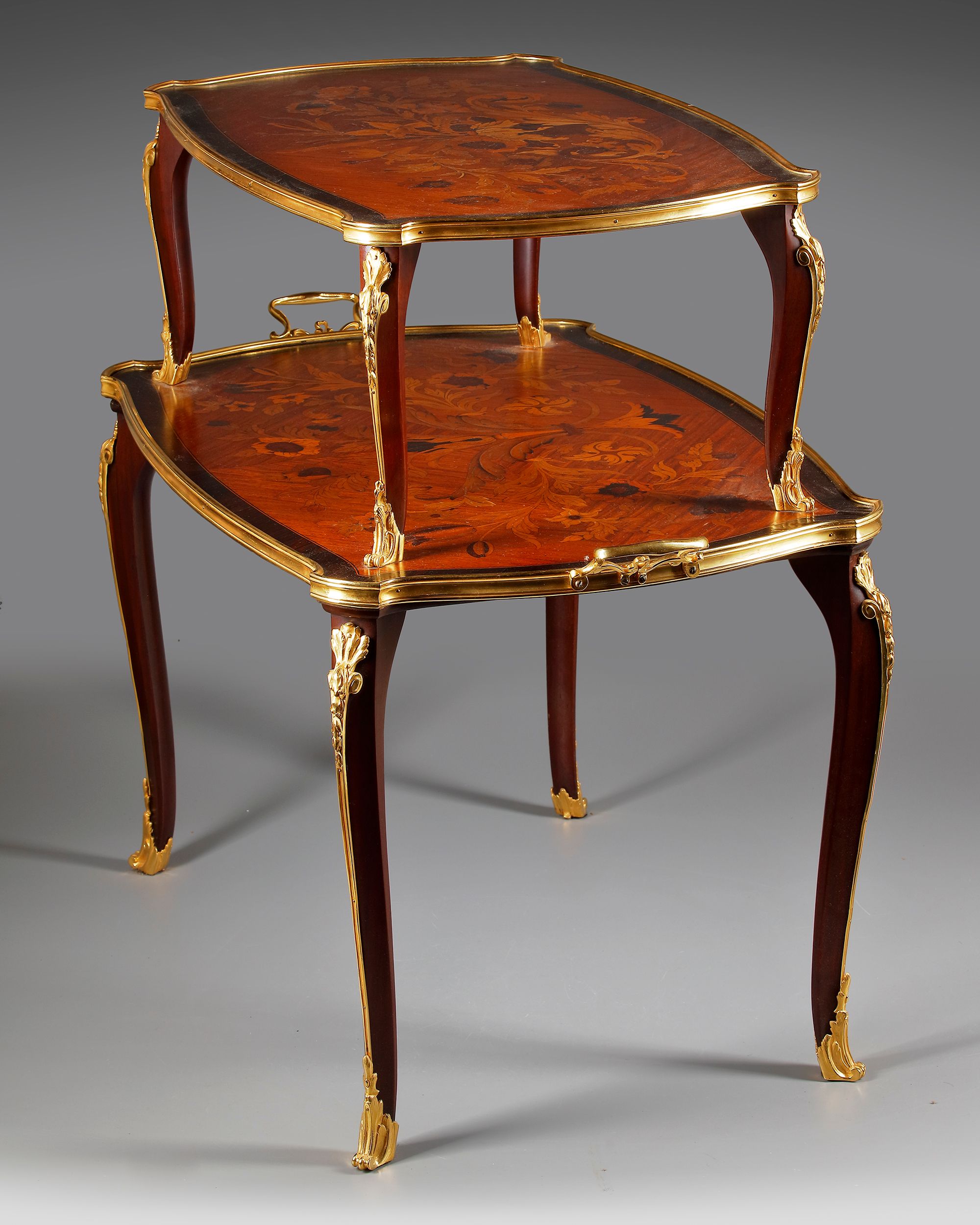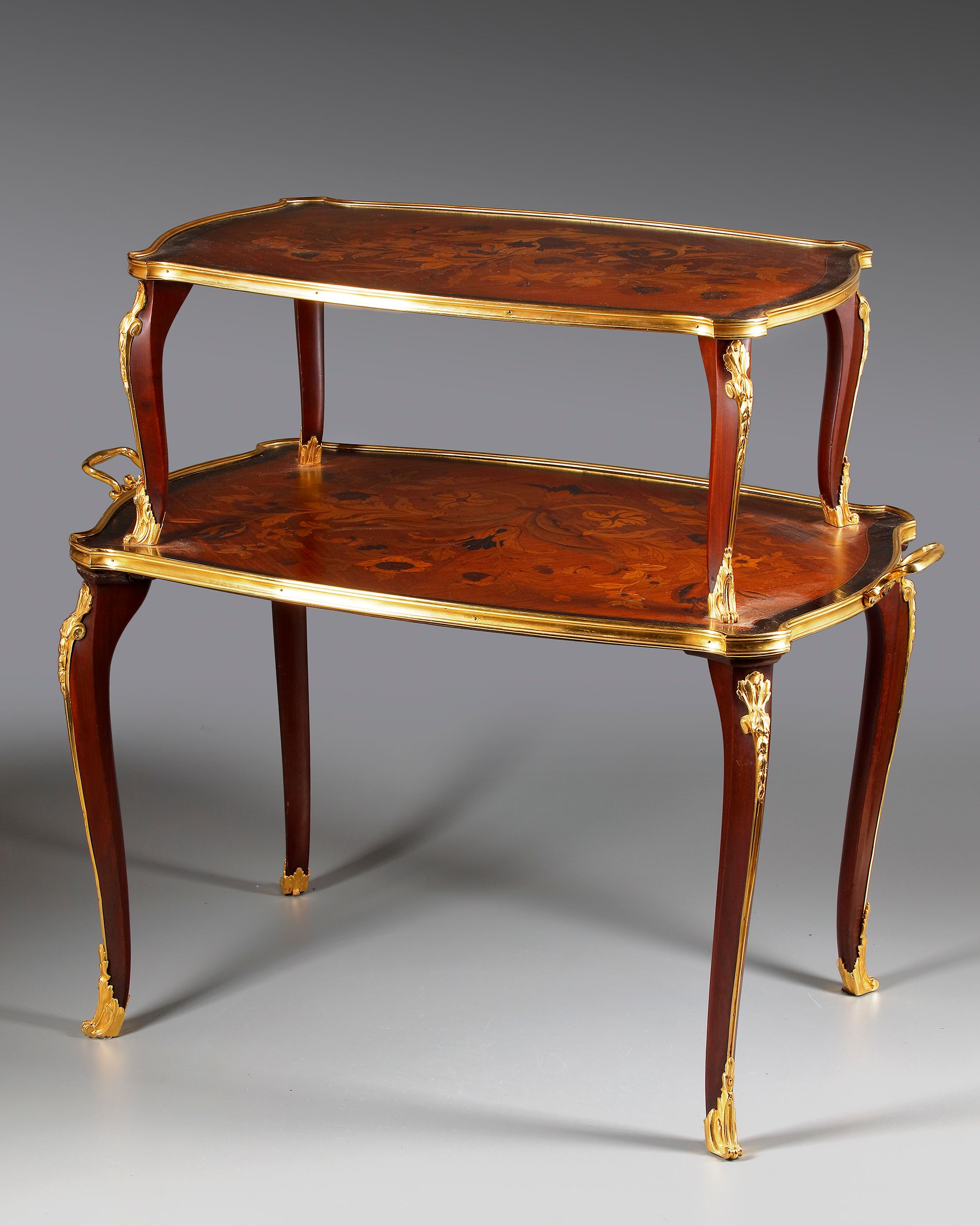 Louis XV style double tray curved tea table, with rosewood veneer and floral marquetry. Decorated with gilt bronze handles.