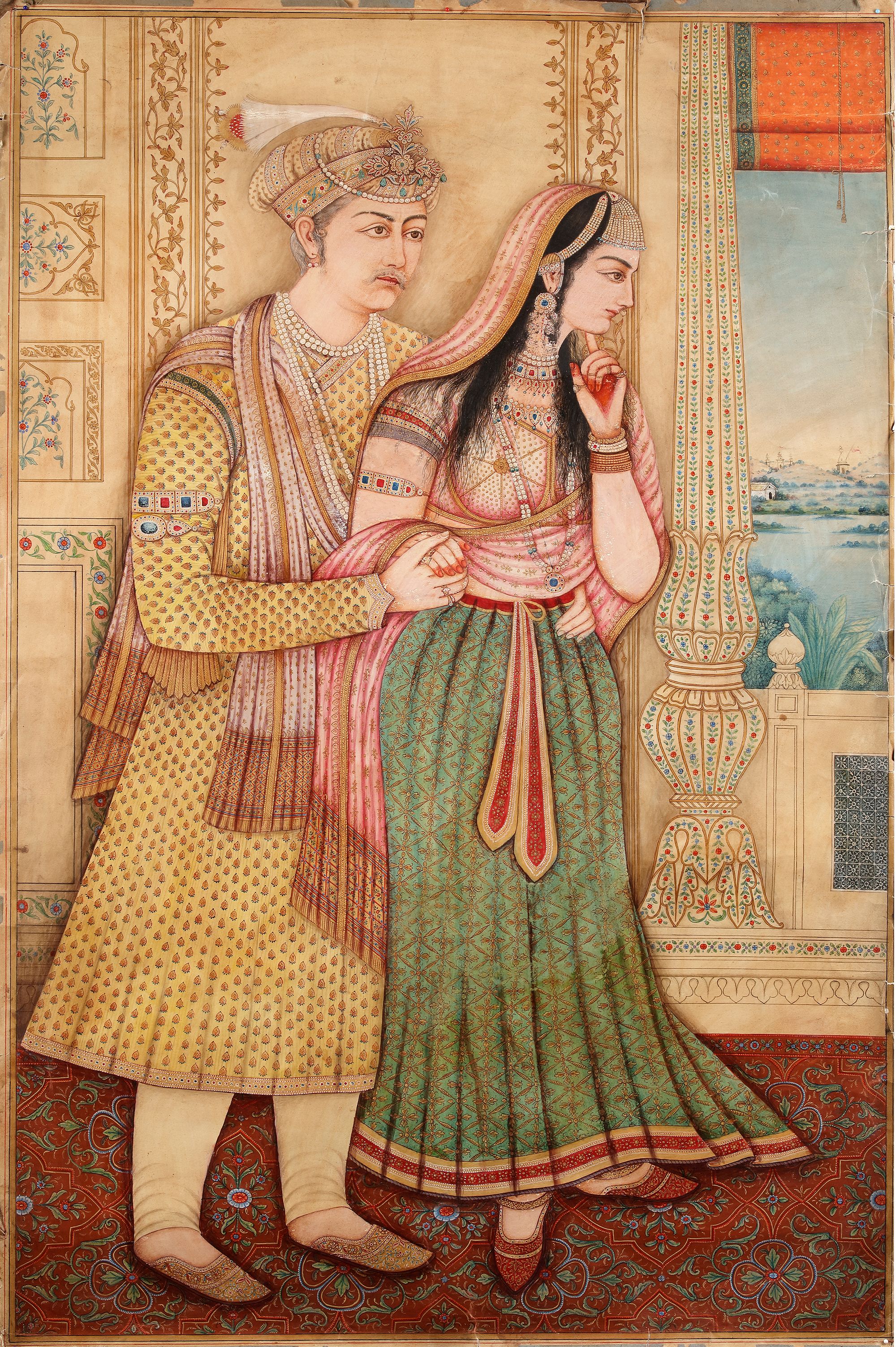 A LARGE INDIAN PORTRAIT OF AN ARISTOCRATIC COUPLE, 19TH CENTURY