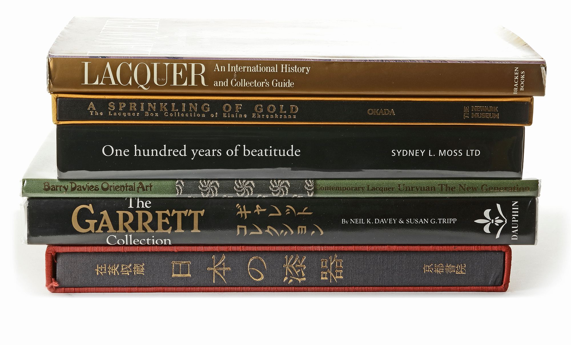 "Dean, M. & H. Japanese Lacquer - an Exposition by M. & H. Dean. Tokyo: Kyoto Shoin, 1984. First edition. 221 Pages, 141 colour illustrations, text in Japanese with list of plates and captions in English, silk slipcase. An important catalogue of a private collection of lacquer formed in a time frame of 10 years. A great number of netsuke are also illustrated and described. A beautiful work! Okada, Barabara. A Sprinkling of Gold: The Lacquer Box Collection of Elaine Ehrenkranz. Newark: Newark Museum, 1983. First edition. 144 Pages, 56 items illustrated, many in colour, glossary, bibliography, index. Catalogue of an exhibition of Japanese lacquer box collection of Elaine Ehrenkranz at the Newark Museum. The essays discuss how Japanese lacquer boxes are made, their materials, techniques, and evolution throughout the periods. Bourne, Jonathan et al. Lacquer - An International History and Collectors Guide. Wiltshire: Crowood Press, 1984. First Edition. 256 Pages, fully illustrated in colour and black and white. A very interesting and useful work on all matters concerning lacquer, from all countries. From the Oliver Impey Library. Tripp, Susan G.; Davey, Niel K. The Garrett Collection of Japanese Art: Lacquer, Inro and Netsuke. Oxford, United Kingdom: Dauphin Publishing (Oxford) Ltd, 1991. First Edition. 325 Pages, 480 illustrations, 230 in colour, text in English and Japanese, glossary, bibliography. An exclusive publication on the Garrett Collection, one of the earliest and most distinguished American collections of Japanese lacquer, inro, and netsuke. Barry Davies Oriental Art. Contemporary Lacquer - Unryuan, The New Generation. London: Barry Davies Oriental Art, 1993. First edition. 46 Pages, 28 objects illustrated in full colour, black and white illustrations. Glossary. Unryuan is a contemporary lacquer artist who works in traditional techniques but with the addition of his own genius. Exhibition catalogue from Barry Davies Oriental Art. Moss, Paul et al. One Hundred Years of Beatitude: A Centenary Exhibition of Japanese Art. London: Sydney L. Moss Ltd., 2011. First edition. 372 Pages, approximately 250 colour illustrations. One Hundred Years of Beatitude surveys varied highlights of the Sydney L. Moss gallery’s idiosyncratic taste across aspects of mostly Edo period painting, calligraphy, sculpture, lacquer, netsuke and the smoking paraphernalia of “tonkotsu” and tabakoire. It contains an unmistakable flavour of the Chinese influence and especially of a Confucian content in Japanese art, in both literary and socio-political regards. The survey begins with twenty-plus paintings and calligraphies. The most important focus of the book is that on Ogawa Haritsu (1663 - 1747) alternatively known as Ritsuo, a poet, painter, sculptor, ceramicist, metalworker and printmaker, but best known both in the West and Japan as a lacquerer and inlayer. Illustrated and discussed here is the most remarkable group of paintings, sculptures and lacquer-inlay works viewed together since the contents of Tsugaru Castle were dispersed in the early 20th century. Four essays discuss Ritsuo in some depth, one of those extensively illustrated, another the first English translation of Professor Akio Haino’long “Nihon no Bijutsu” essay on the artist. Scattered among the introductory essays will be found translations of all Ritsuo’s known haiku."