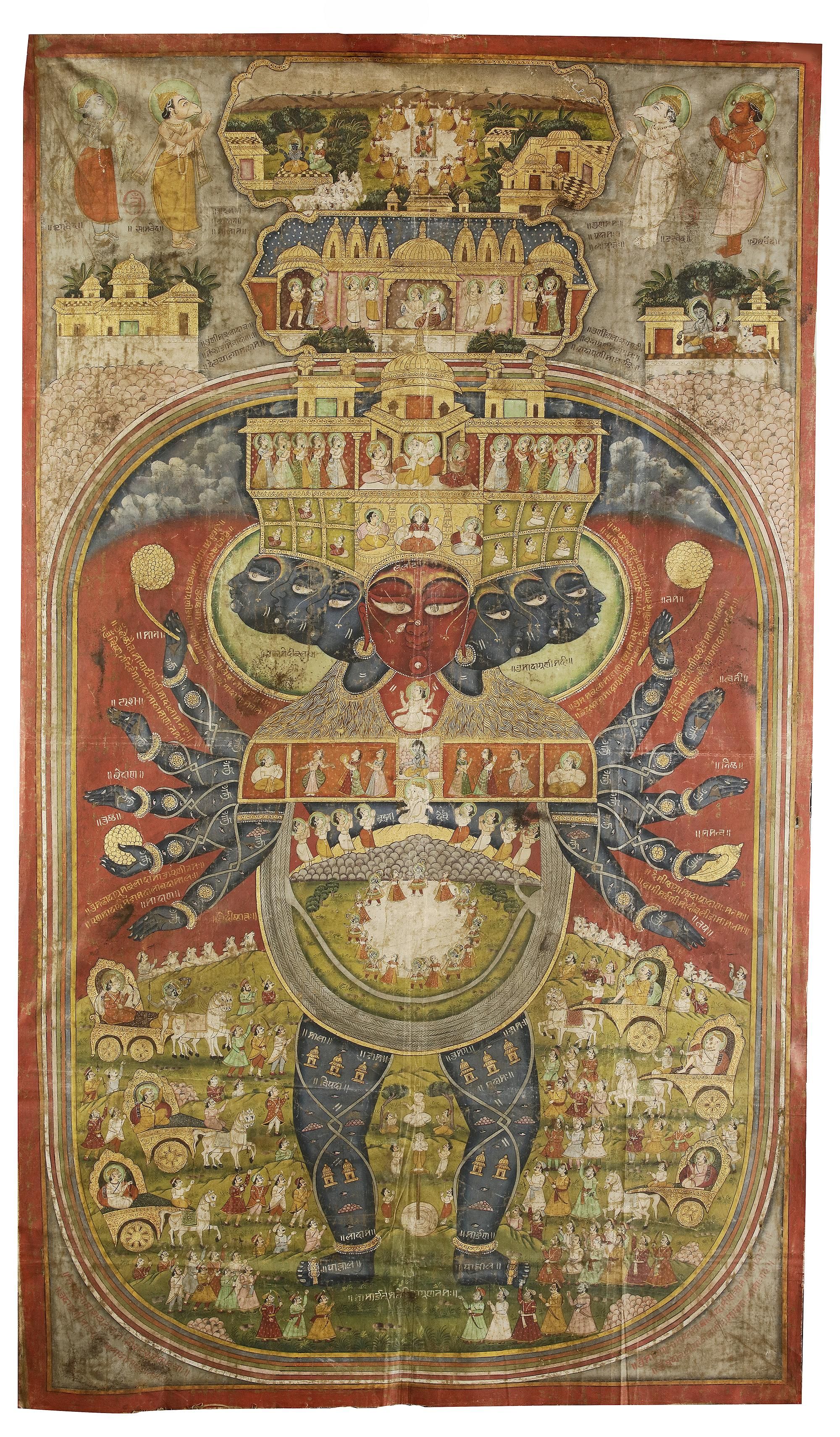Virat Swaroop Picchavai, painting is intricately painted with the Vishvarup or Virat Swarup of Lord Krishna. It depicts the famous scene from the battle of Kurukshetra in the Mahabharat between Pandavas and Kauravas, where Lord Krishna simplifies the knowledge of the Bhagavada Gita. Here Lord Krishna is shown as a Cosmic Man. He is portrayed as the man engulfing the whole Universe with Upper as well as the Nether worlds. 173 by 76.5 cm.