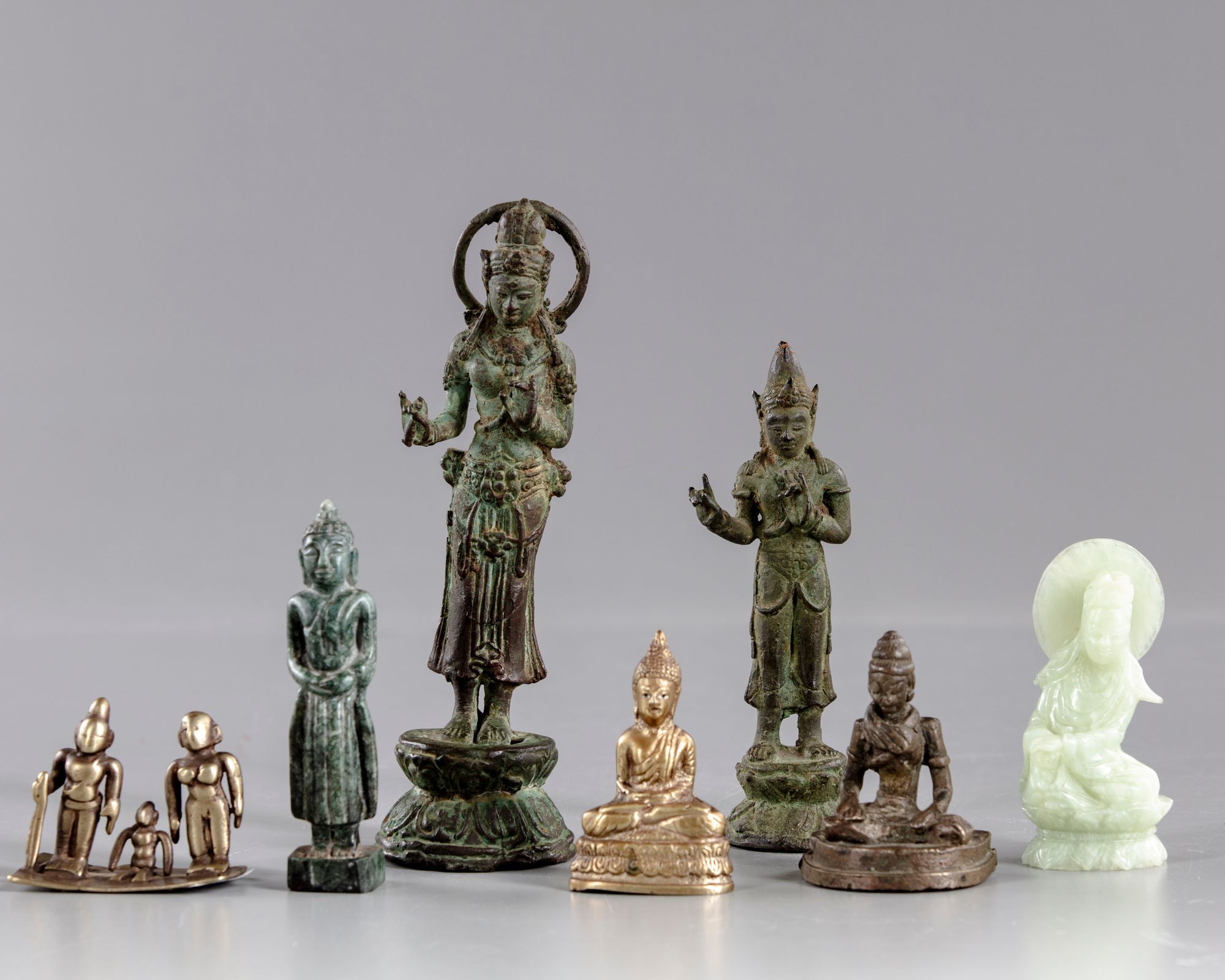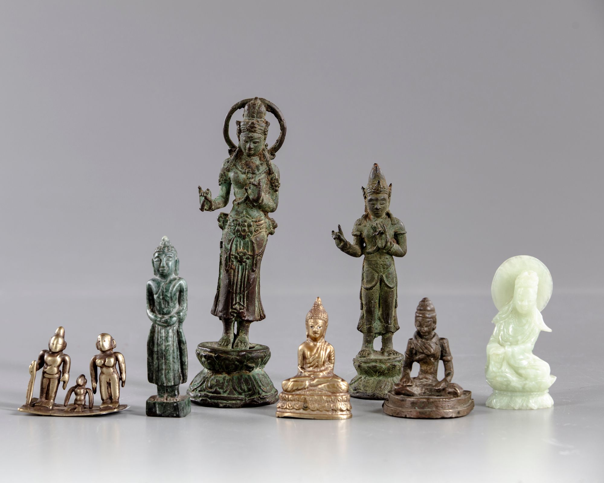 - Two jade figures and three small figure on a stand, 8-10cm.