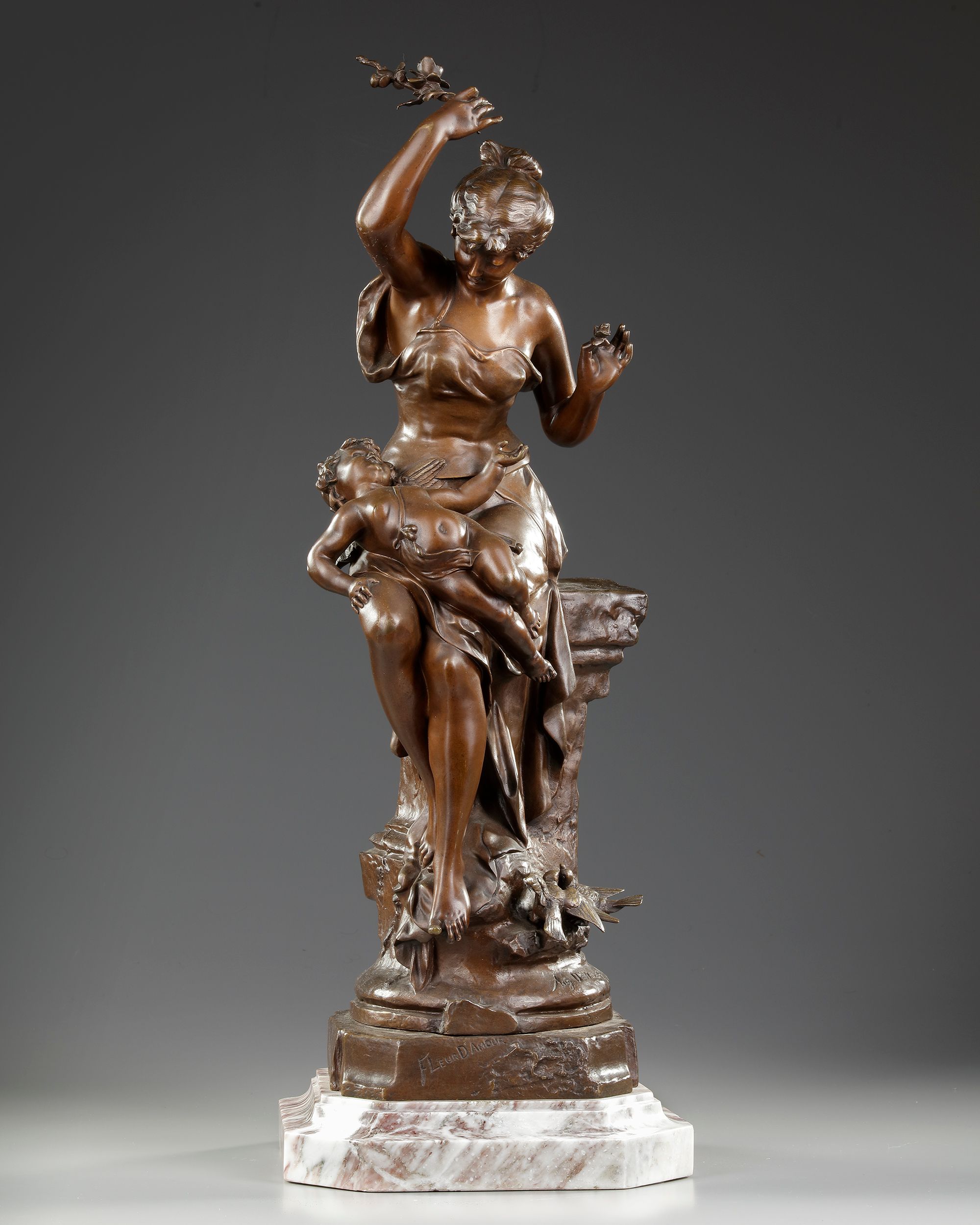 A magnificent bronze with brown patina representing a woman and a cupid, firefighting school.