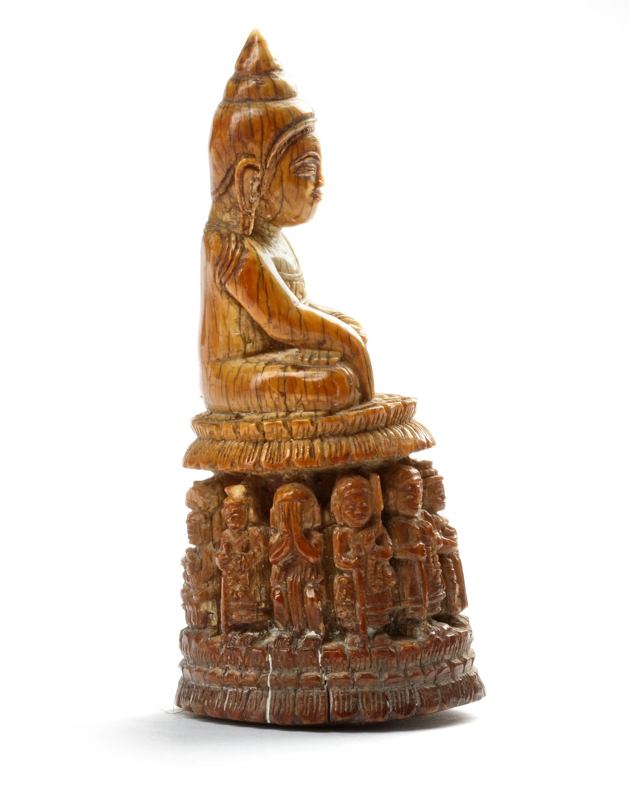 A Thai ivory figure carved in dhyanasana on a lotus base supported on eleven smaller figures, the right hand extended in bhumisparshamudra and the left in dhyanamudra, wearing a shawl draped over the left shoulder, the serene face with downcast eyes and meditative expression. 11.5 cm.