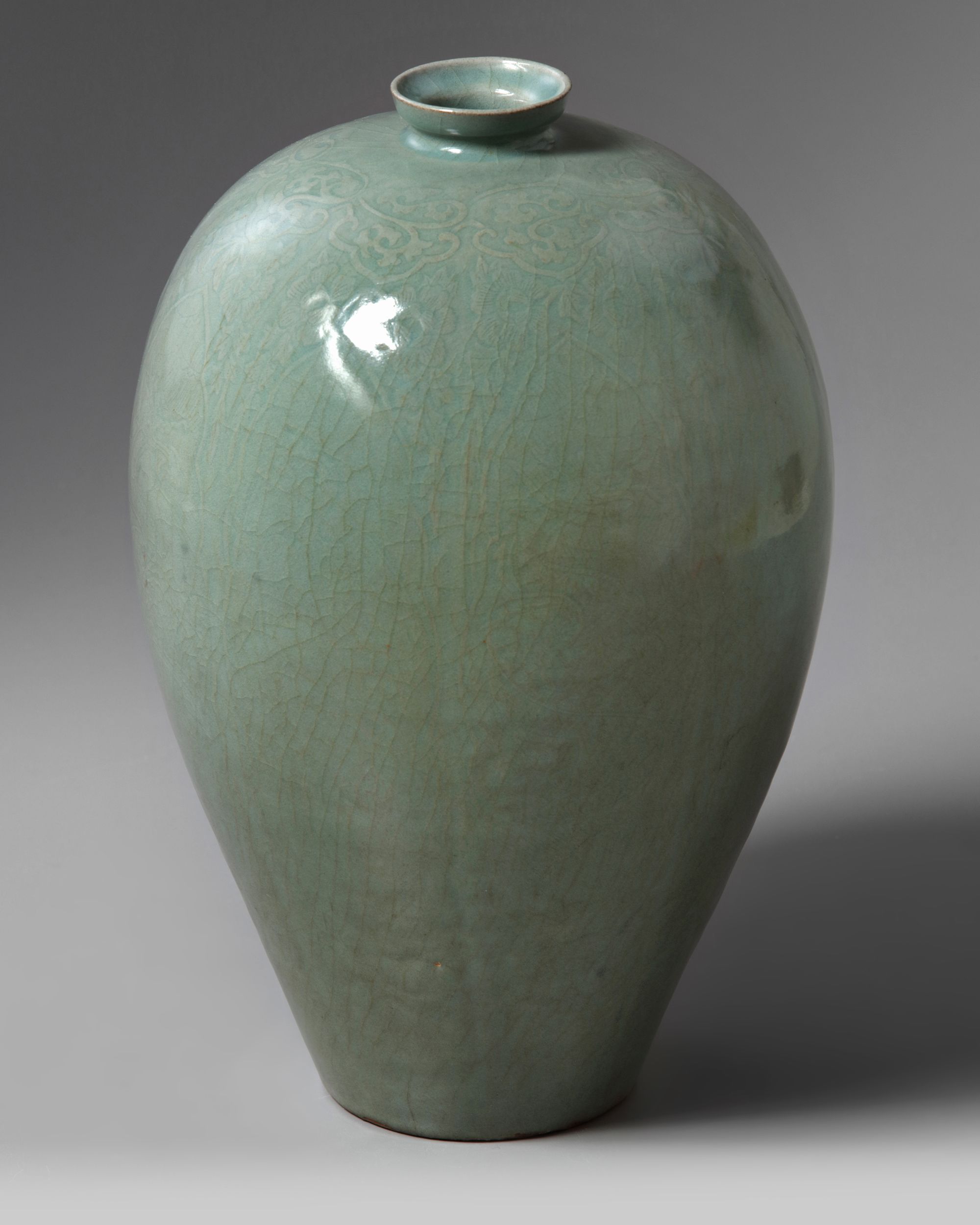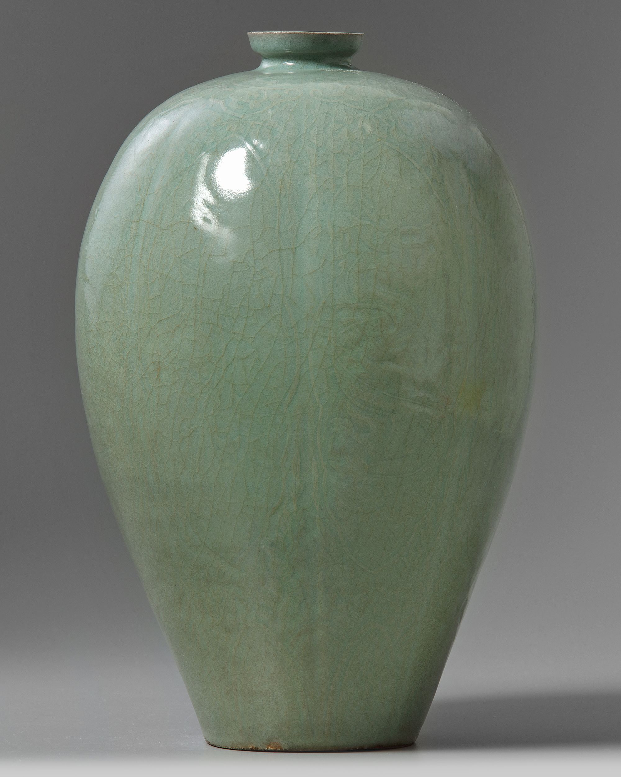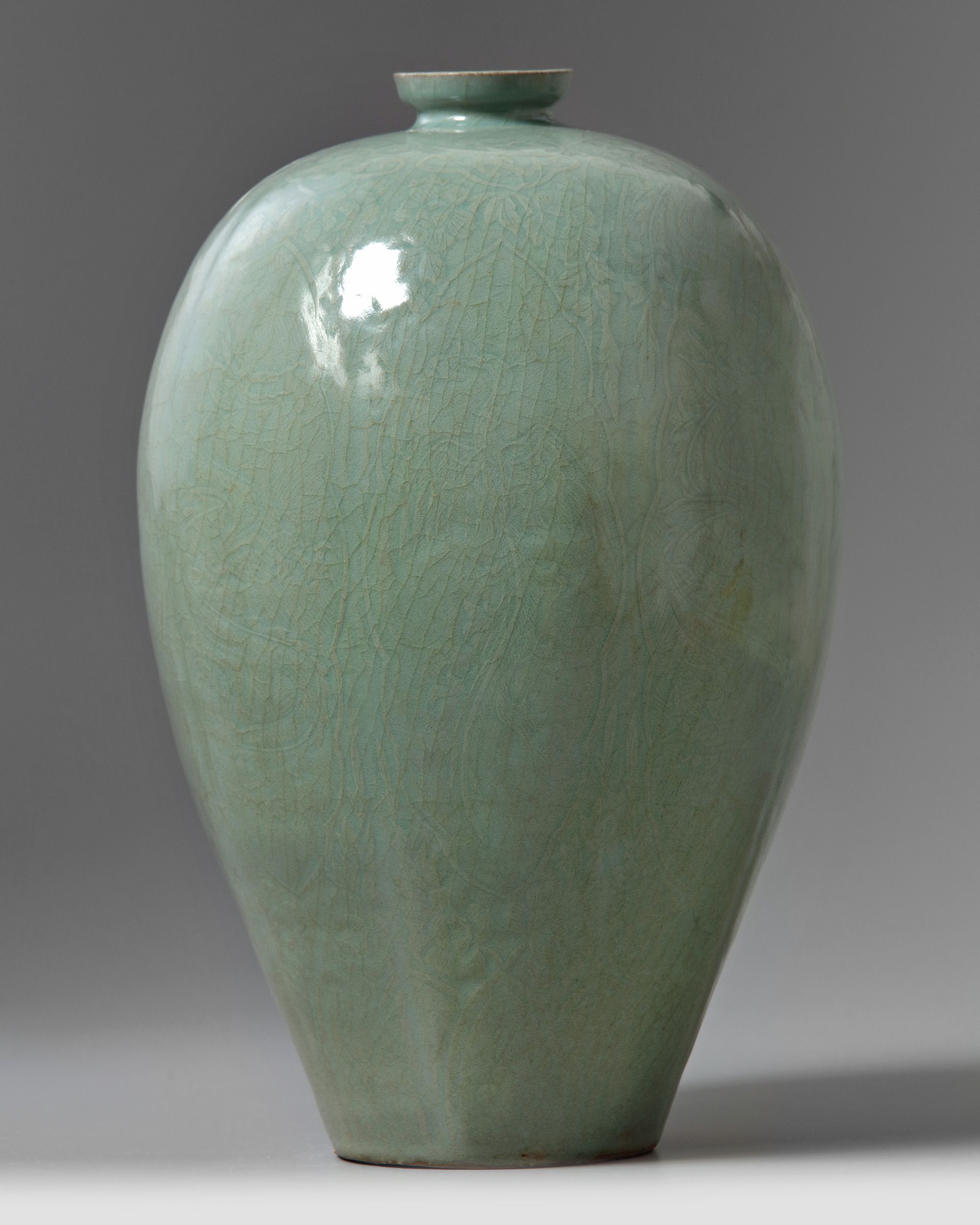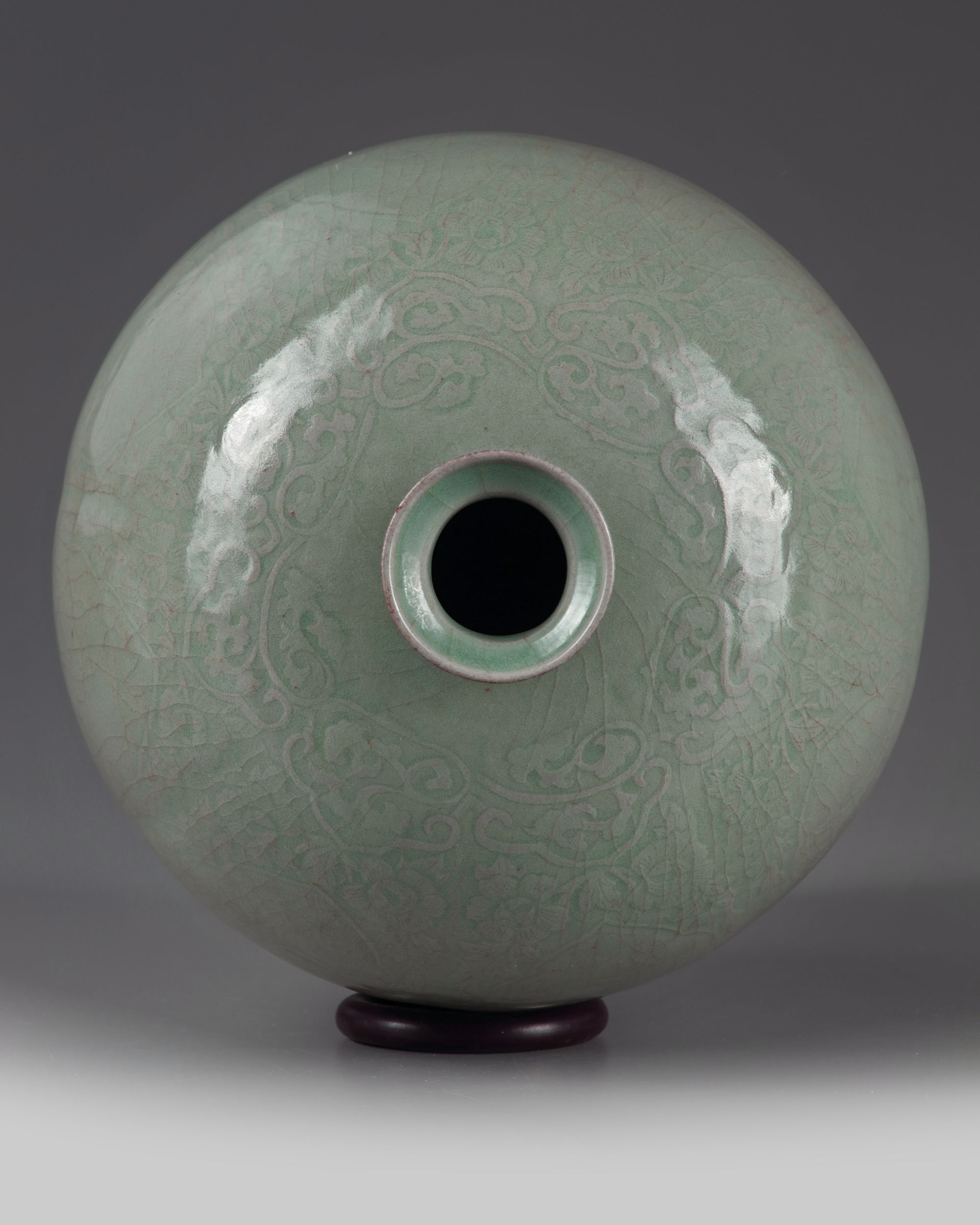 The vase is lightly lobed and finely decorated with carved design of foliate petals enclosing alternating dragons and phoenix, surrounded by flower scrolls, all below a ruyi-head to the rim and lappets to the foot. The vase is covered in a translucent bluish-celadon glaze with some fine glaze crackles.