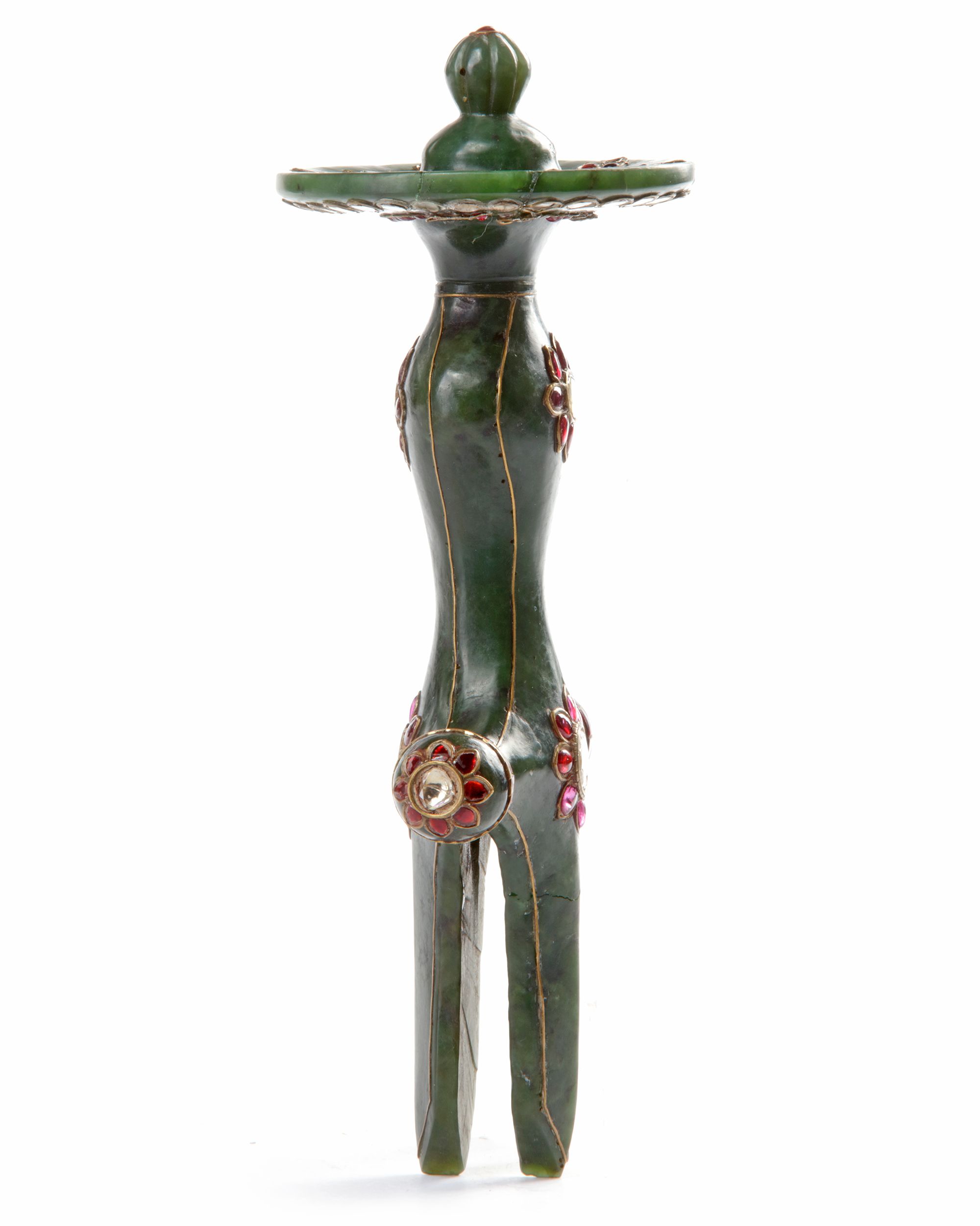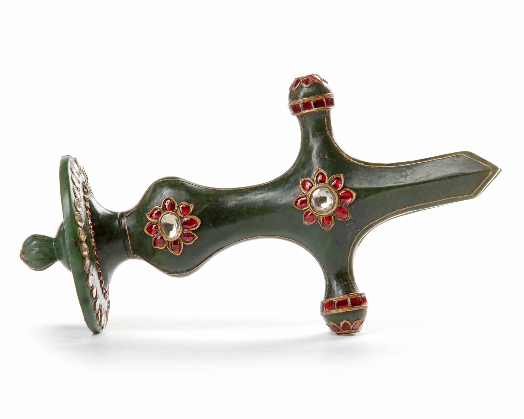 Of baluster form with broad crossguard, elongated forte, disc pommel and knop terminal, the green stone set with rubies and diamonds with flowering heads and vines framed by gold inlaid borders.