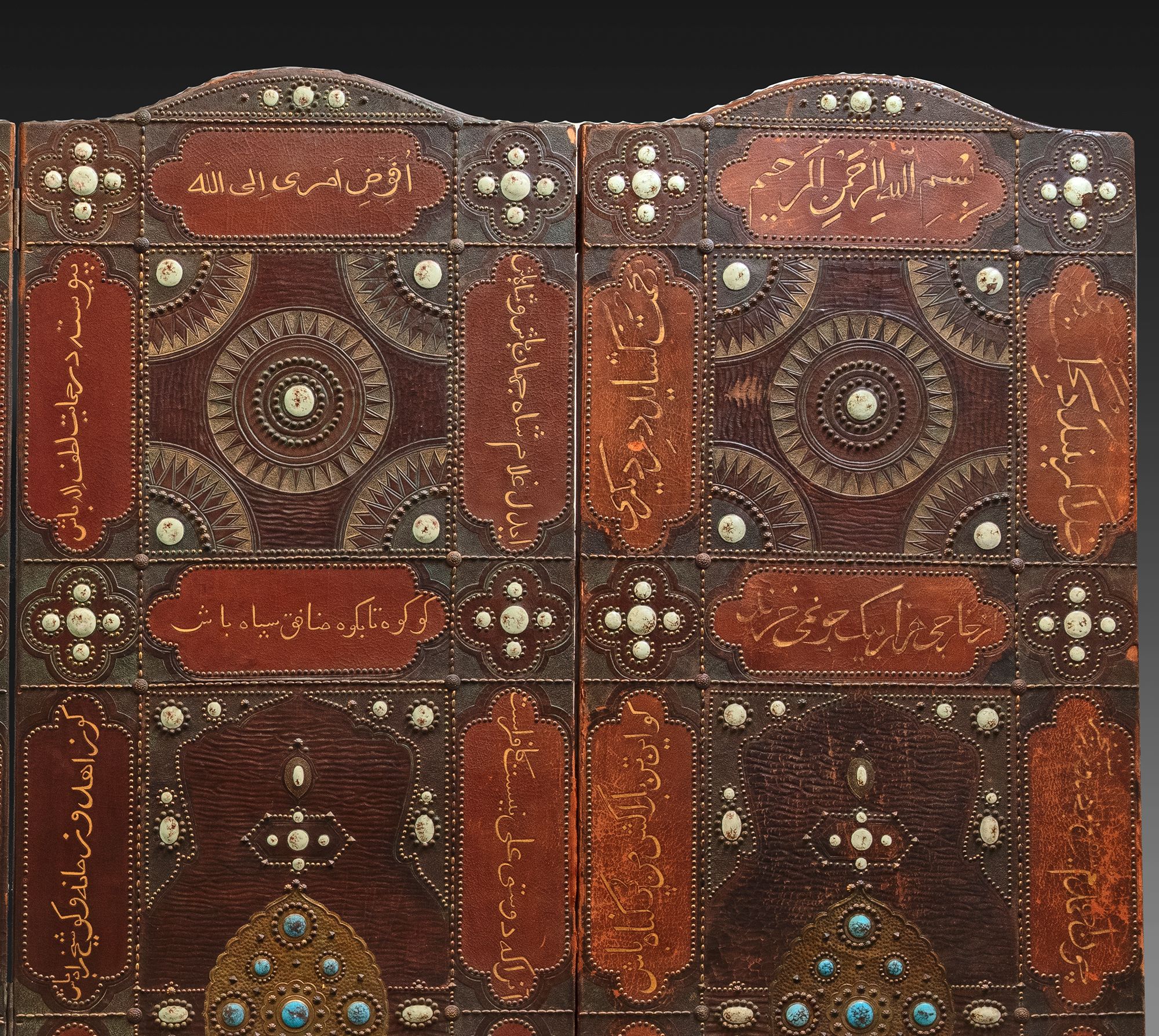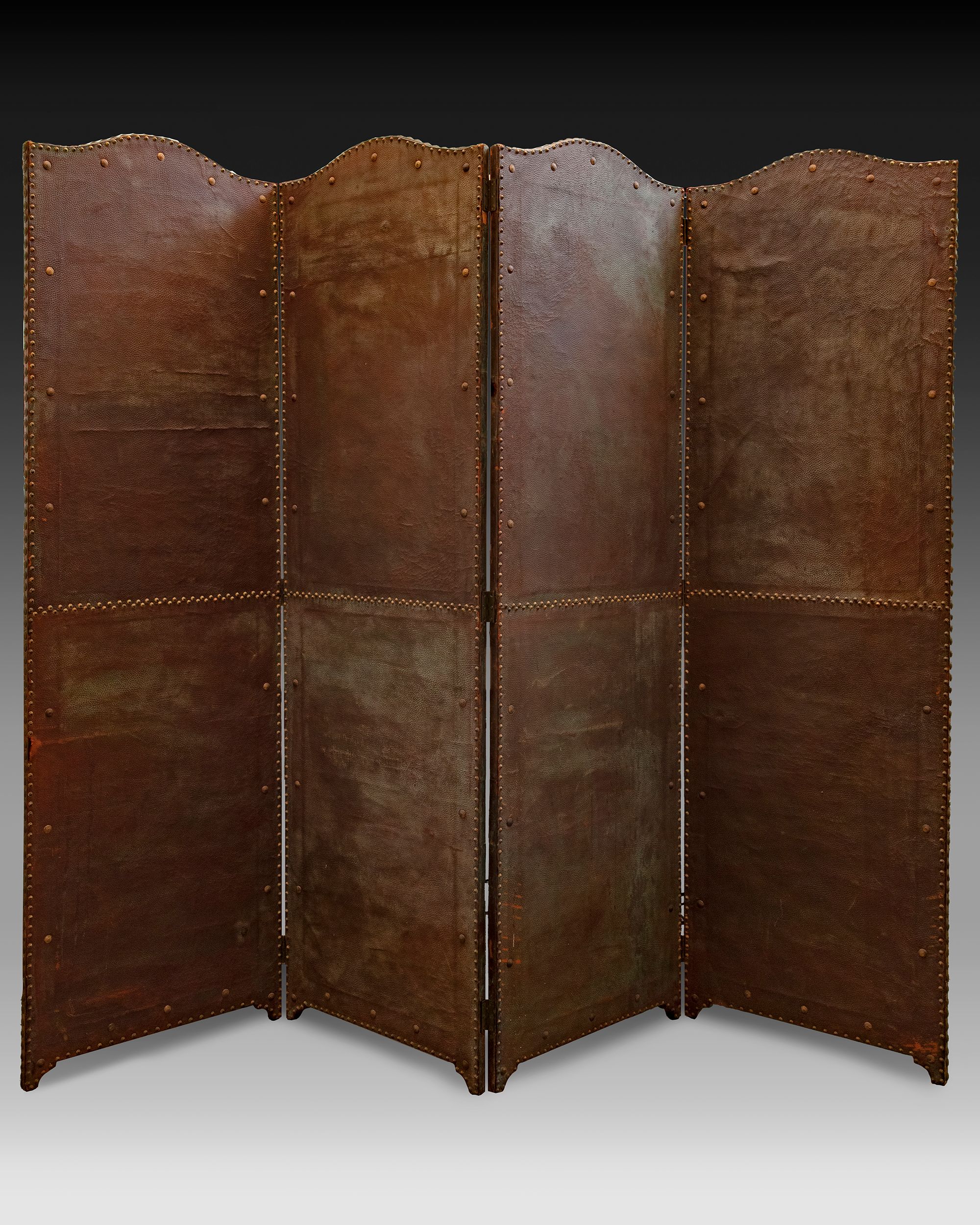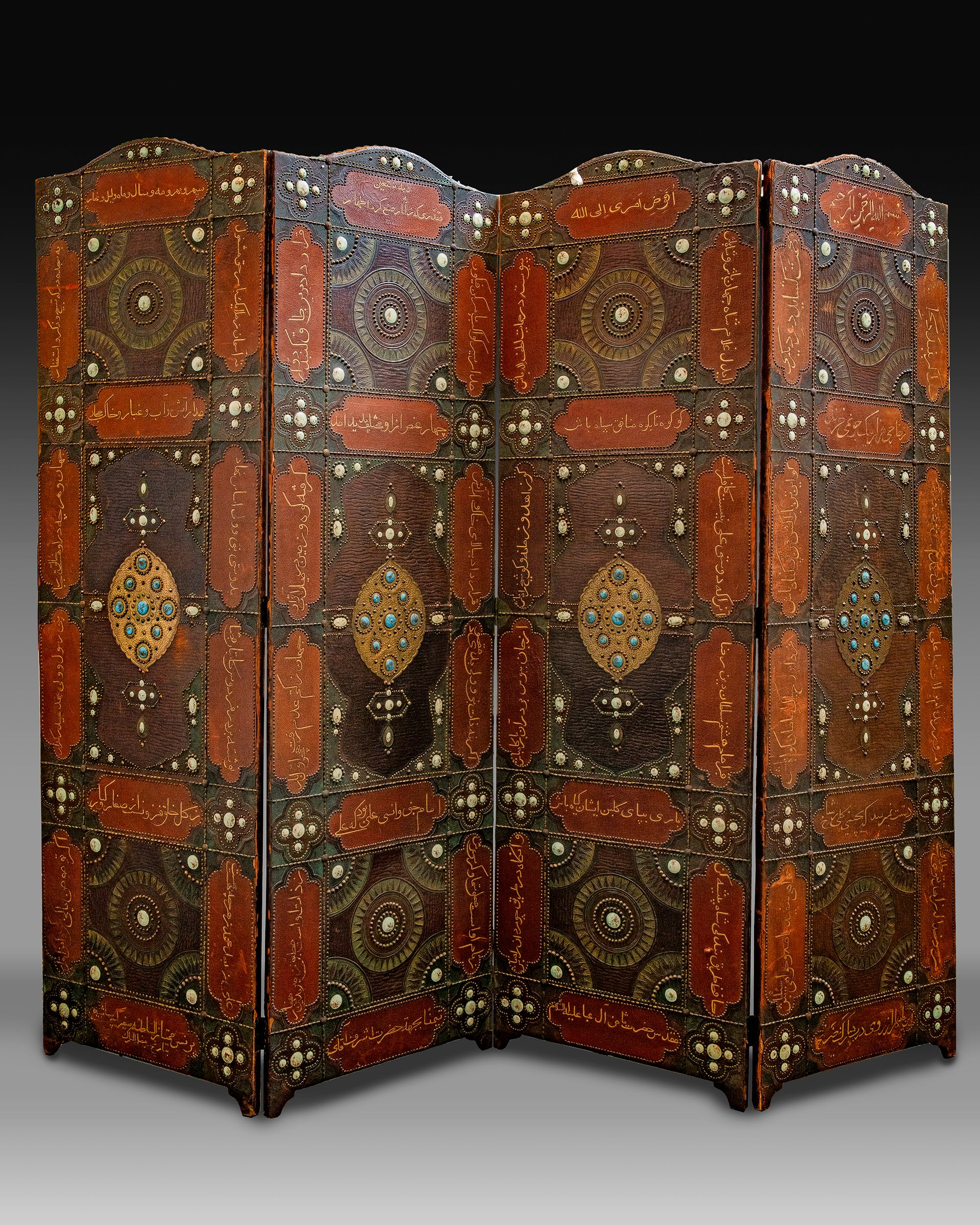 Leather screen with four panels, dated 1346 AH/1927-28 AD Each panel is adorned with an oval medallion inlaid with copper or enamel nails with appendages and spandrels, bordered by cartouches inscribed with famous Persian poems on the quality of Imam Ali and Imam Reza. The lower cartridges of each panel give this sentence: “This souvenir is the reproduction of the portal of the Mausoleum of Imam Reza in Mashhad, made for Prince Momtaz al-Saltaneh, the ambassador, by H. Prichet Delahaye, 1346 AH/ 1927-28 AD. Each panel: 199.5 by 60 cm. Formerly in the dining room of the Prince's Parisian house, "Samaddieh".