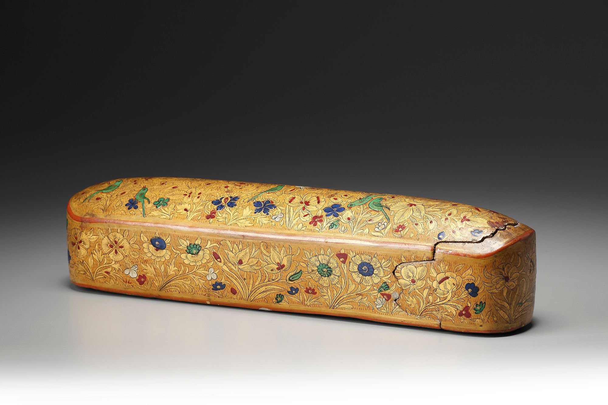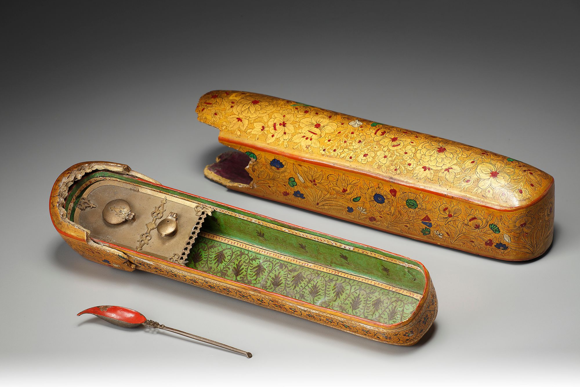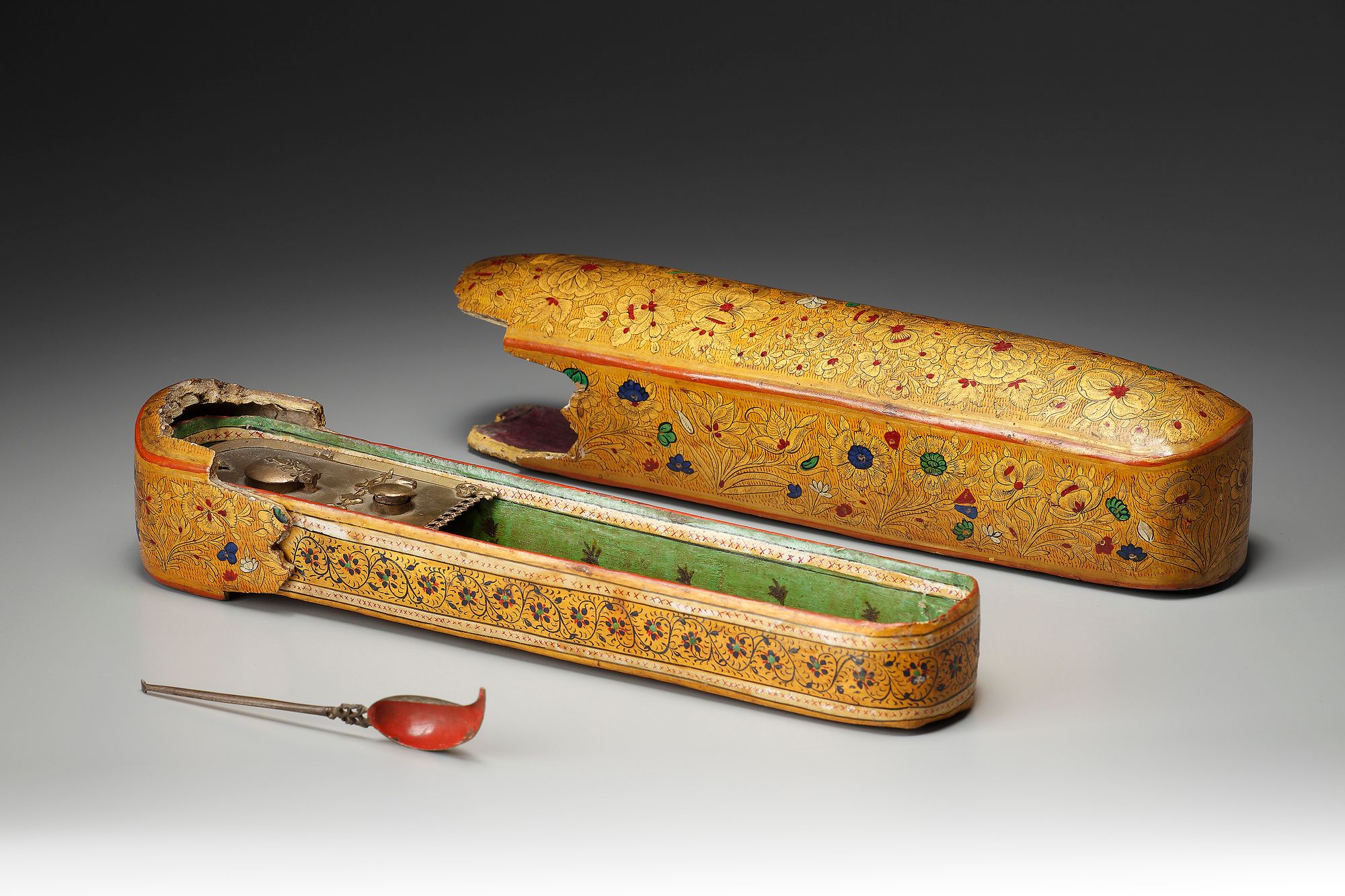 صندوق كشميري مزخرف على شكل محفظة قلم -من القرن التاسع عشر شمال الهند مزخرف بأزهار مذهبة يحتوي على علبة حبر و ملعقة بودرة
