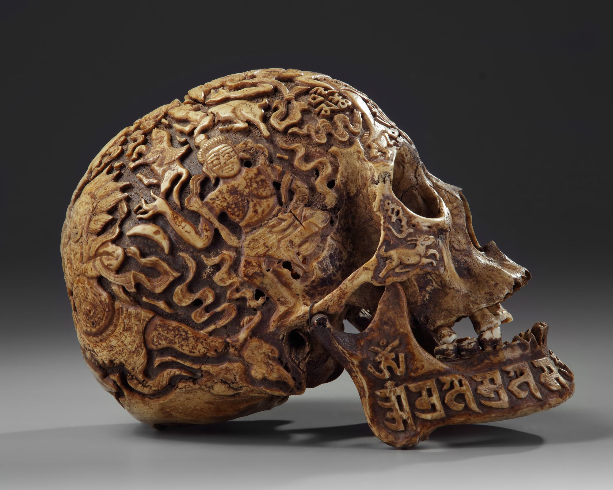 An engraved human skull from Tibet. The carvings are said to be done to take a curse off a family or to guide the soul of a mislead human on the right path to enlightenment.