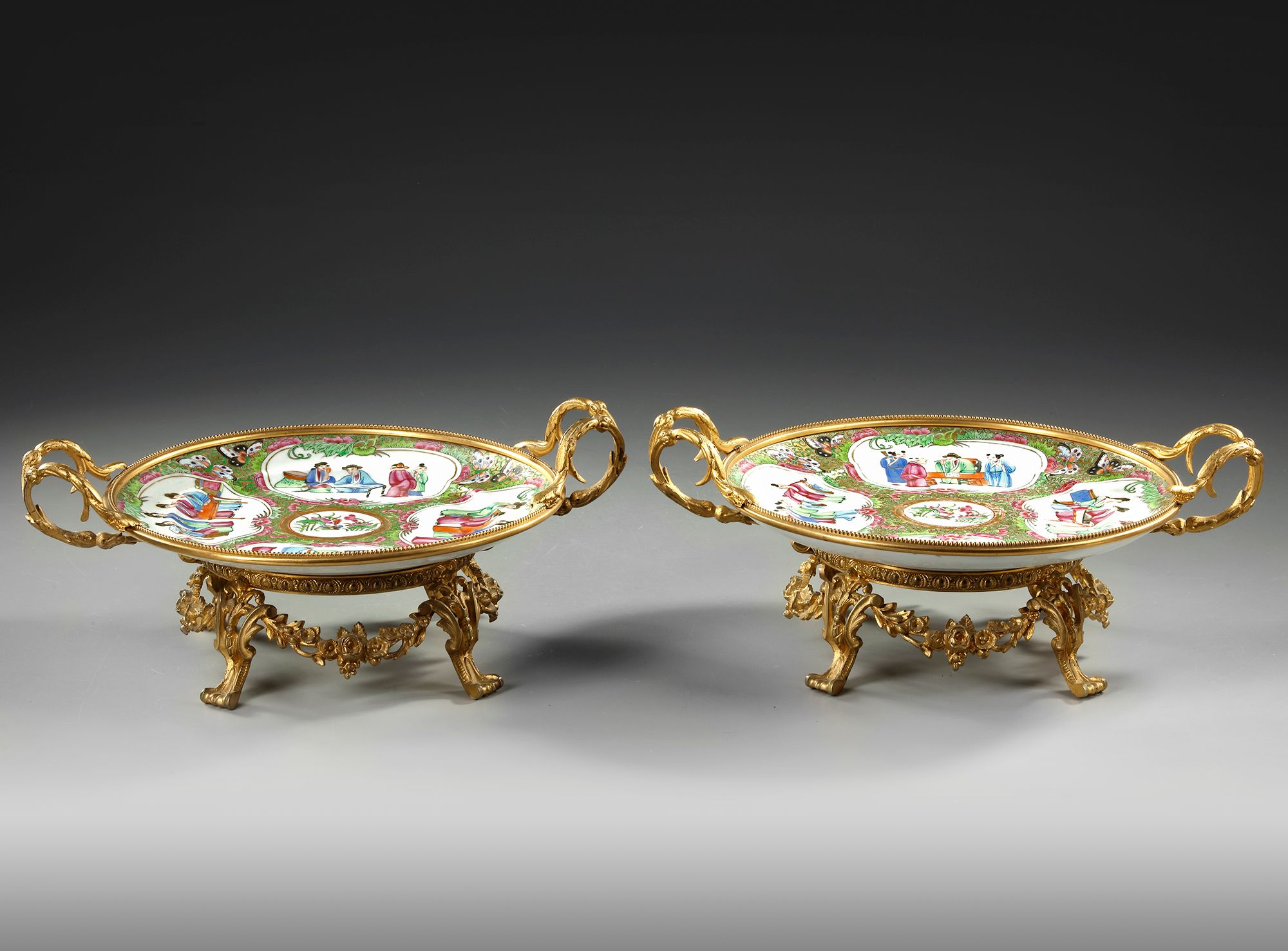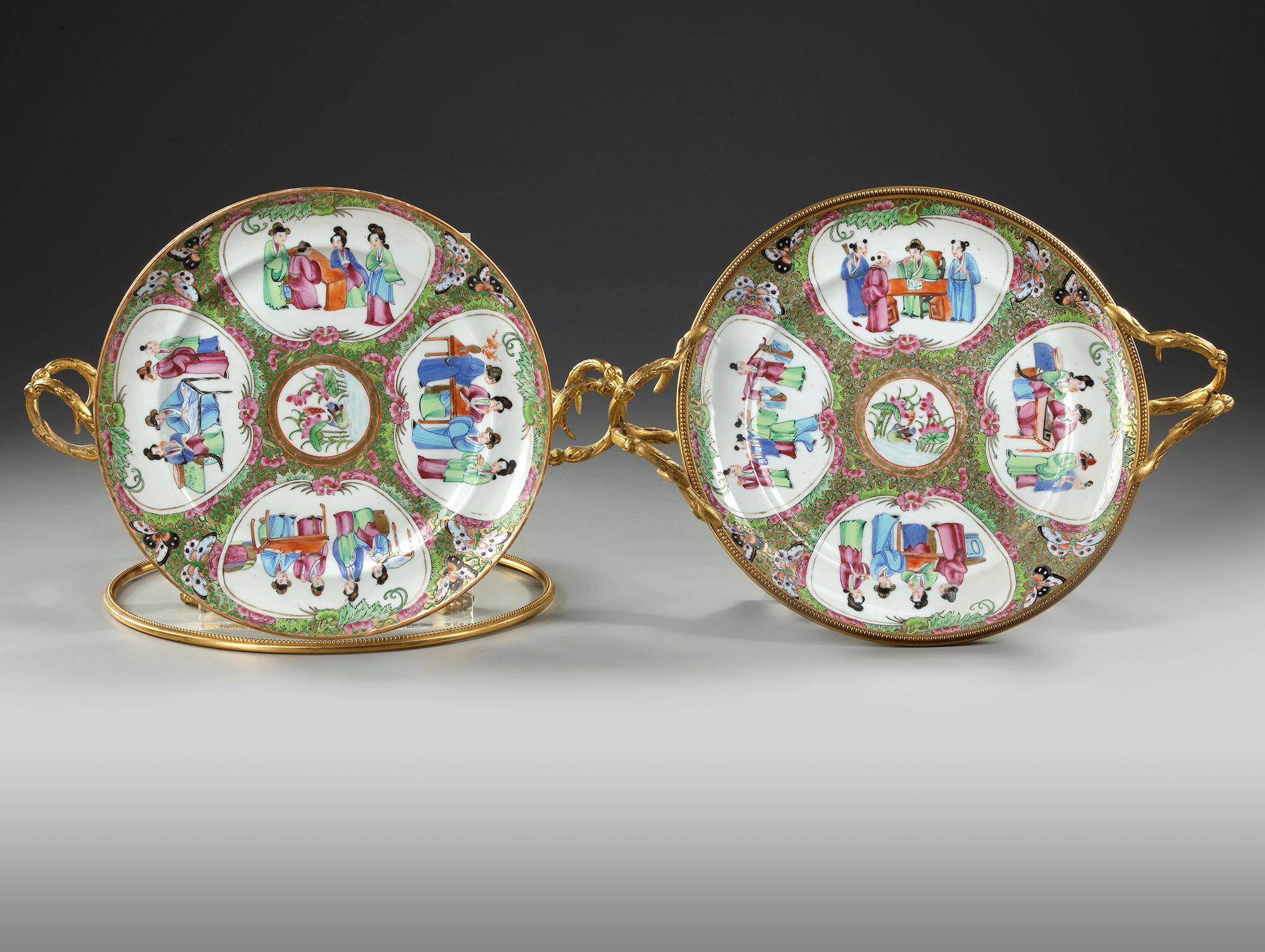 A pair of plates with base in gilt bronze, 20th century . H 13 cm. D 25 cm.