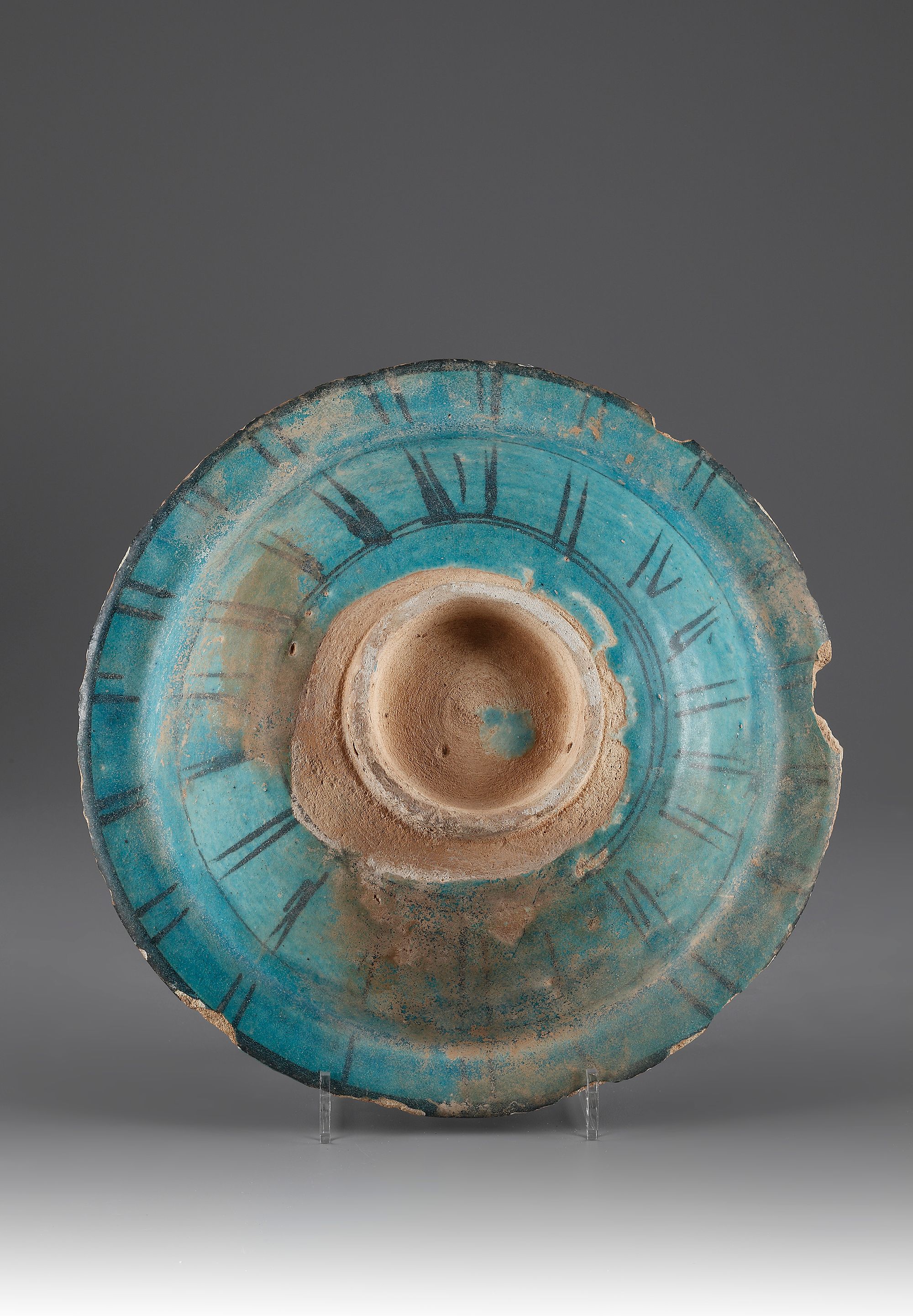 يستند على قاعدة صغيرة ، مزخرف باللون الأسود على خلفية تركوازية تتضمن دائرة تحتوي أزهار ،يحيط بها إطار من الورق أما الجزء الخارجي فيتضمن خطوط سوداء