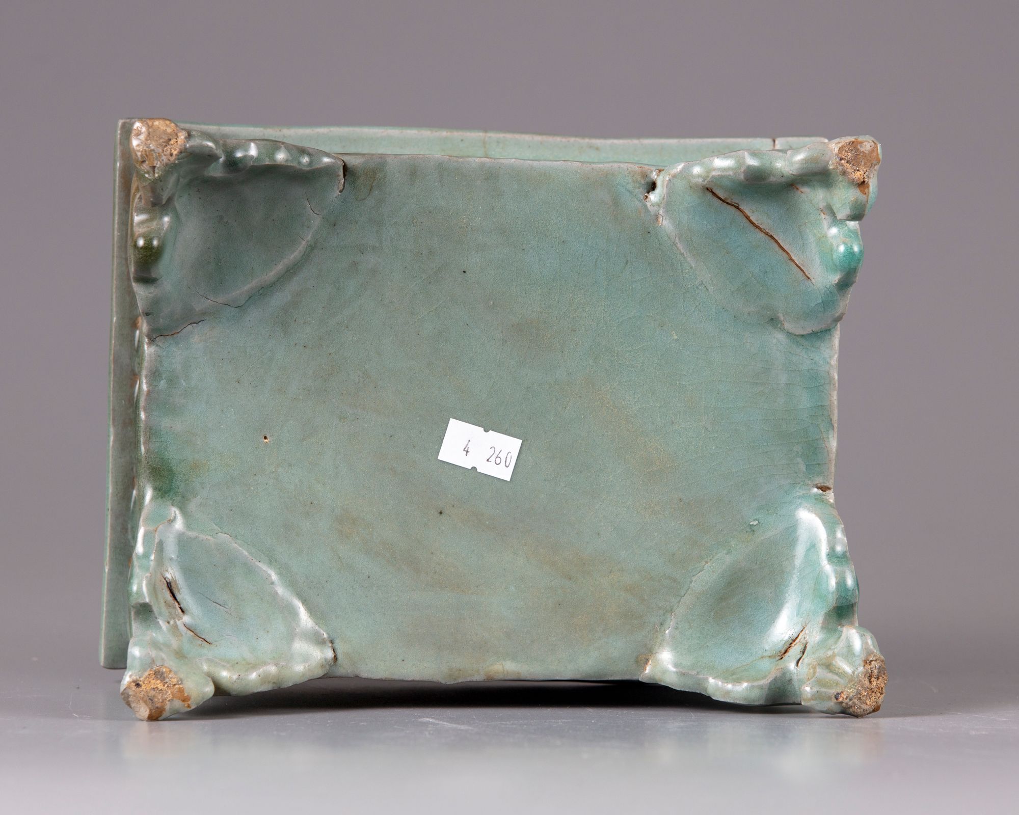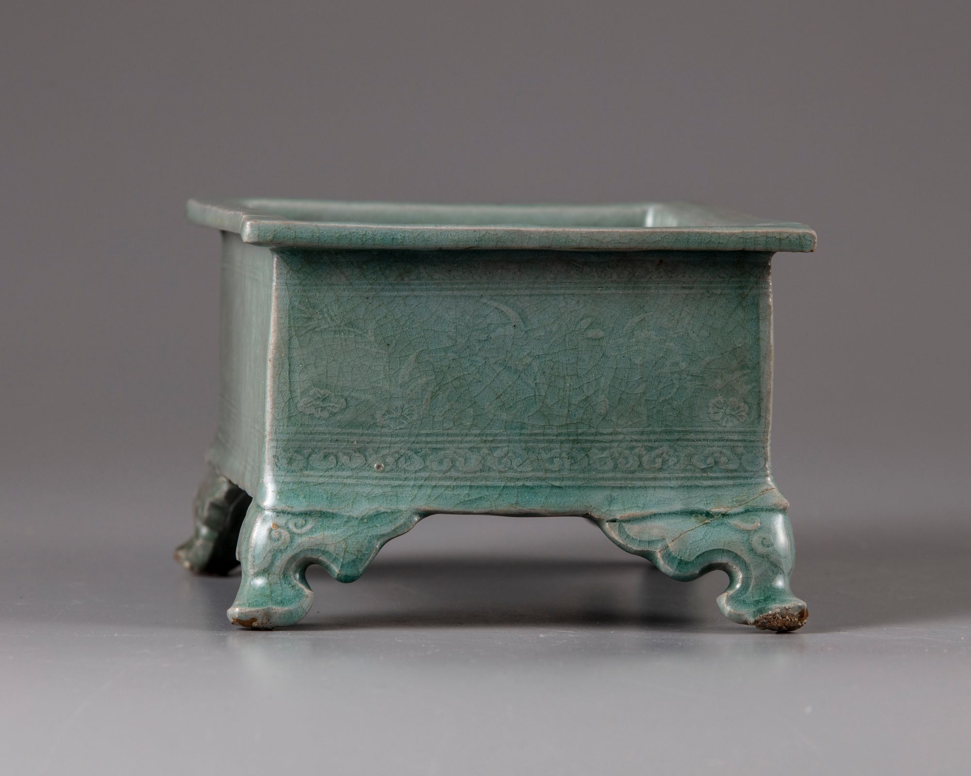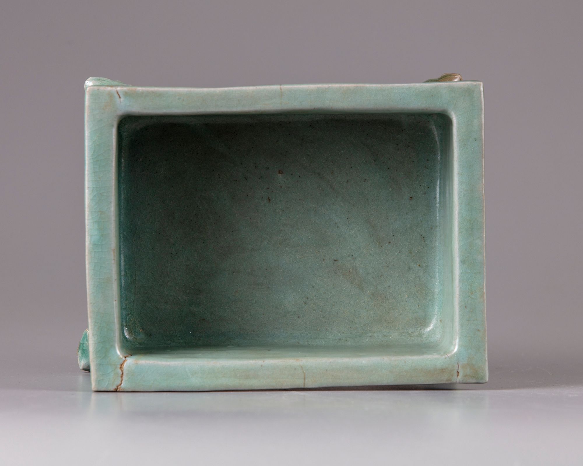 The recatangular censer with deep sides and an evereted rim, standing on leaf shaped feet.