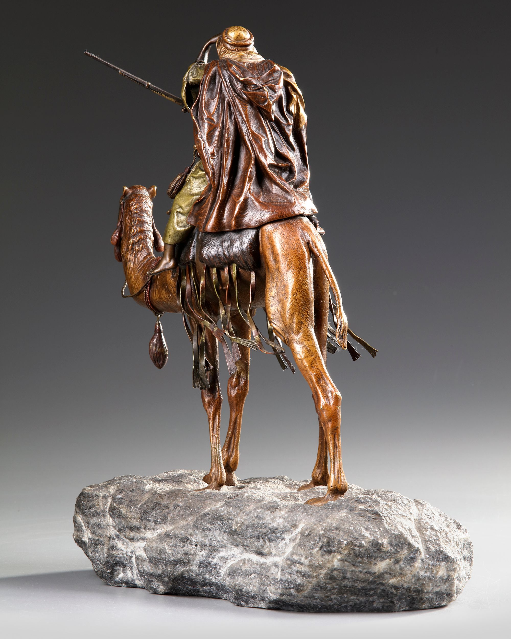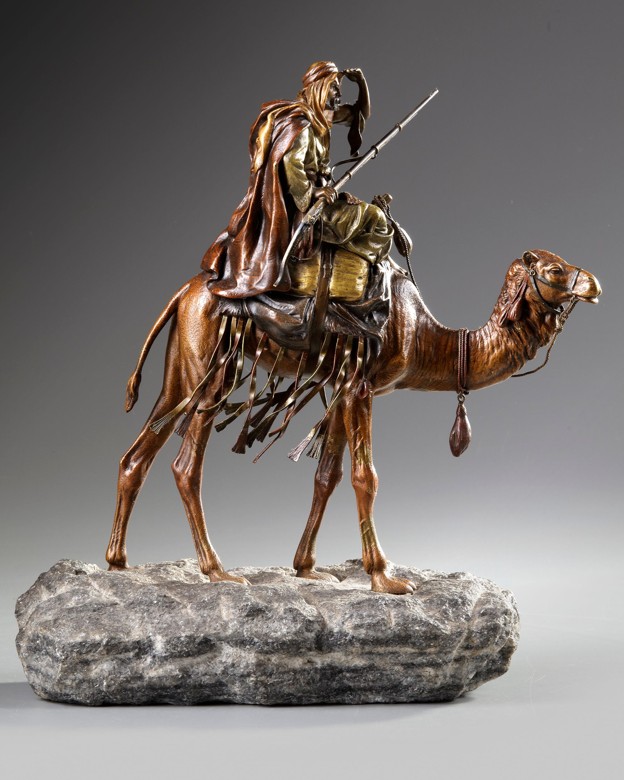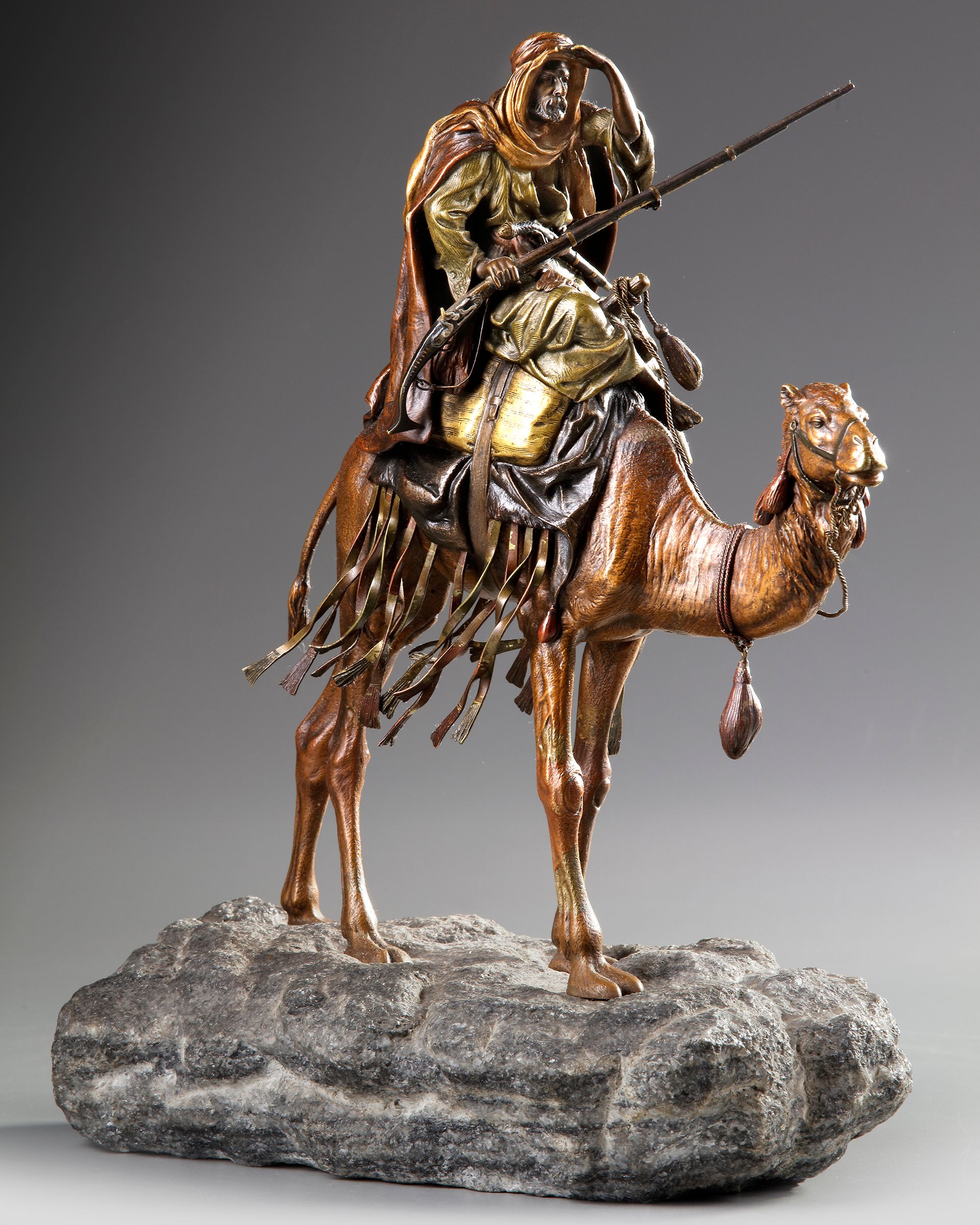 An impressive statue by BERGMANN, the arab hunter on his camel. Cold painted Vienna bronze, warm color, very beautiful chasing bronze, the statue standing on a granite base. Franz Xaver Bergmann (1861 – 1936) was the owner of a Viennese foundry who produced numerous patinated and cold-painted Oriental bronzes, erotic and animal figures, the latter often humanized, or whimsical humorous objets d'art. Signed: tummy of the camel. In a perfect condition. H. 35 cm.