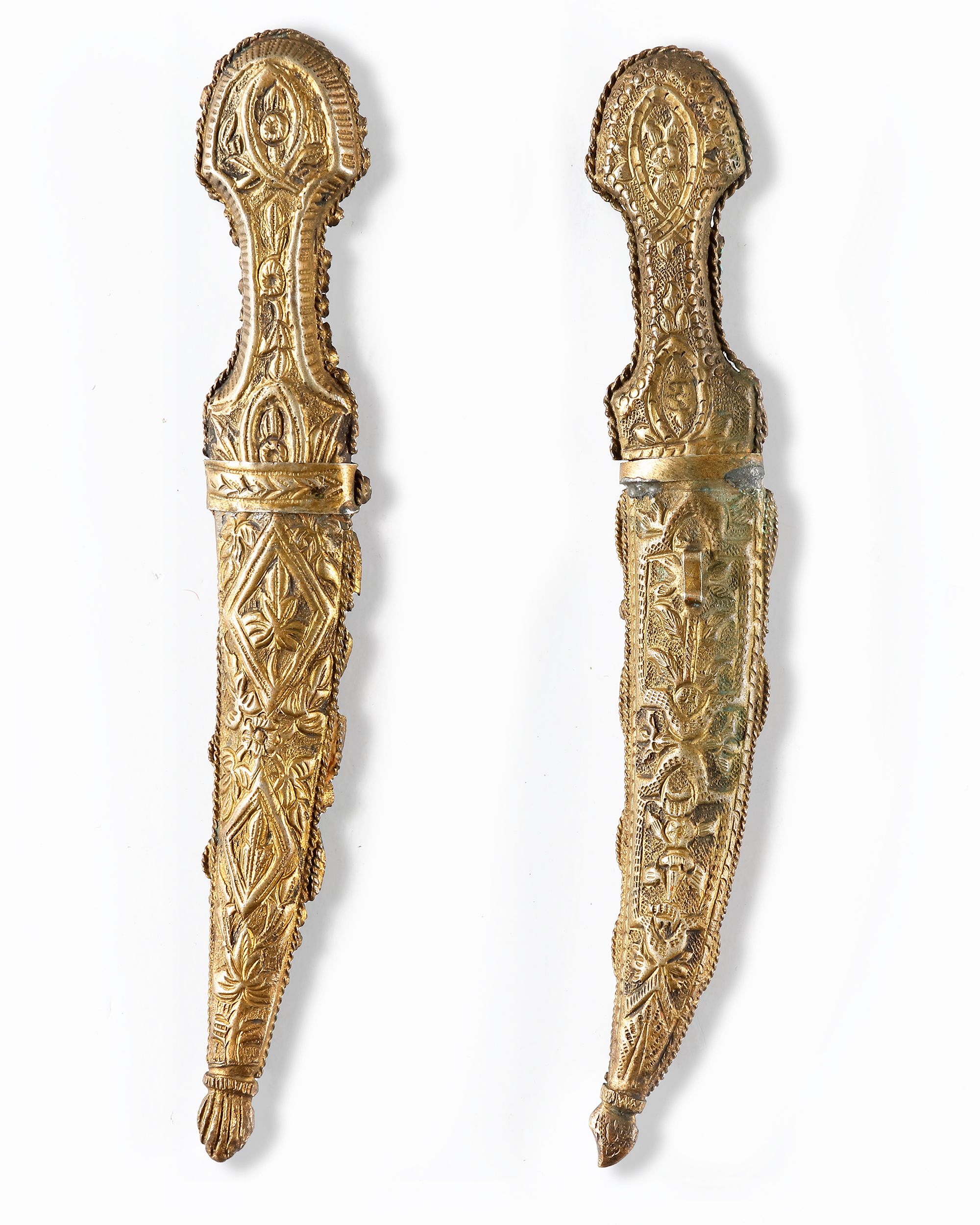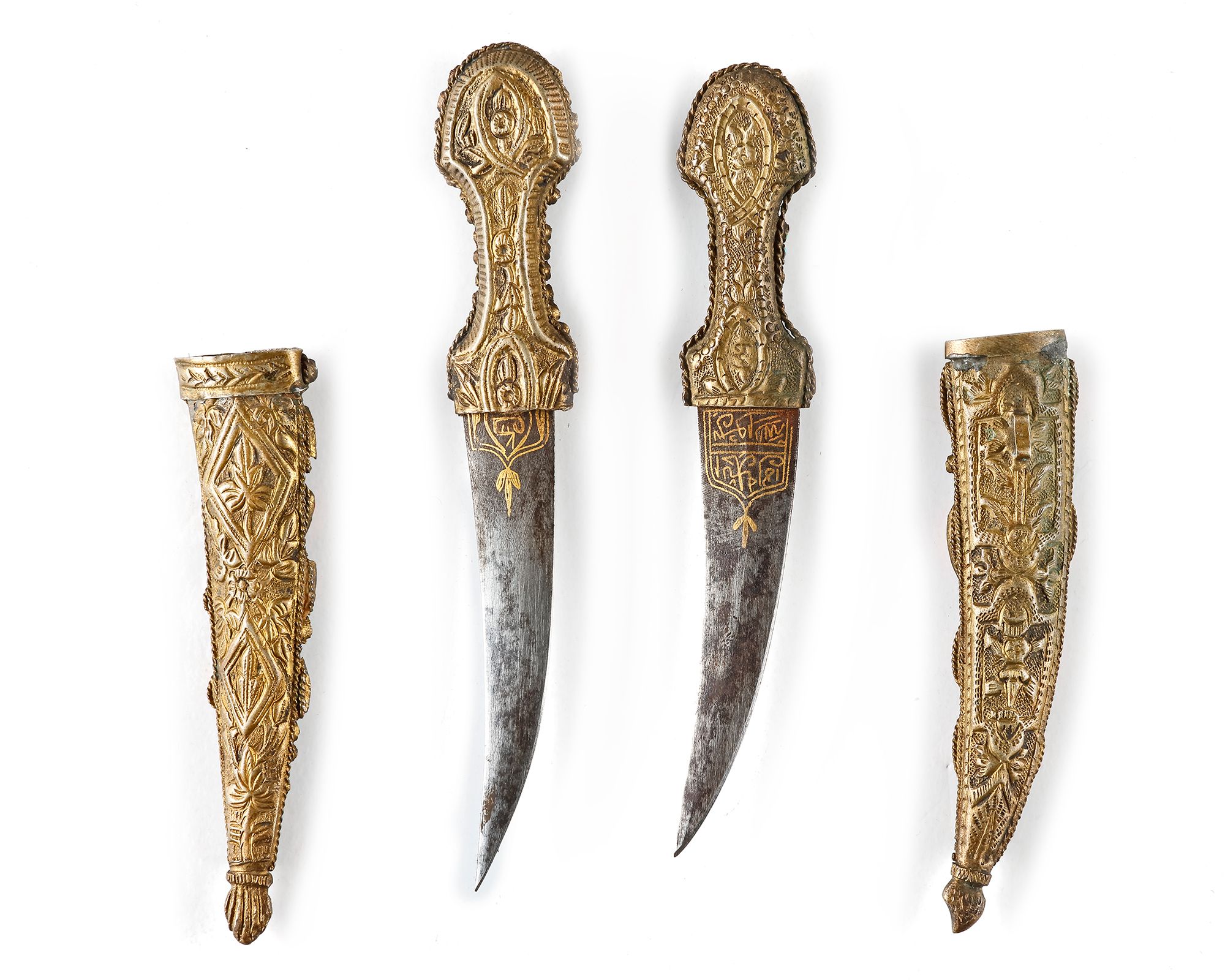 The slightly curving upward tapering blade with a central gutter, the gold-damascened forte with an inscription and bands of floral arabesques, the hilt and scabbard with abundant coral and turquoise insets geometrically arranged, the reverse with silver repousse with fine floral sprays. 15 cm.