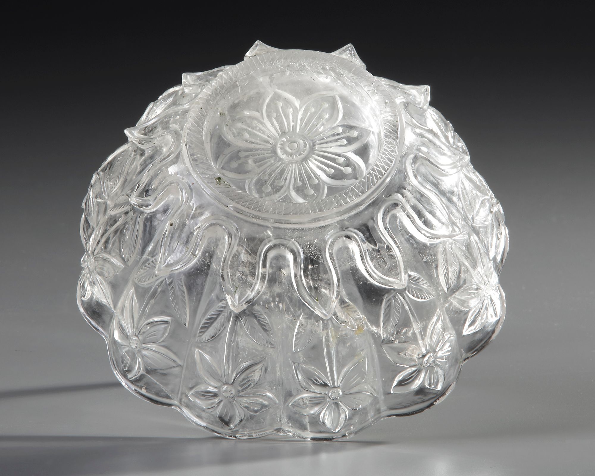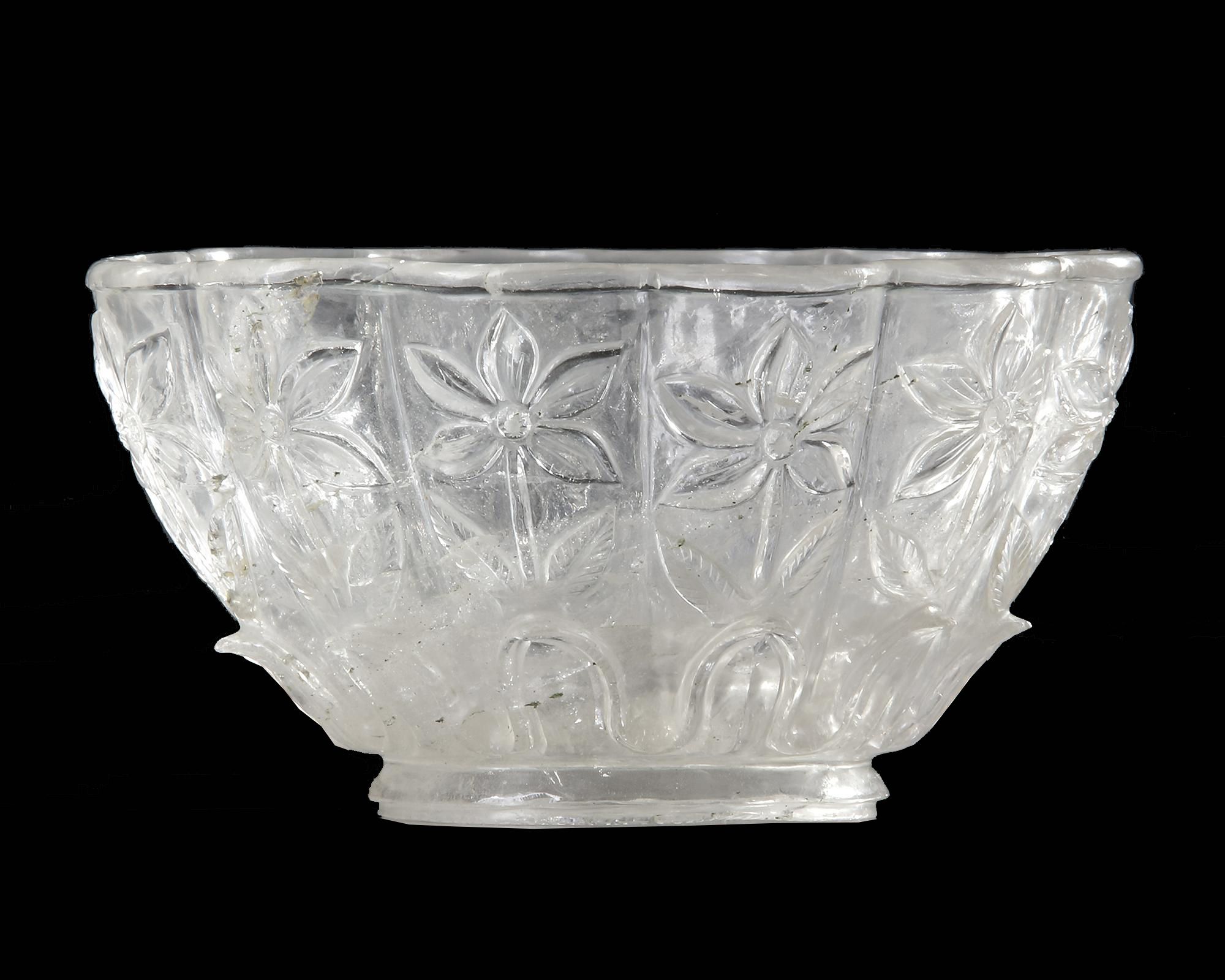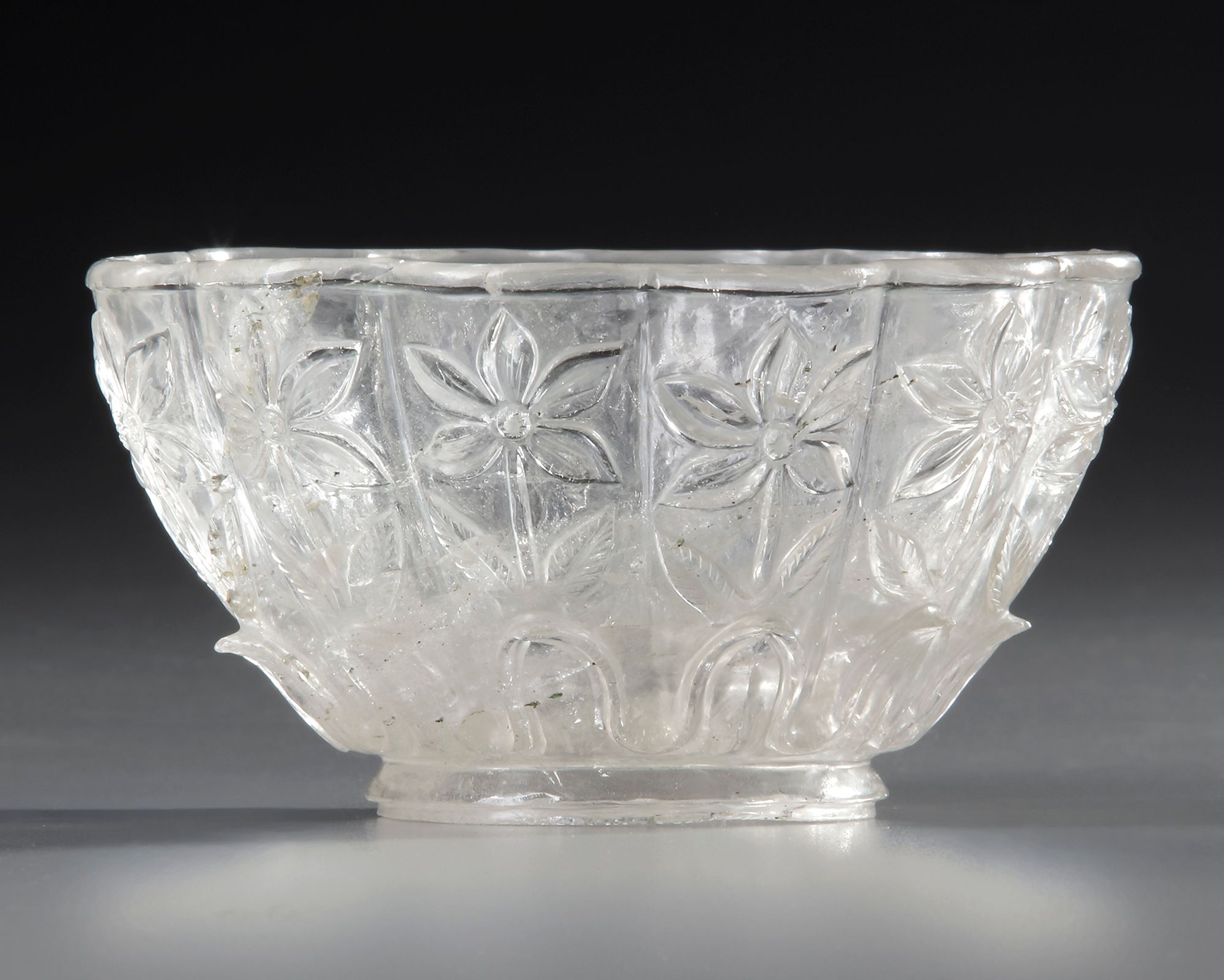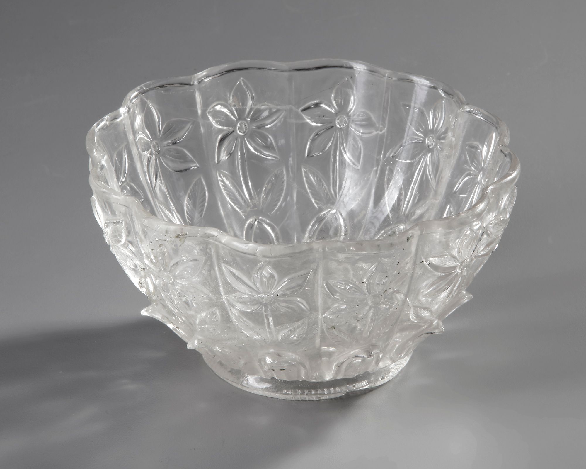 A bowl with a slightly flared rim, fashioned in rock crystal, with a smooth, polished interior and a flower and foliage design carved in relief and polished around the outside.