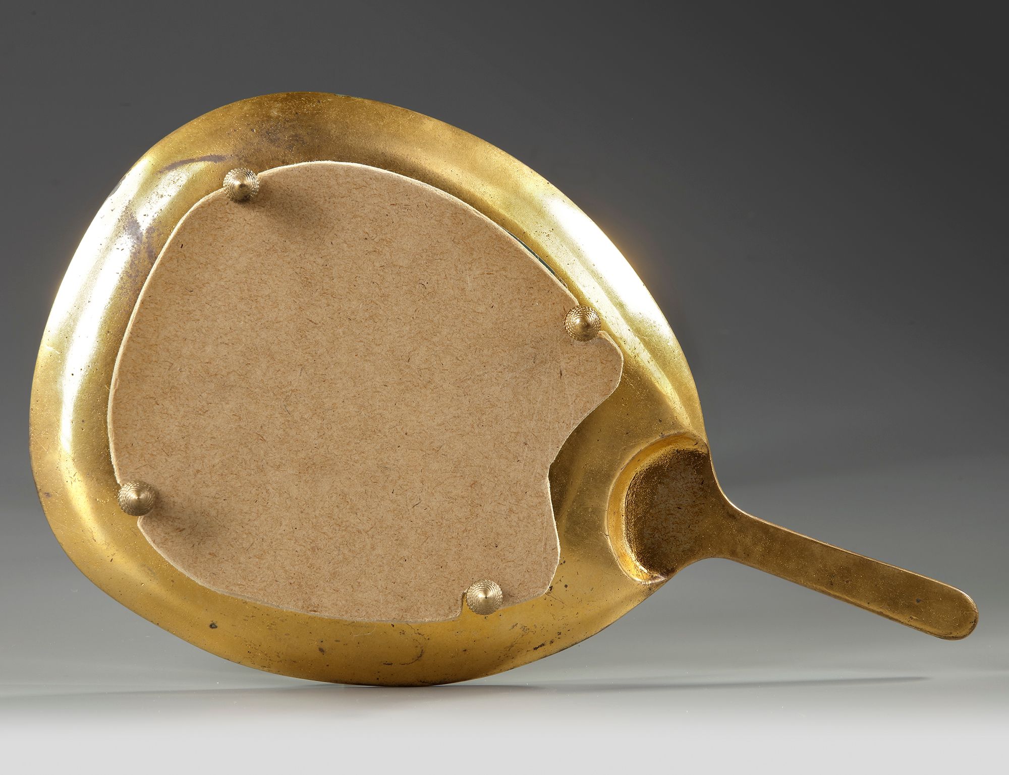 A gilt and enameled hand mirror, 19th century Napoleon III style. In a perfect condition. H 31 cm.