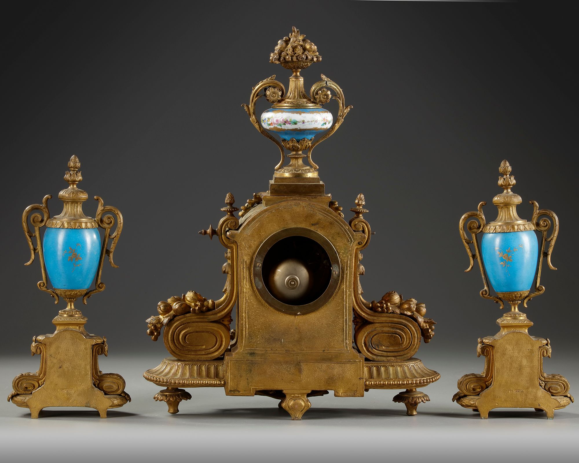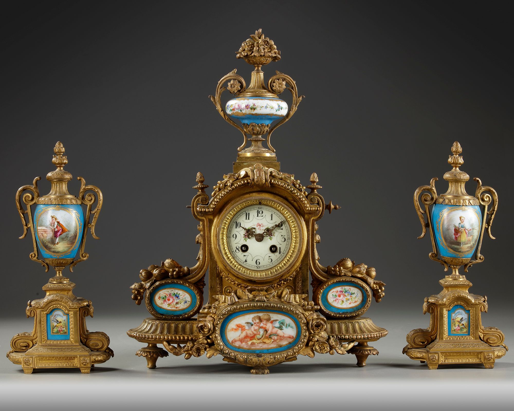 Three pieces gilt 'Spelter' and 'Sèvres' porcelain clock set, the clock with a floral painted porcelain urn surmount on a stepped arched case over a floral painted porcelain dial, flanked by applied leaves and flowers on the sides, above a painted porcelain plaque with figural and landscape decoration. With pair of matching porcelain urns. Epoque Napoleon III. 19th Century. H 44 cm. - H 32 cm.